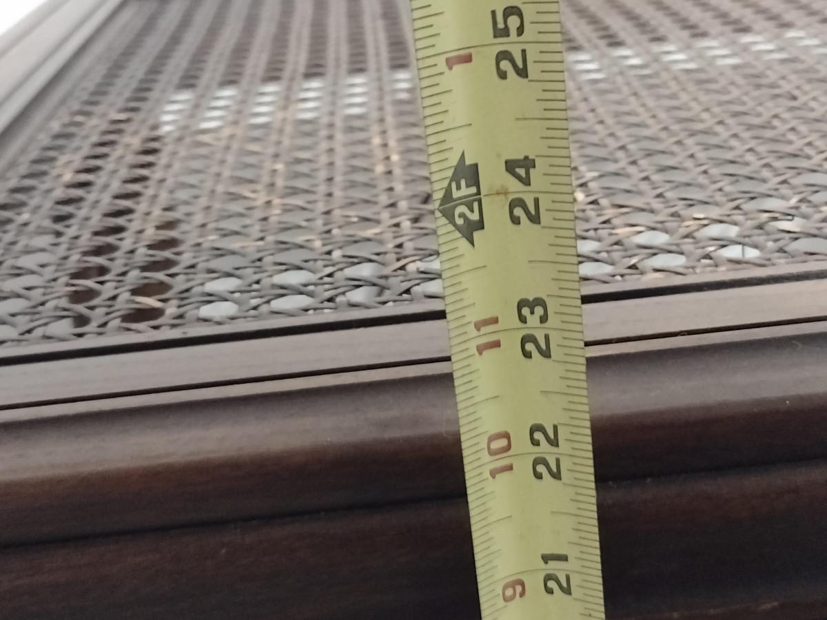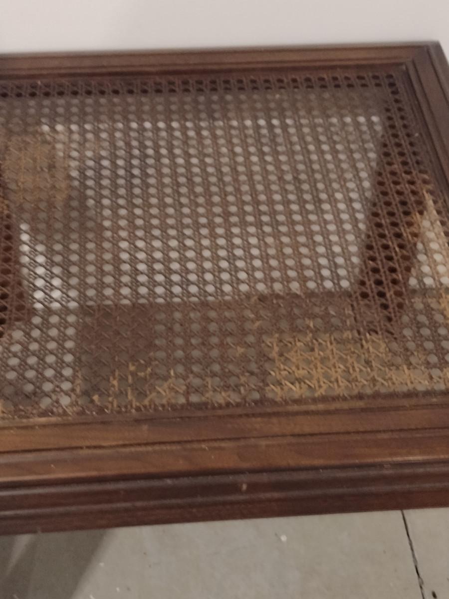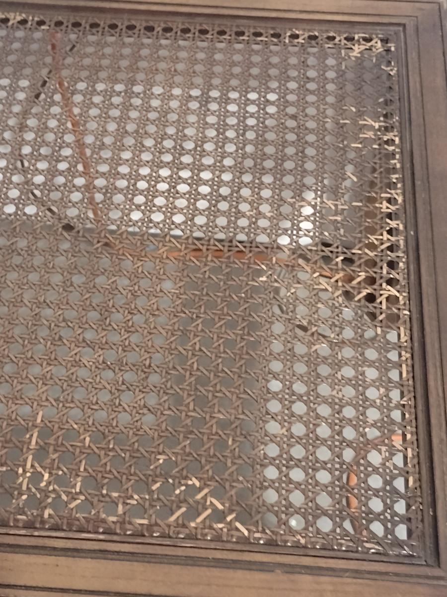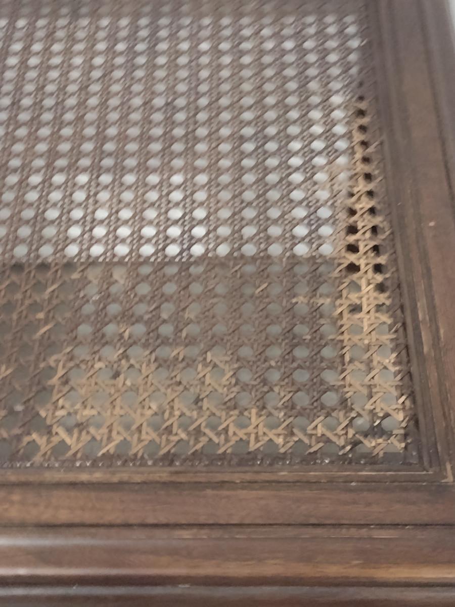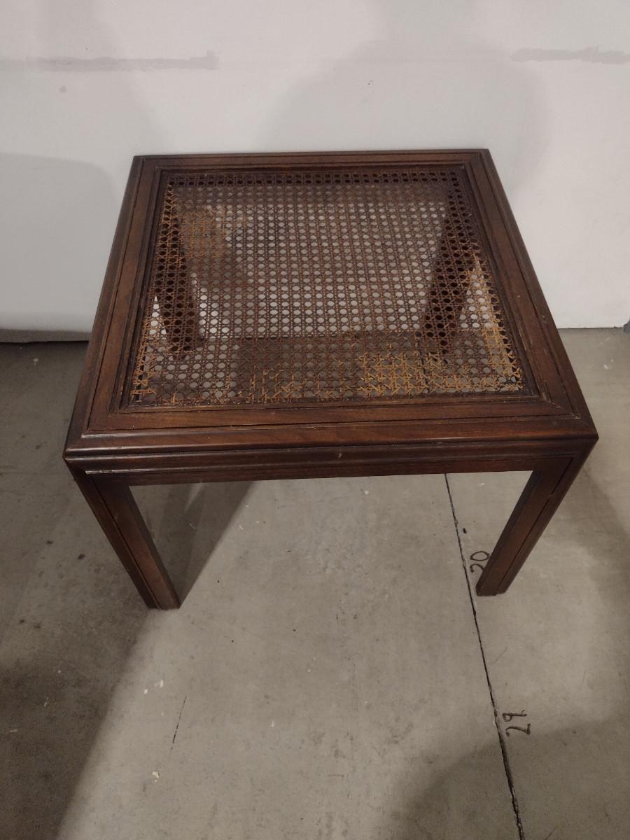 Pair of Wooden Side Tables with Woven Cane Tops. Please see all pictures- some discoloration to finish.