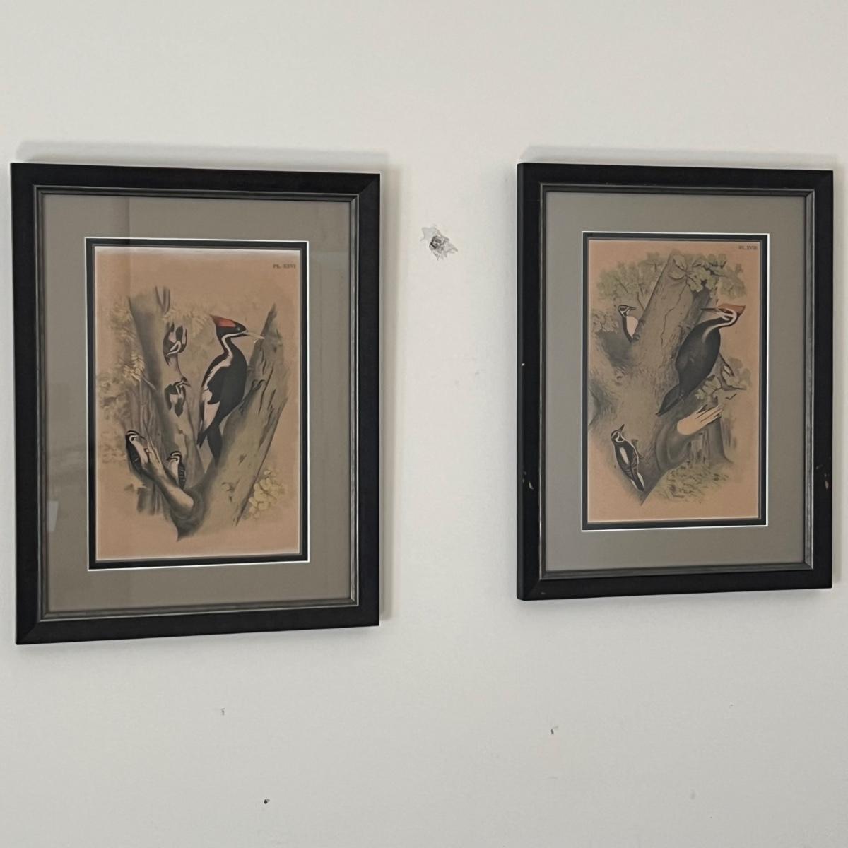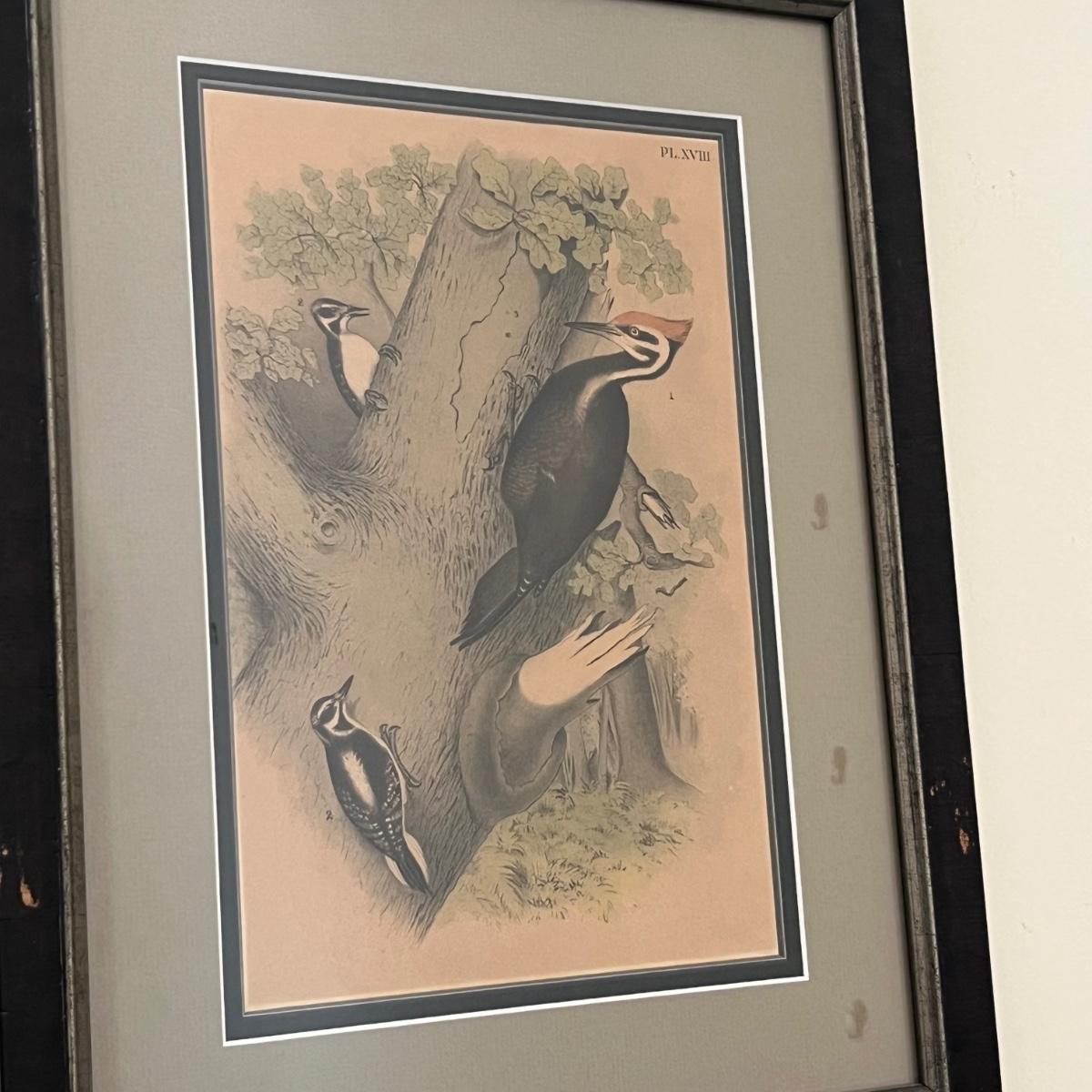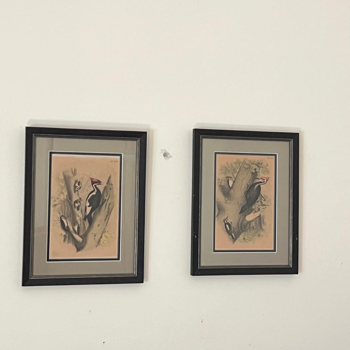 These two Pileated woodpecker prints are matted and mounted under glass in matching wooden frames. There are a couple of scratches in the one frame, shown in images.