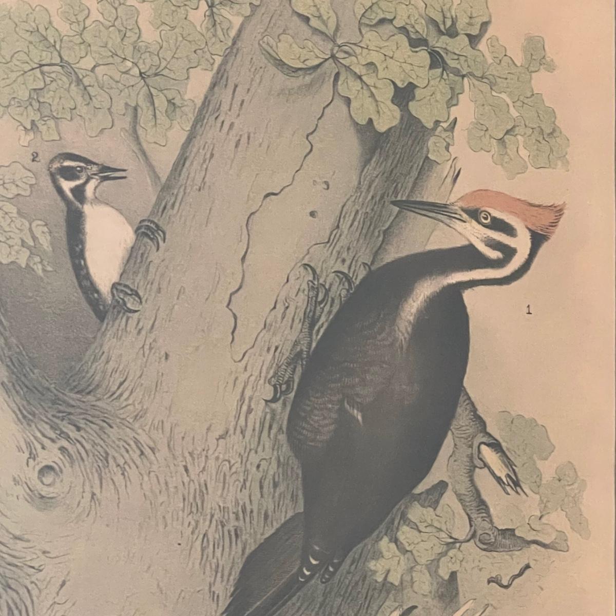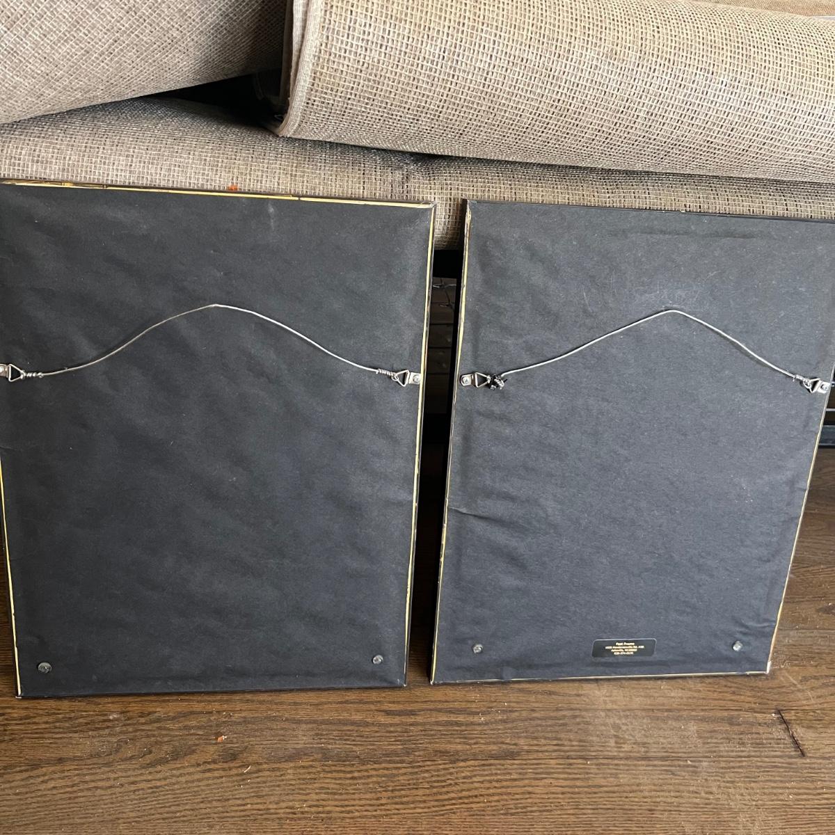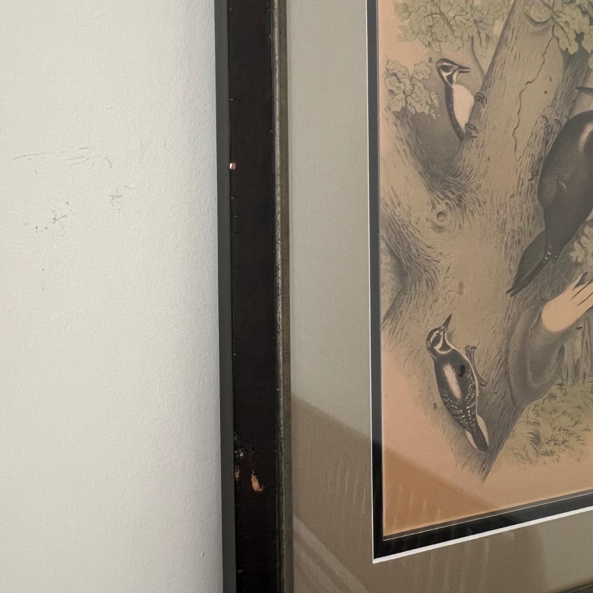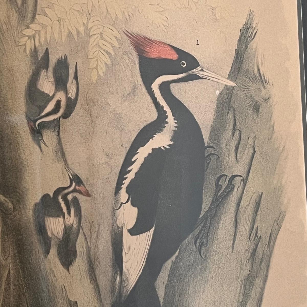 These two Pileated woodpecker prints are matted and mounted under glass in matching wooden frames. There are a couple of scratches in the one frame, shown in images.