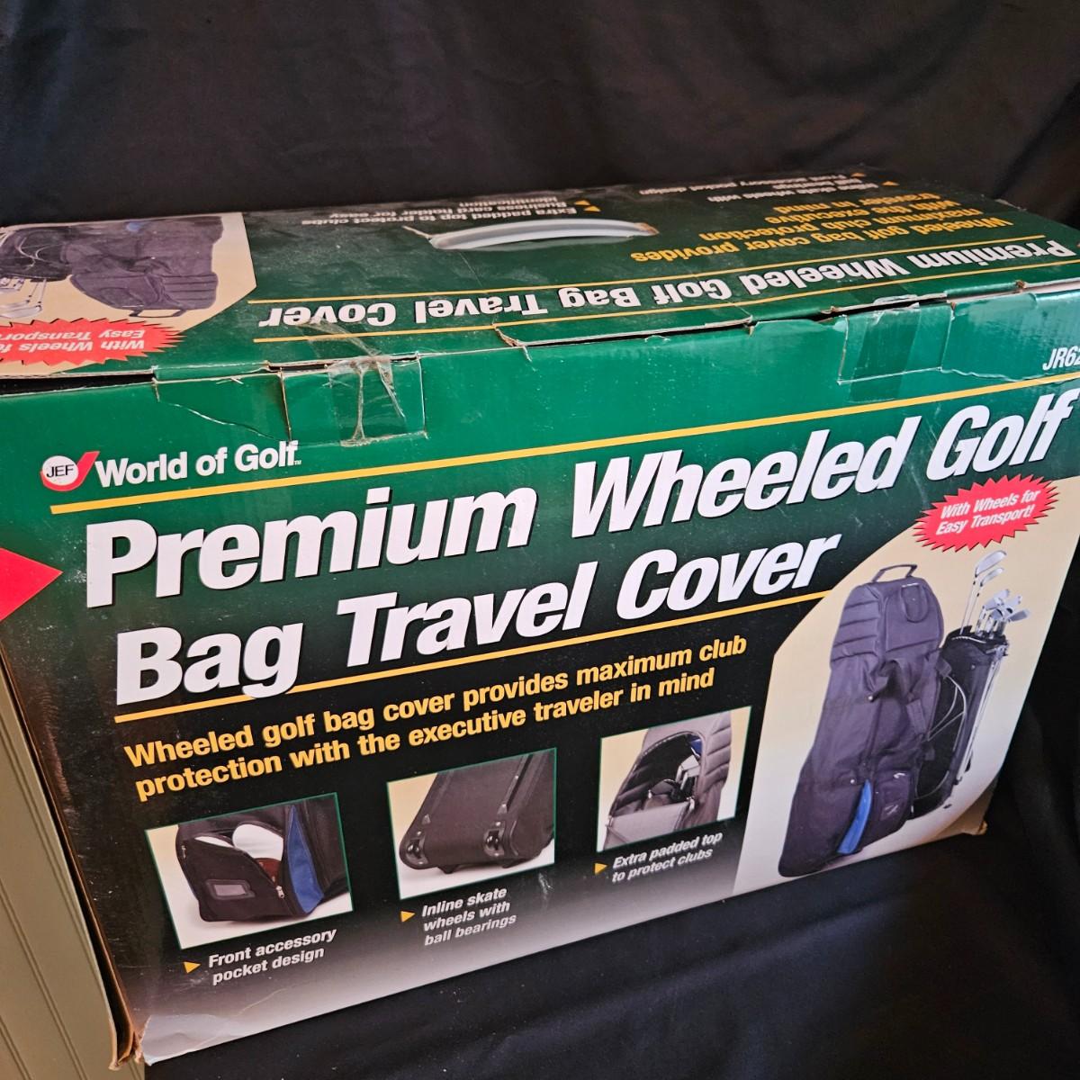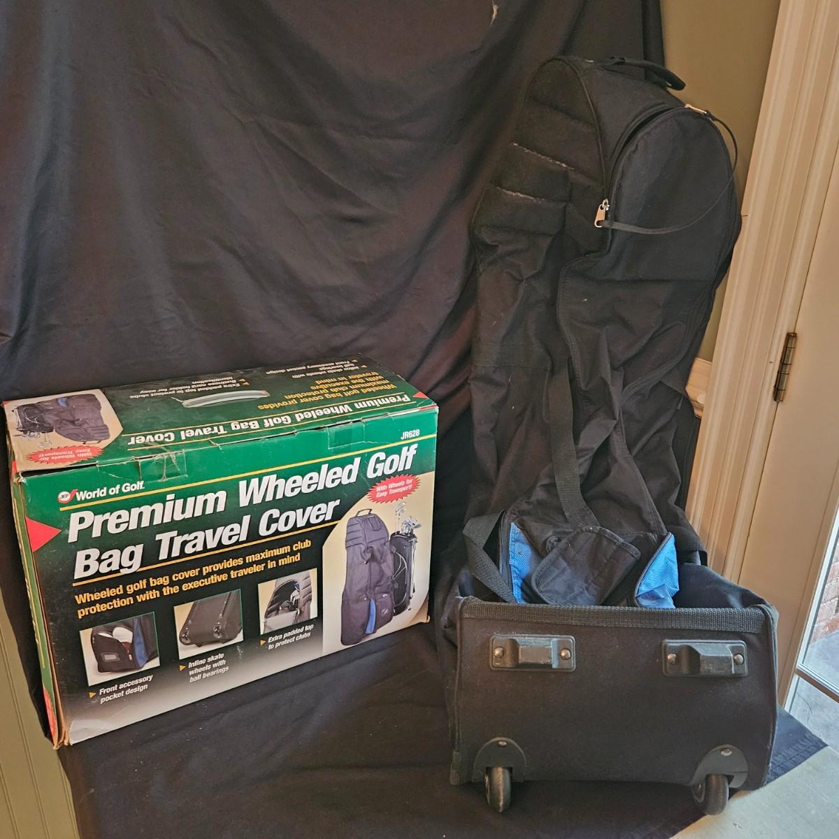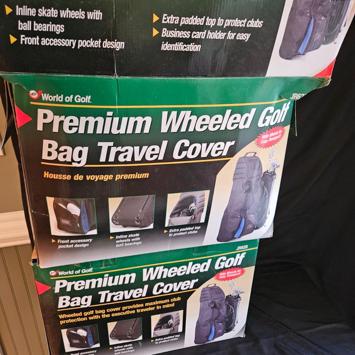 A pair of World of Golf wheeled golf bad travel covers. One is unused and in its original packaging and one has been used sparingly. They measure approximately 13" x 15" x 49". Shipping available