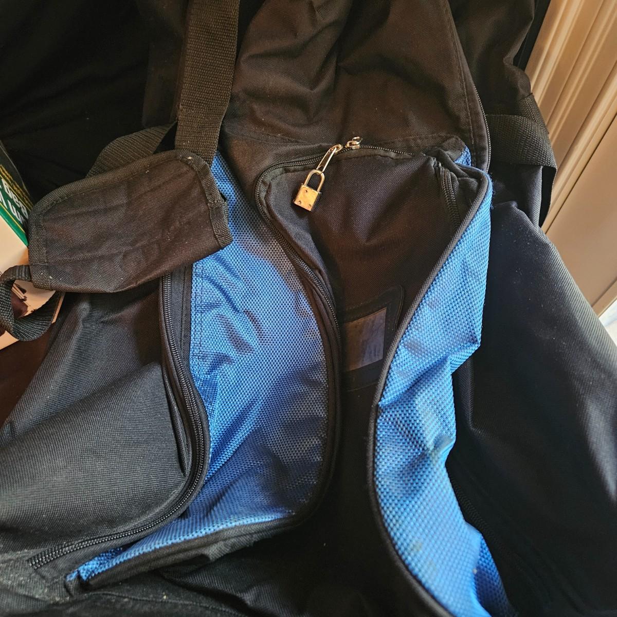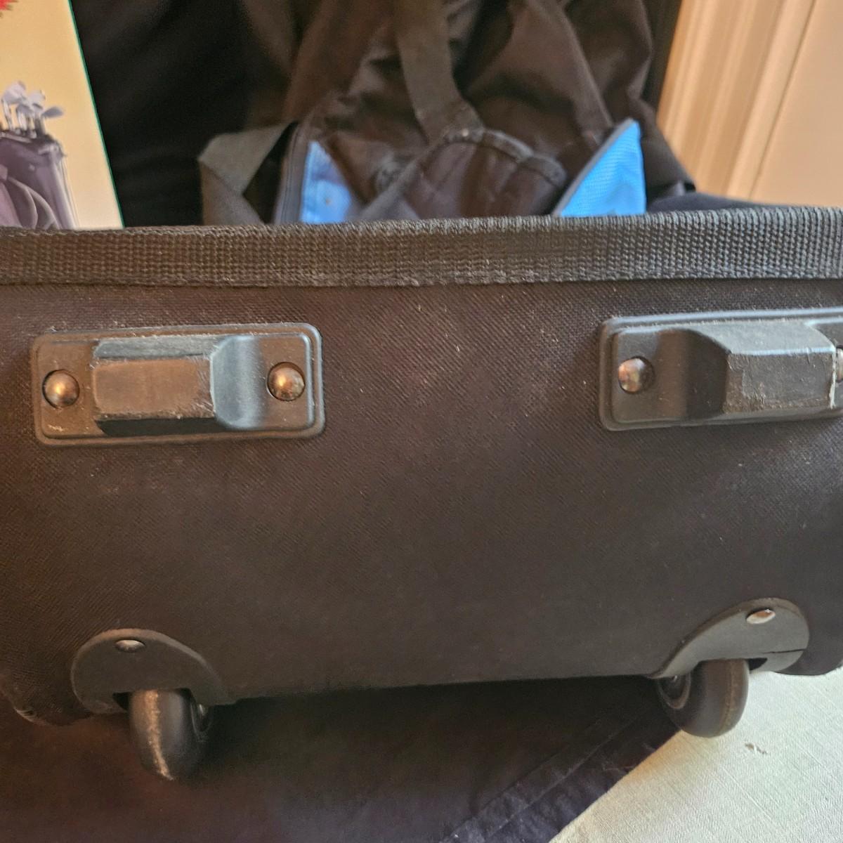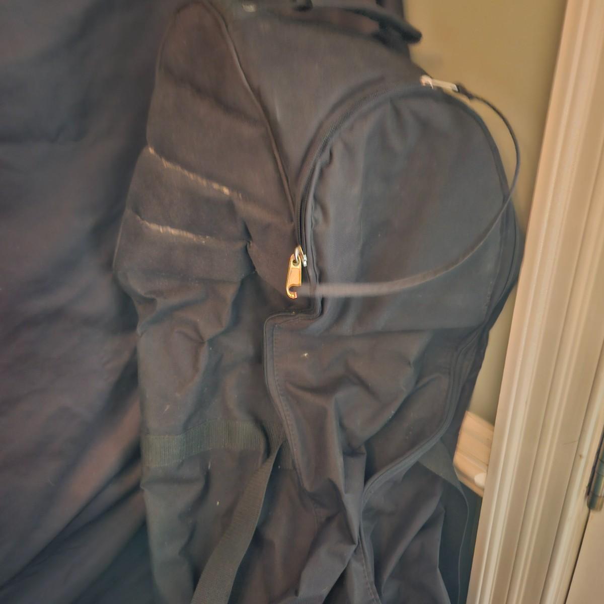 A pair of World of Golf wheeled golf bad travel covers. One is unused and in its original packaging and one has been used sparingly. They measure approximately 13" x 15" x 49". Shipping available