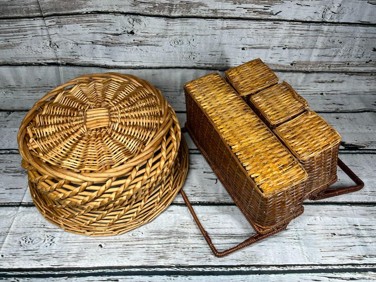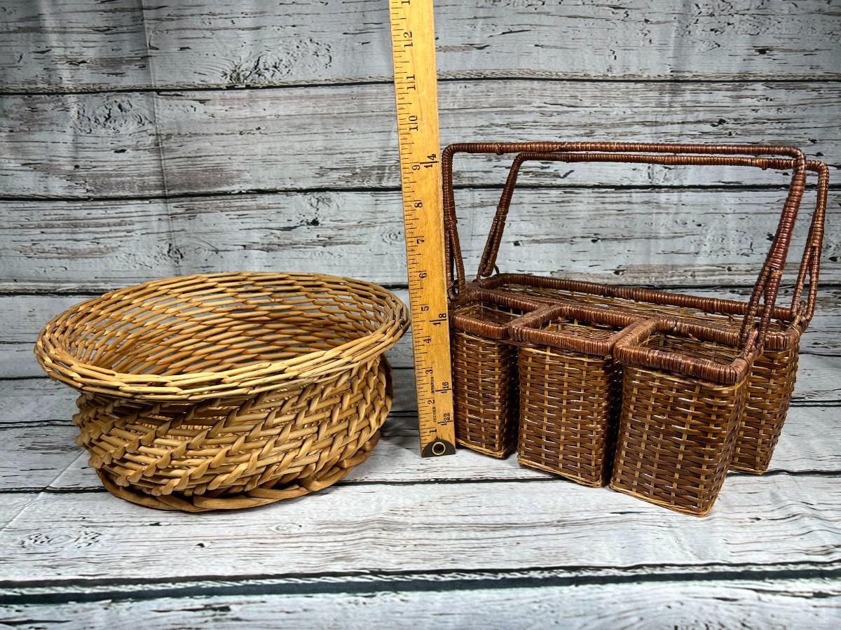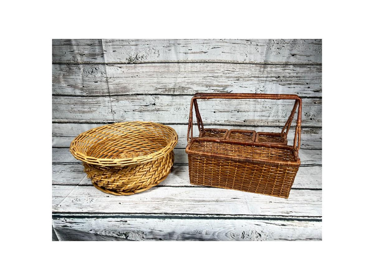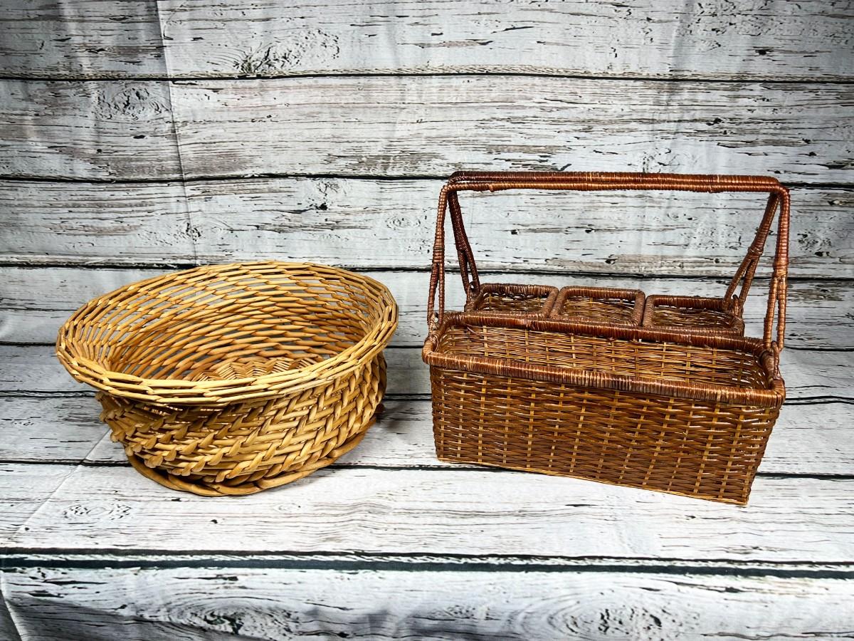 Pair of woven baskets. One is a simple round basket. The other is a caddy style basket, great for outdoor use. Can hold cutlery and plates for your next BBQ or picnic. Both are in good condition.