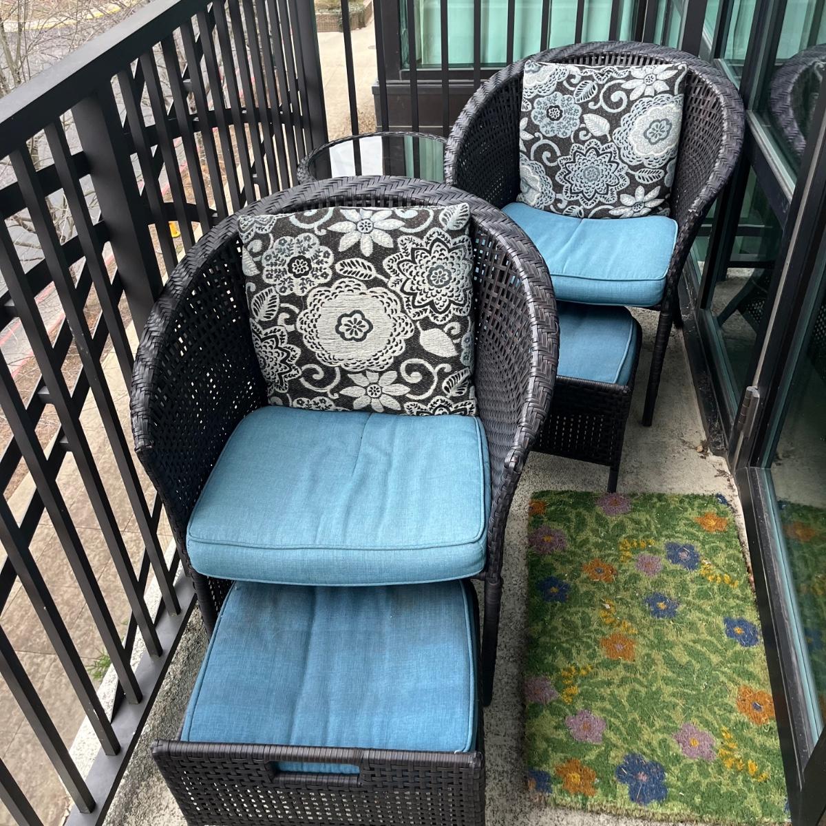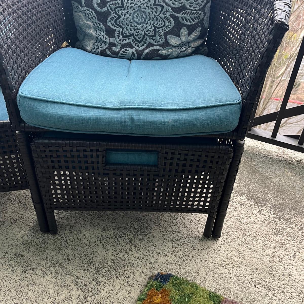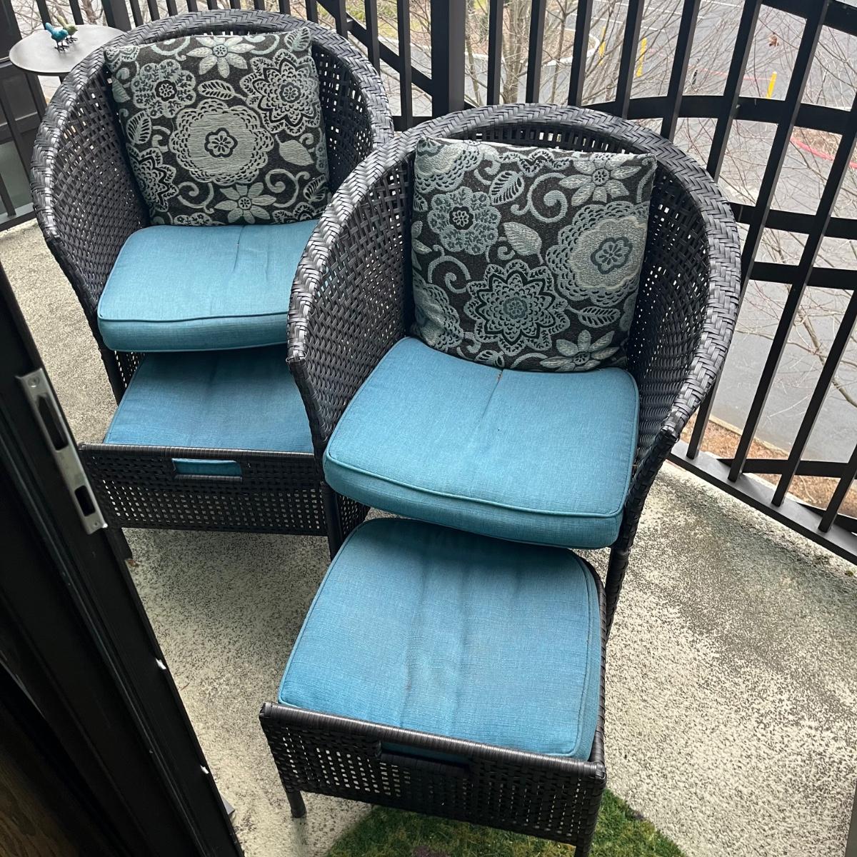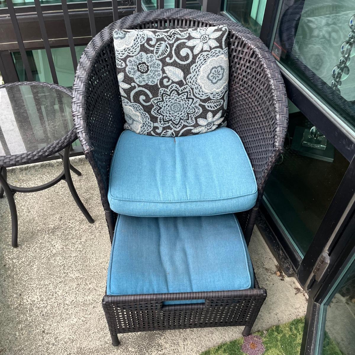Lot includes a pair of woven chairs with cushions. Each chair conveniently houses an ottoman that stores underneath the chair when not in use. Chairs measure 27” x 28” x 31” with a 18.5” seat height. Chairs and table appear to be woven with a plastic that looks like a natural fiber. Also included is a matching side table. Table measures 20.5”D x 20.5” tall. Green mat not included in lot.
