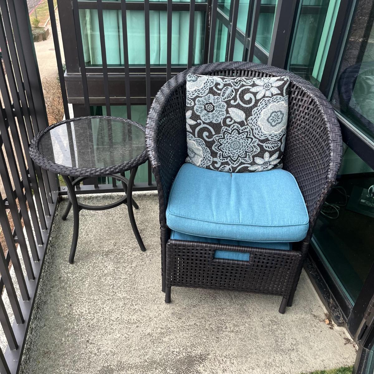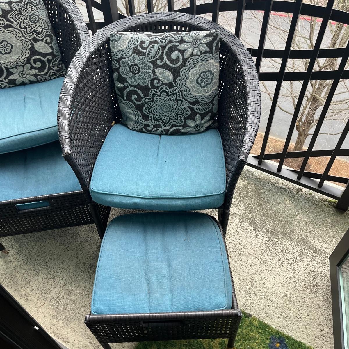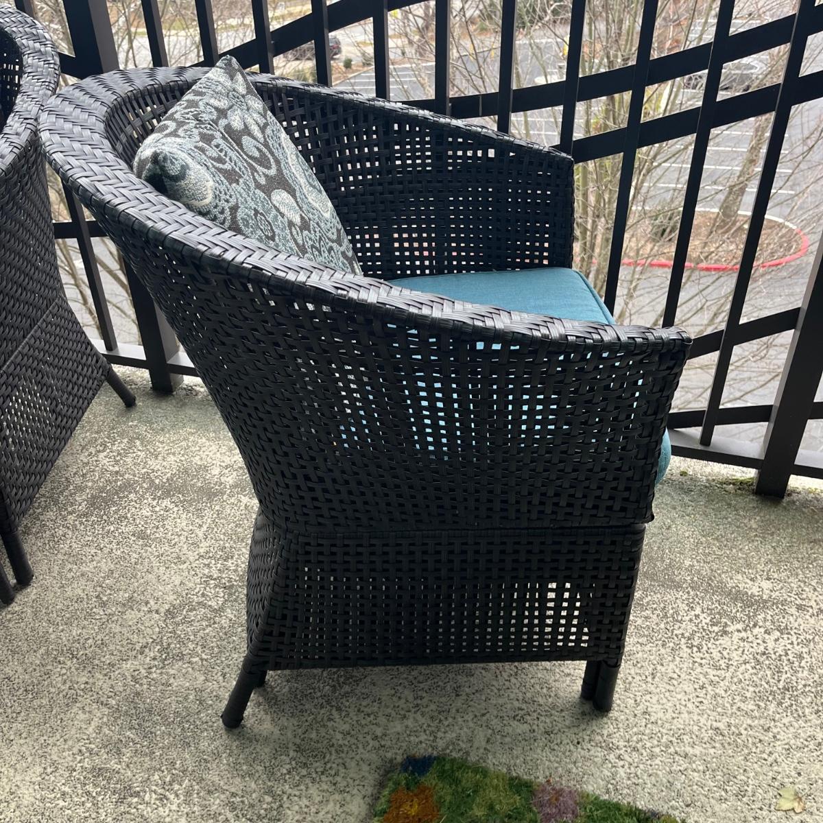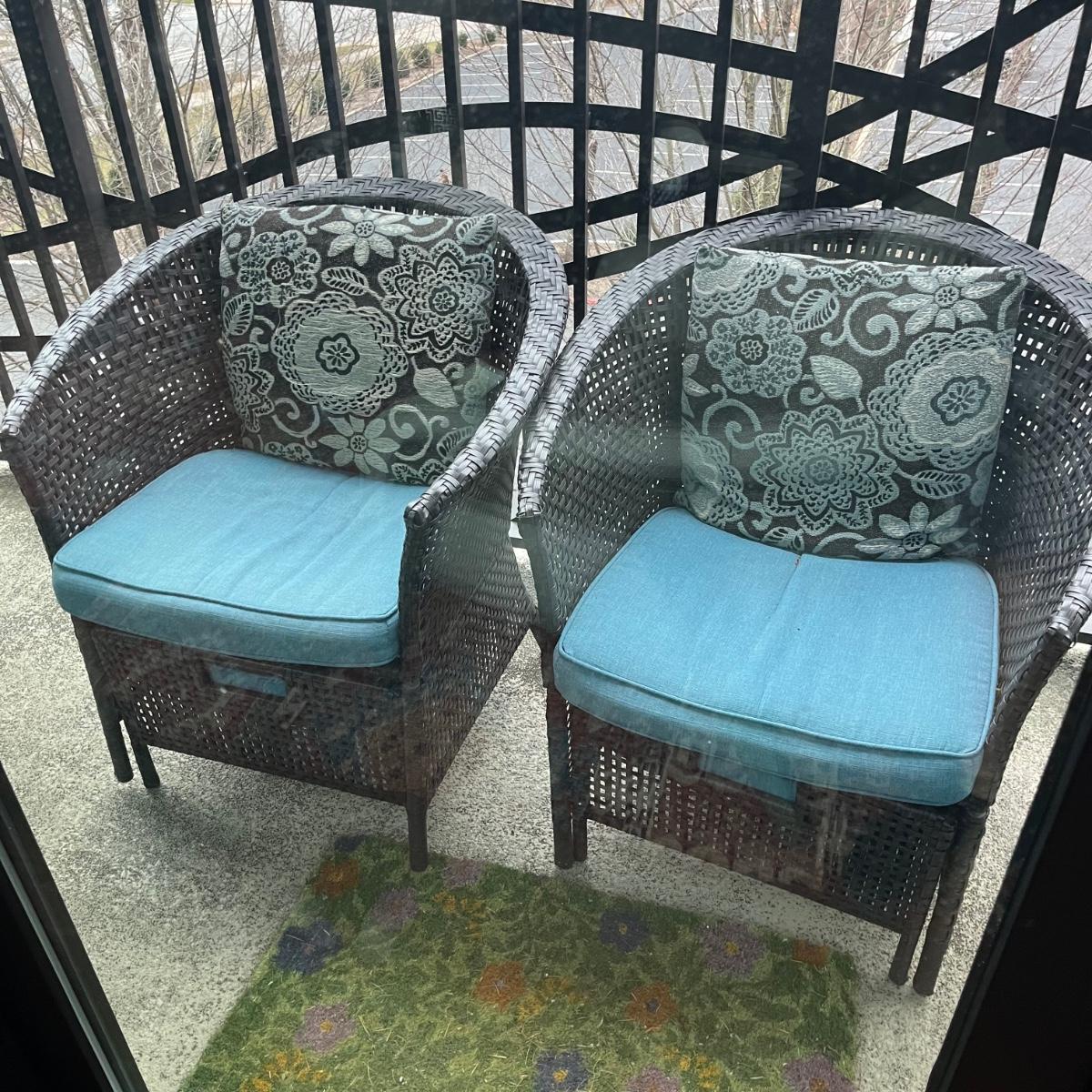 Lot includes a pair of woven chairs with cushions. Each chair conveniently houses an ottoman that stores underneath the chair when not in use. Chairs measure 27” x 28” x 31” with a 18.5” seat height. Chairs and table appear to be woven with a plastic that looks like a natural fiber. Also included is a matching side table. Table measures 20.5”D x 20.5” tall. Green mat not included in lot.