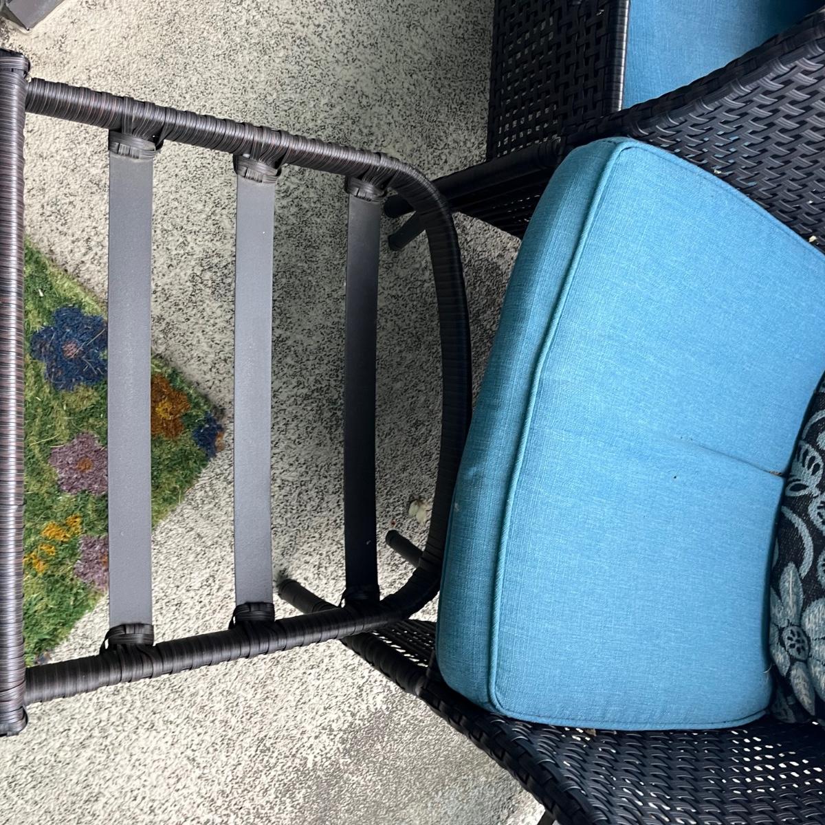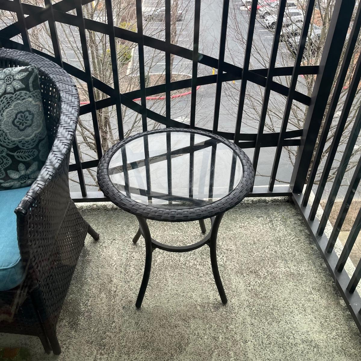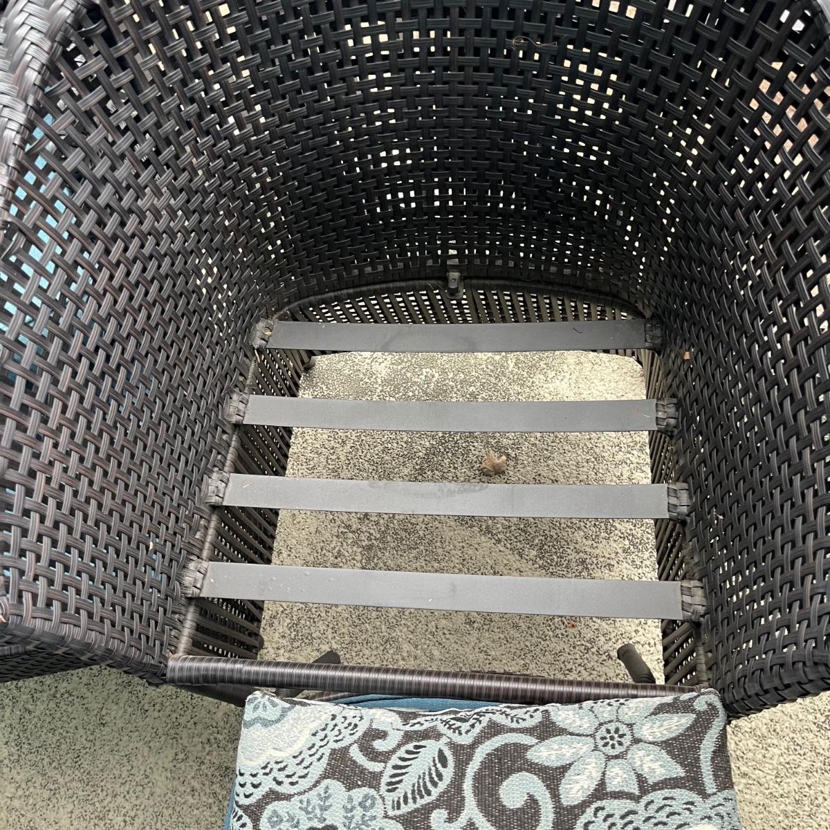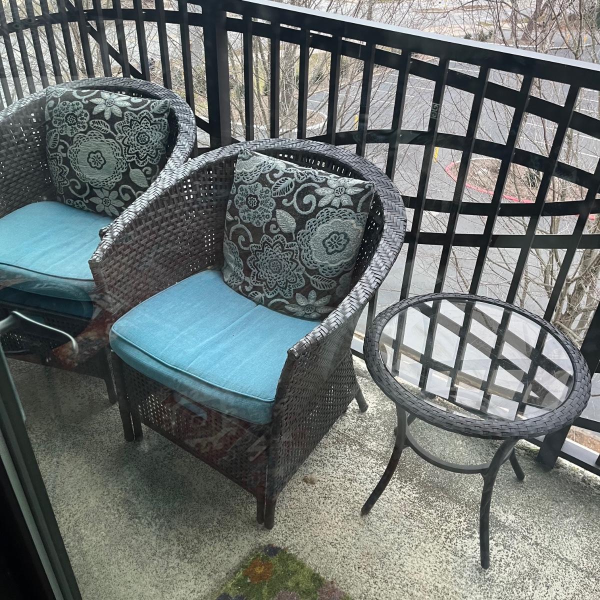 Lot includes a pair of woven chairs with cushions. Each chair conveniently houses an ottoman that stores underneath the chair when not in use. Chairs measure 27” x 28” x 31” with a 18.5” seat height. Chairs and table appear to be woven with a plastic that looks like a natural fiber. Also included is a matching side table. Table measures 20.5”D x 20.5” tall. Green mat not included in lot.