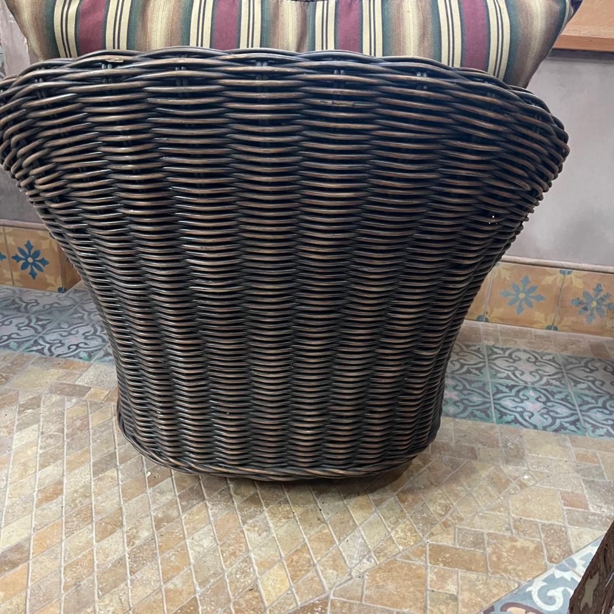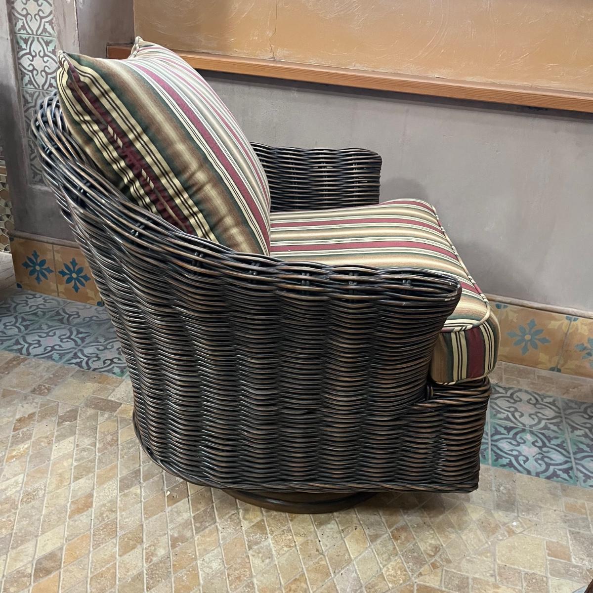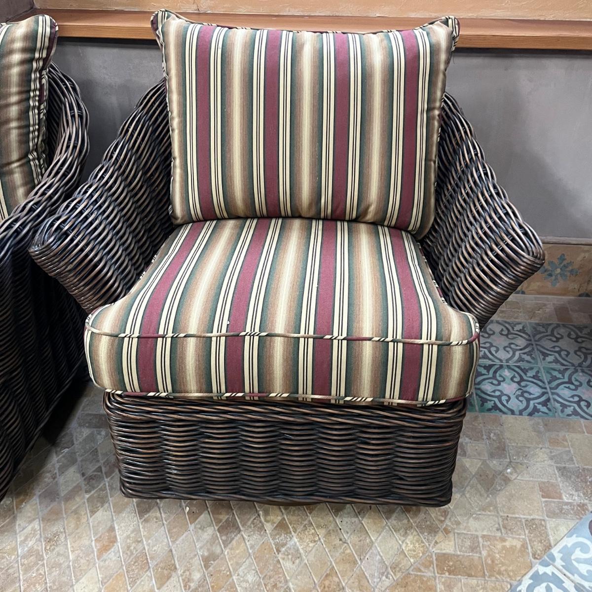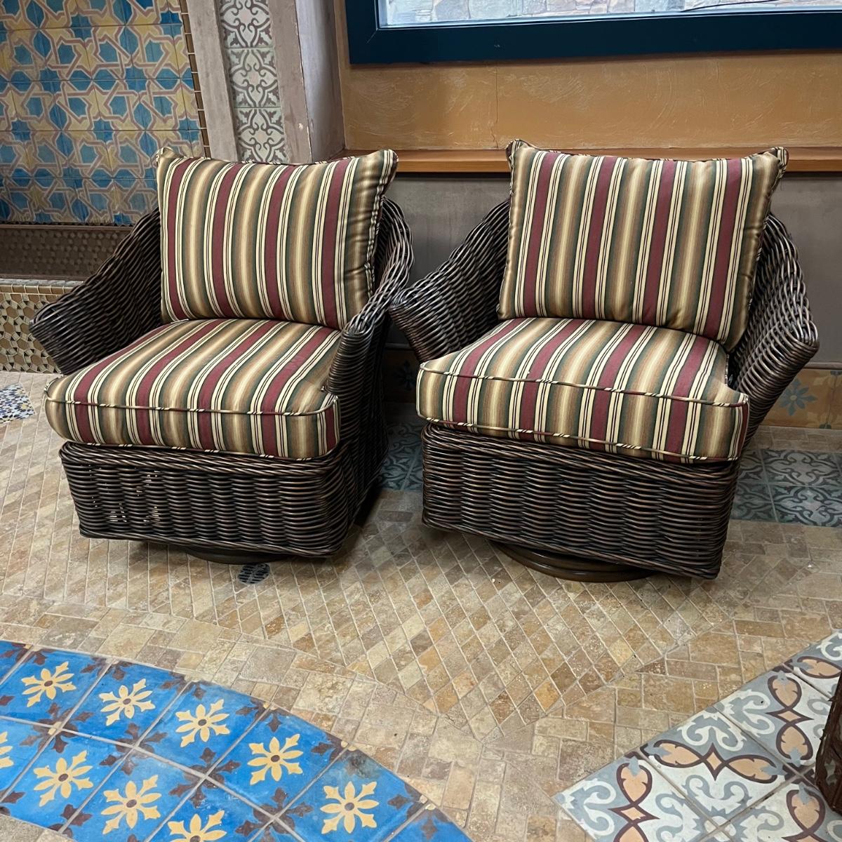 Lot includes two matching woven swivel chairs with upholstered cushions. Chairs appear to be rattan. Chairs measure 37” x 36” x 31.5” with a 23” seat height. One chair has a piece of rattan broken off on back, see pictures.