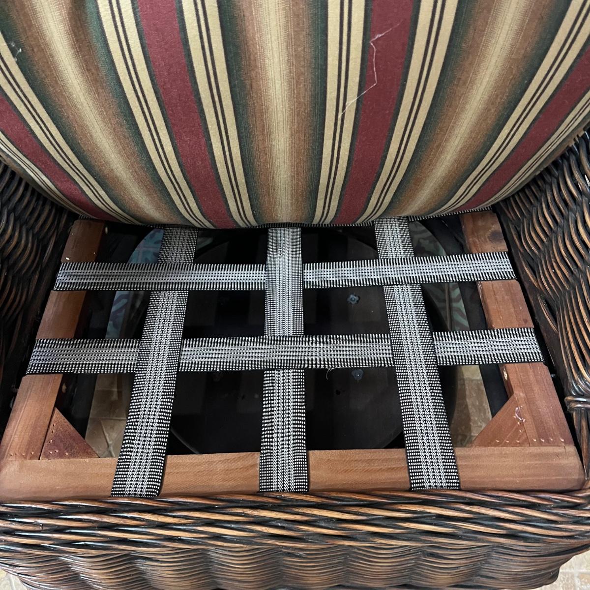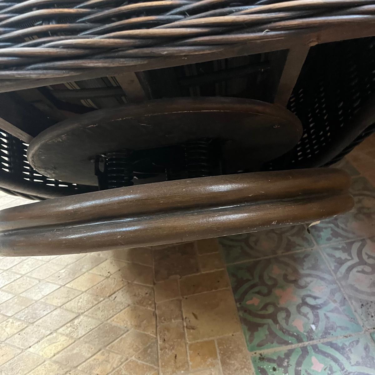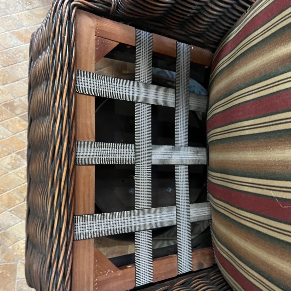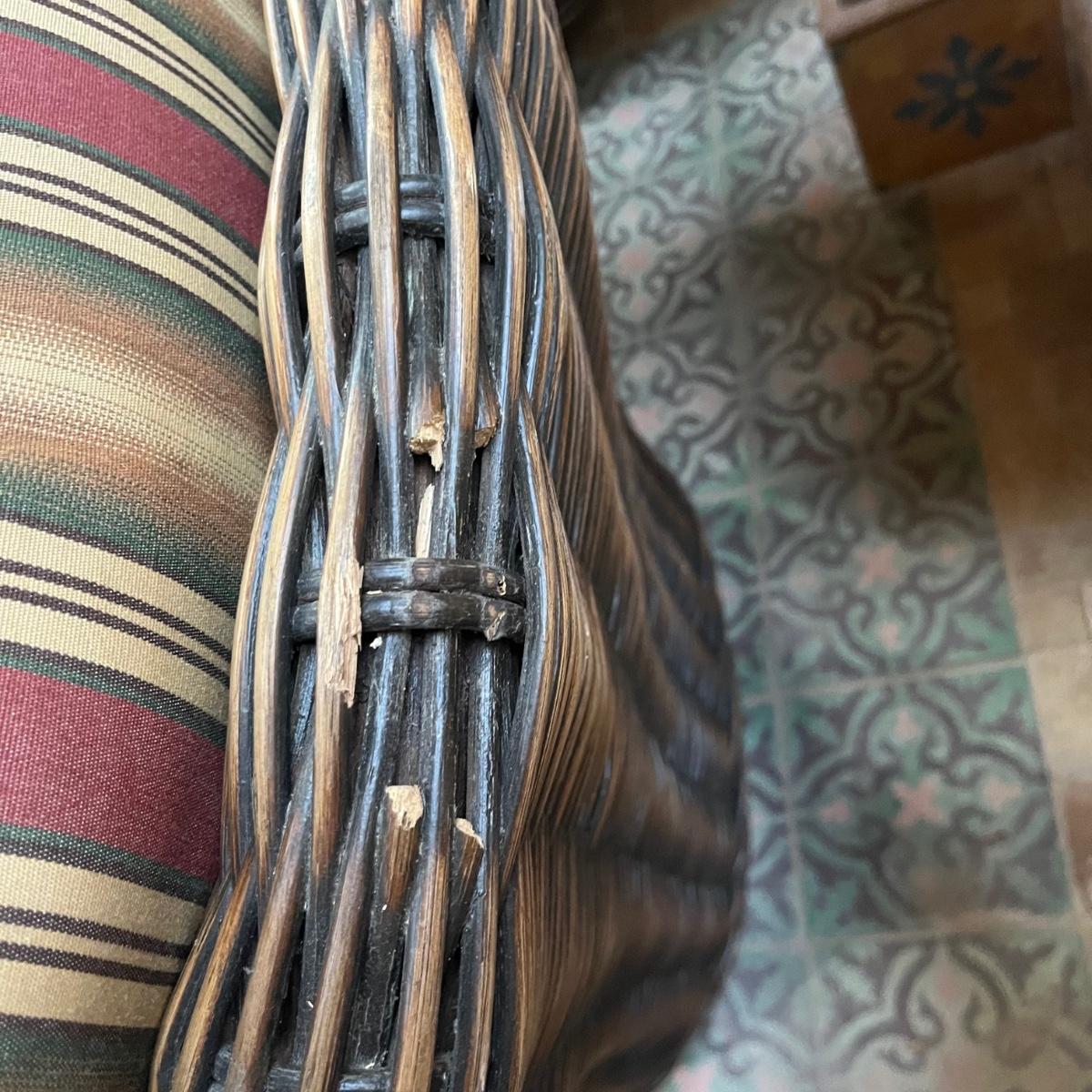 Lot includes two matching woven swivel chairs with upholstered cushions. Chairs appear to be rattan. Chairs measure 37” x 36” x 31.5” with a 23” seat height. One chair has a piece of rattan broken off on back, see pictures.