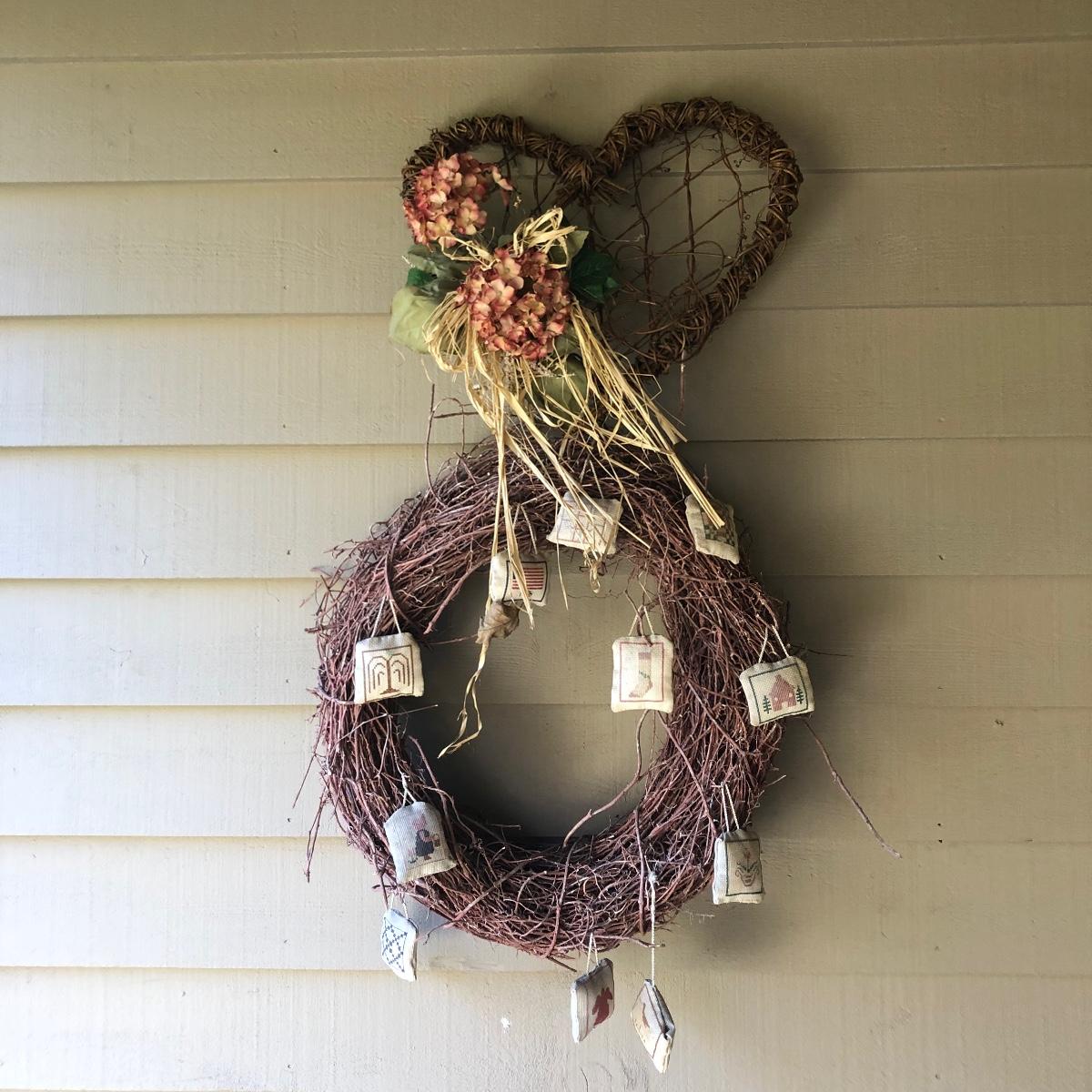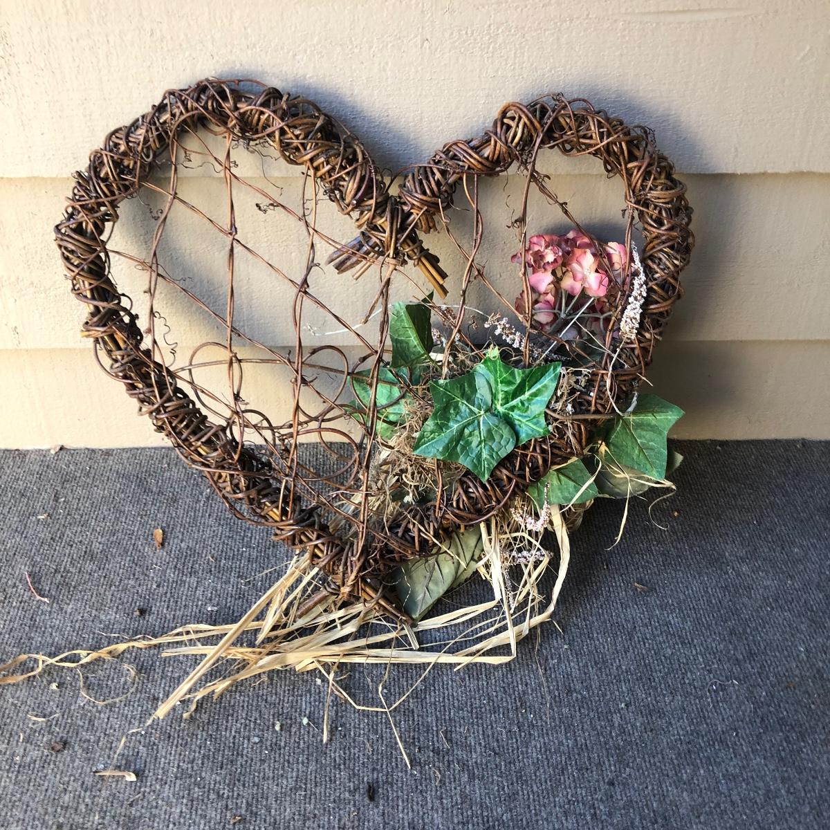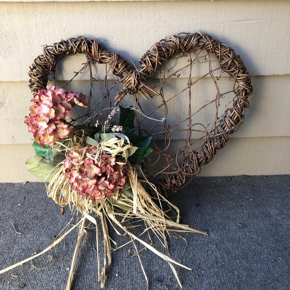 Lot includes one round wreath with needlepoint ornaments and a heart shaped wreath with faux flowers. Round wreath measures 23”D x 7” thick.