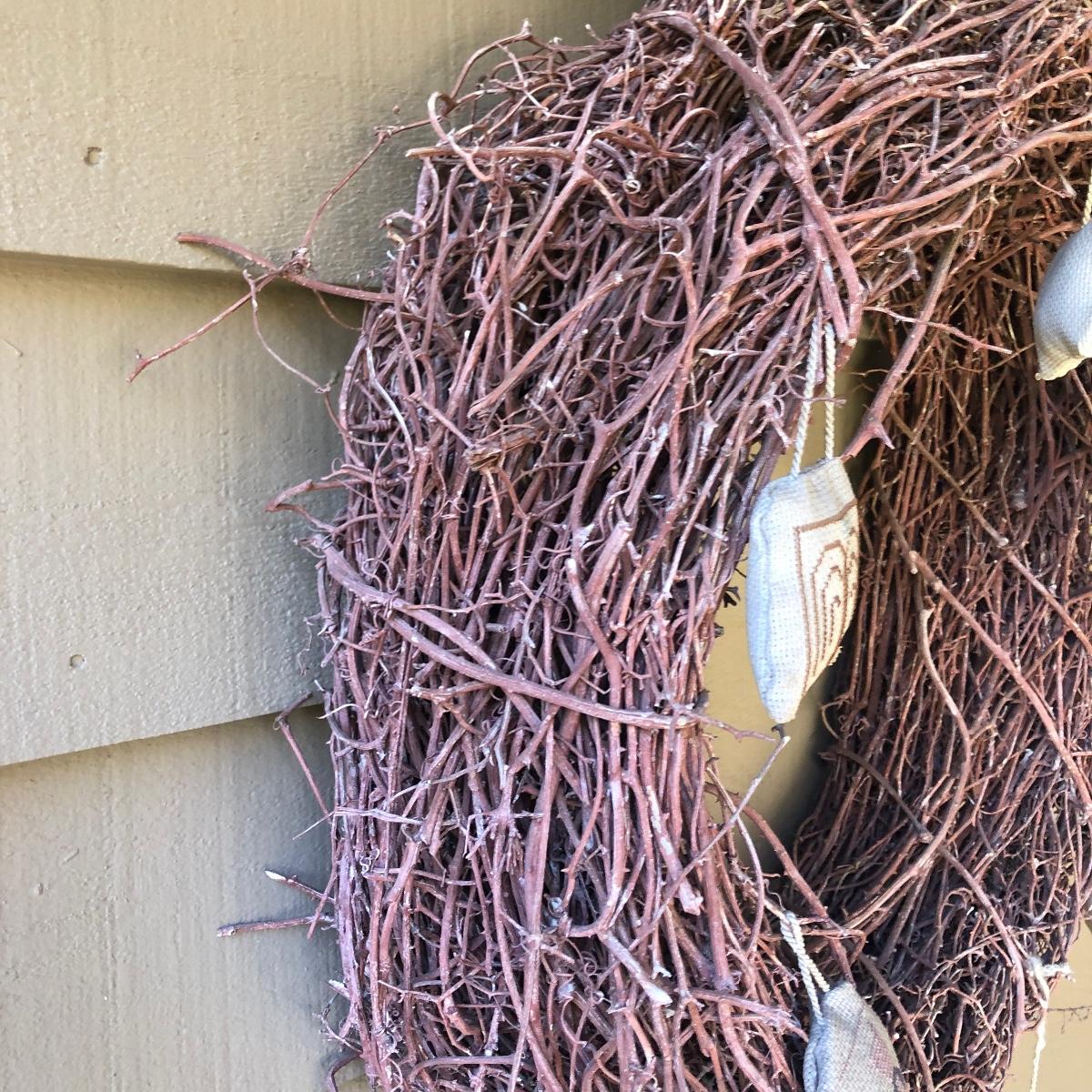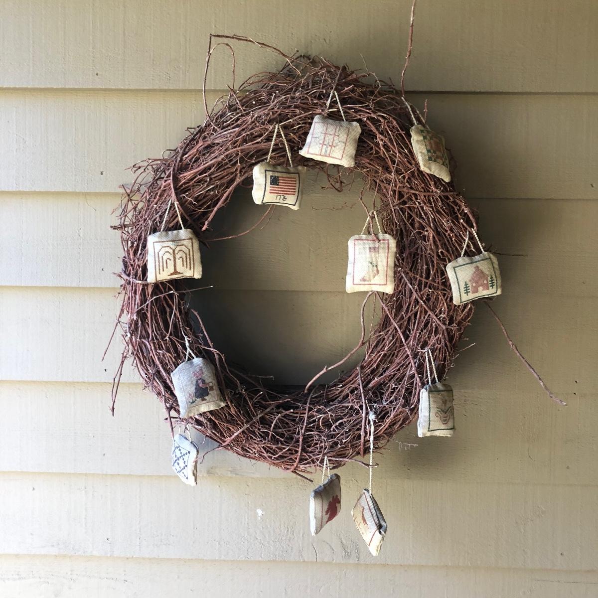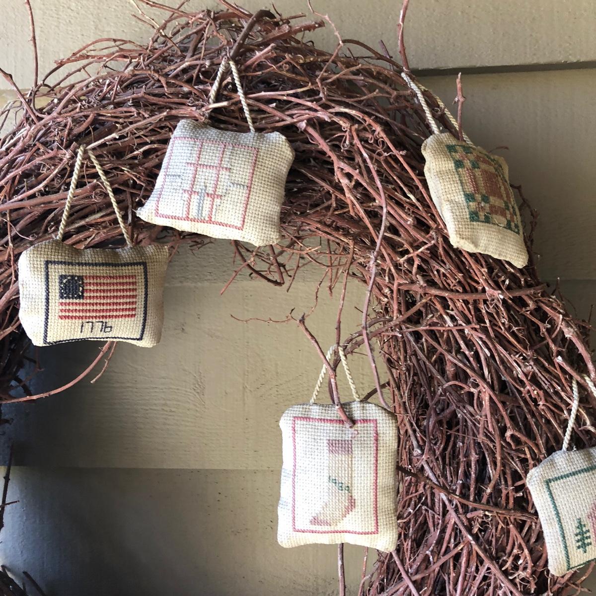 Lot includes one round wreath with needlepoint ornaments and a heart shaped wreath with faux flowers. Round wreath measures 23”D x 7” thick.