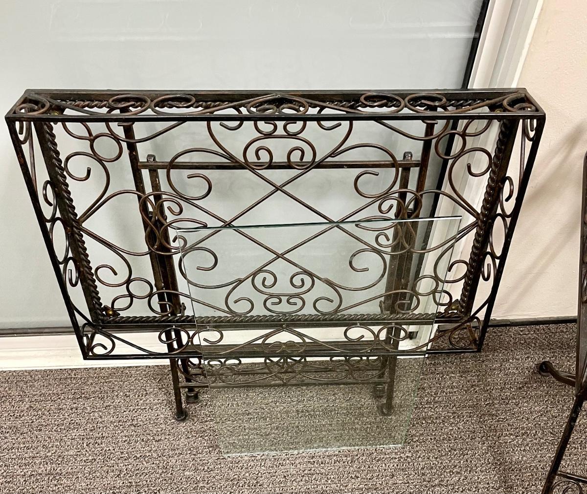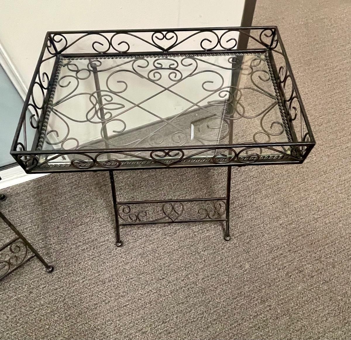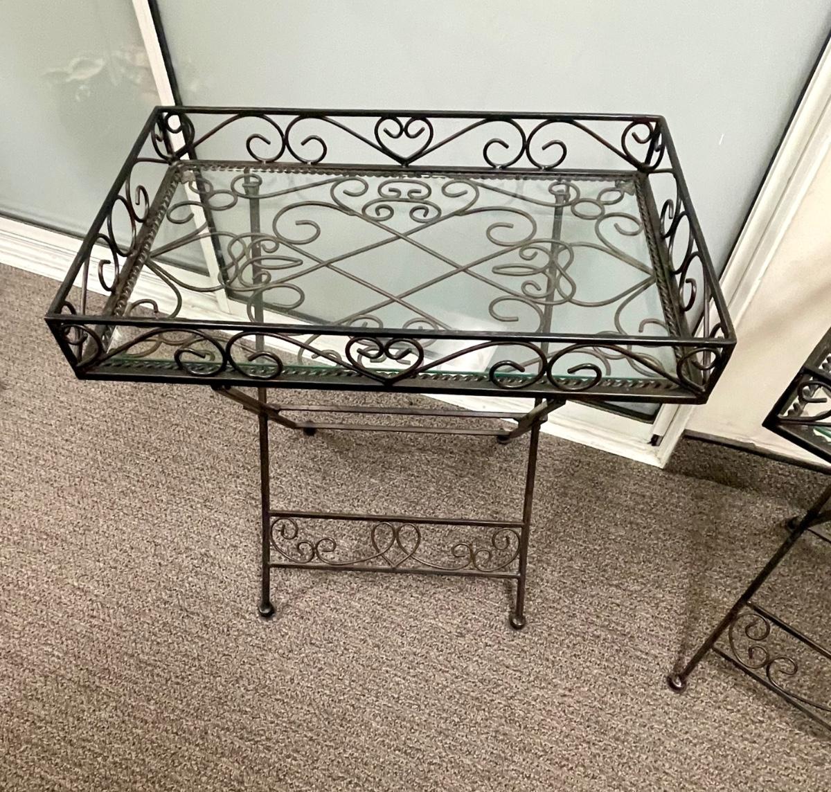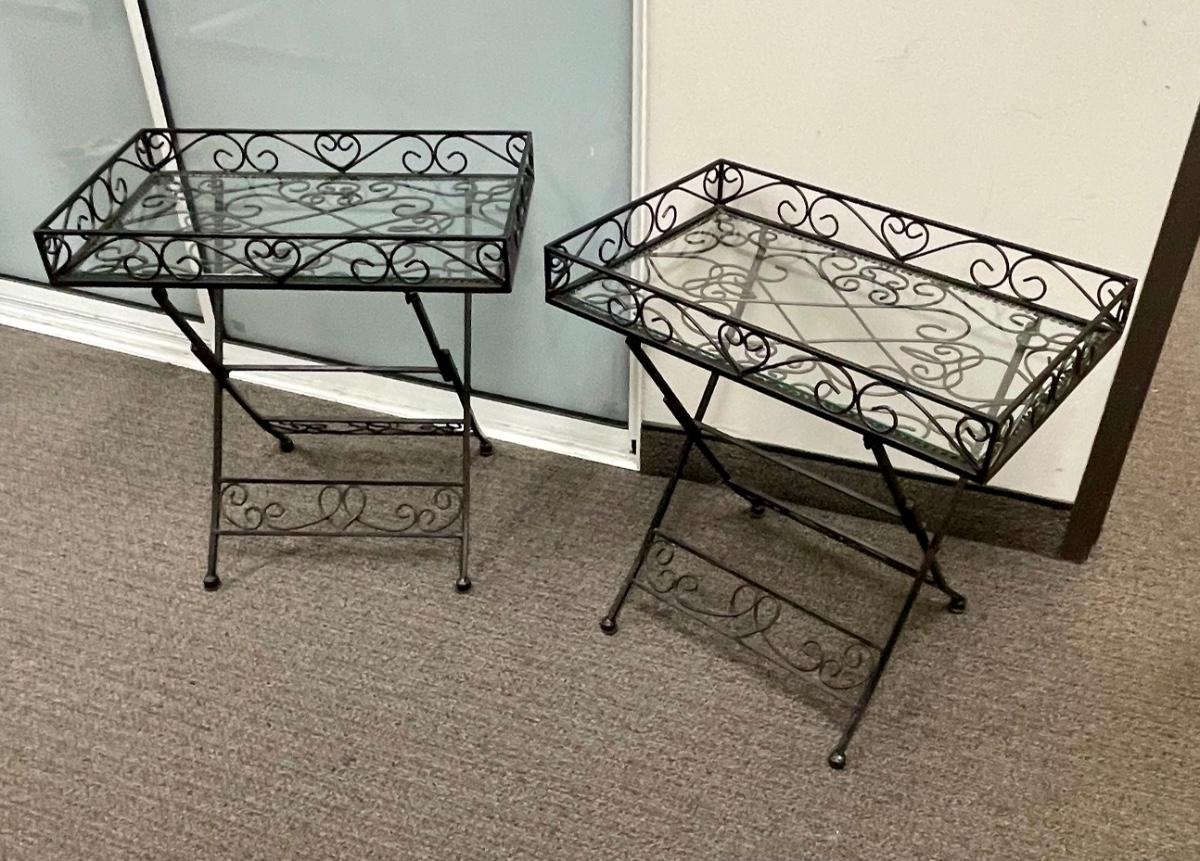 Solid wrought-iron folding tables (see photos with table in folded state and sizes). Tables have a glass top which is removed for folding. Near-new condition.