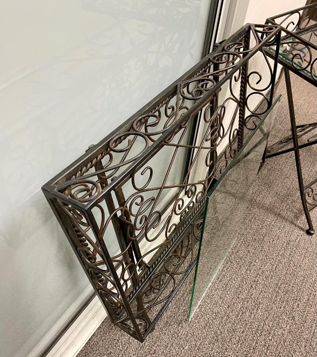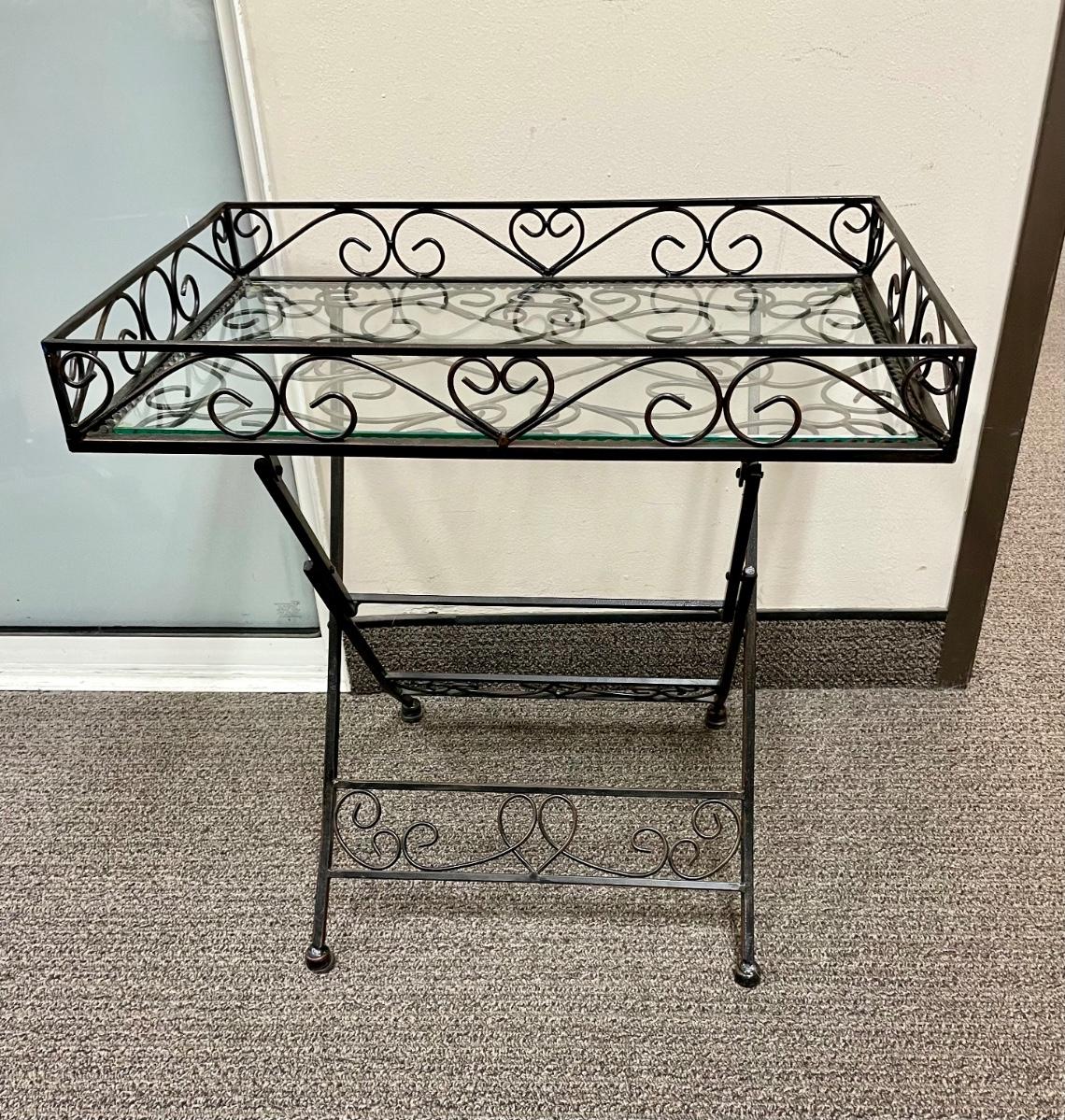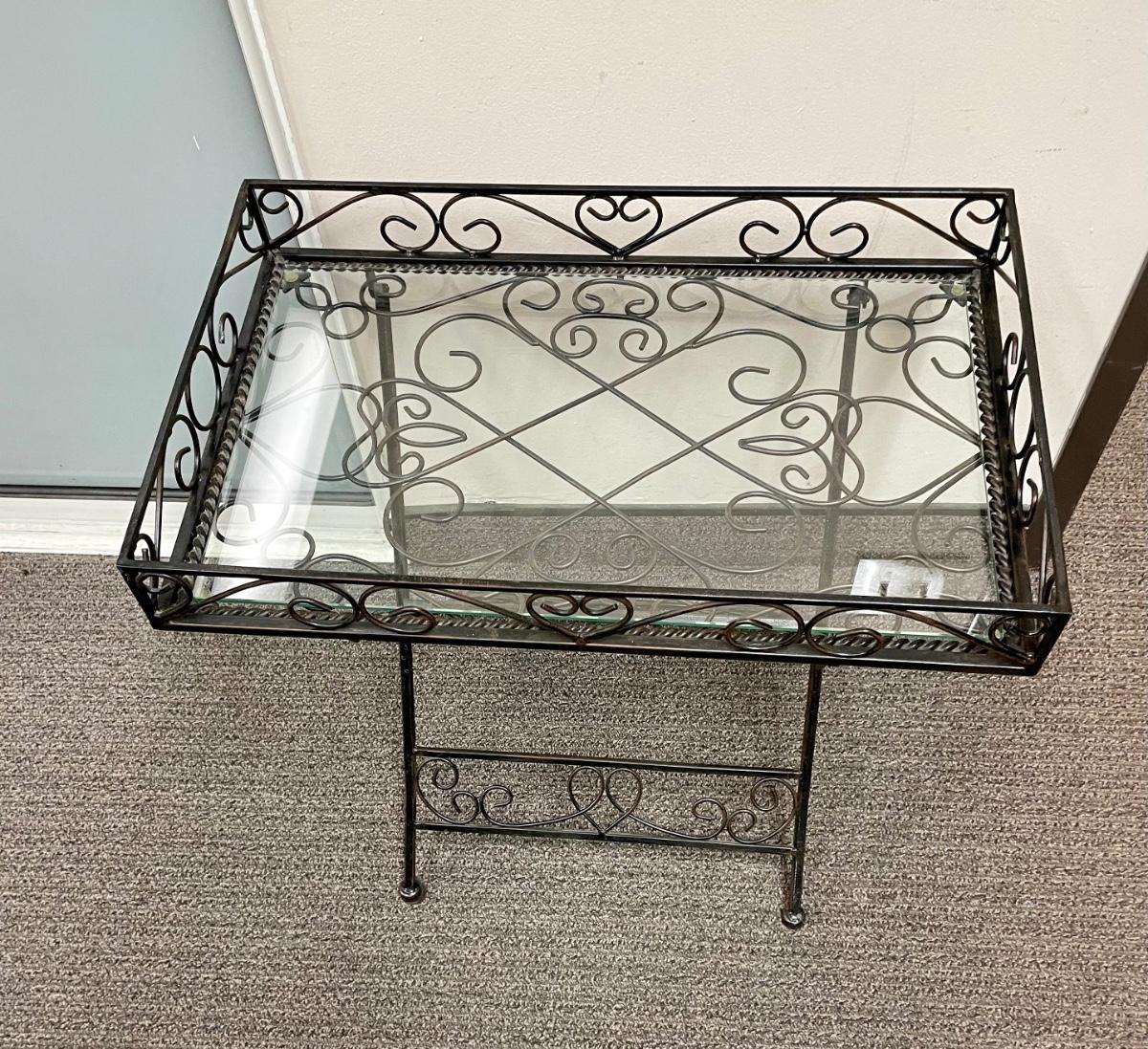 Solid wrought-iron folding tables (see photos with table in folded state and sizes). Tables have a glass top which is removed for folding. Near-new condition.