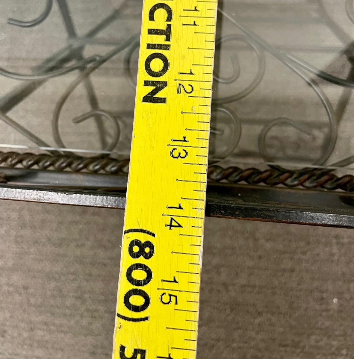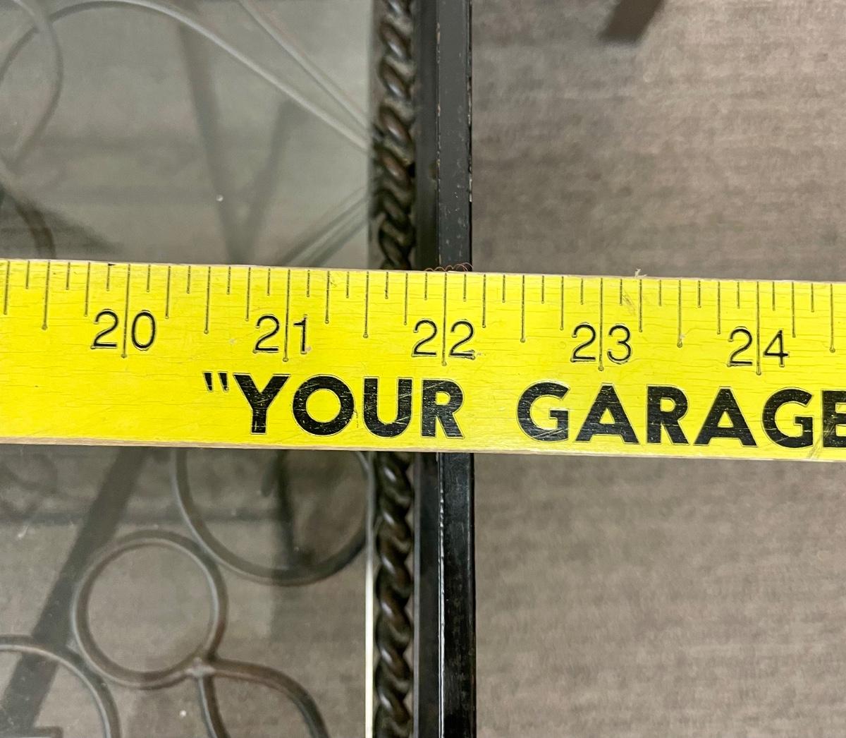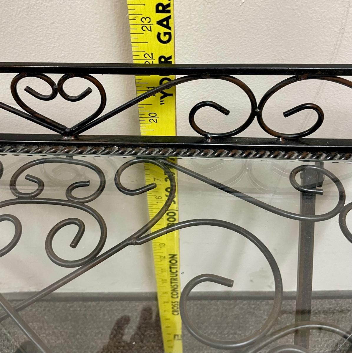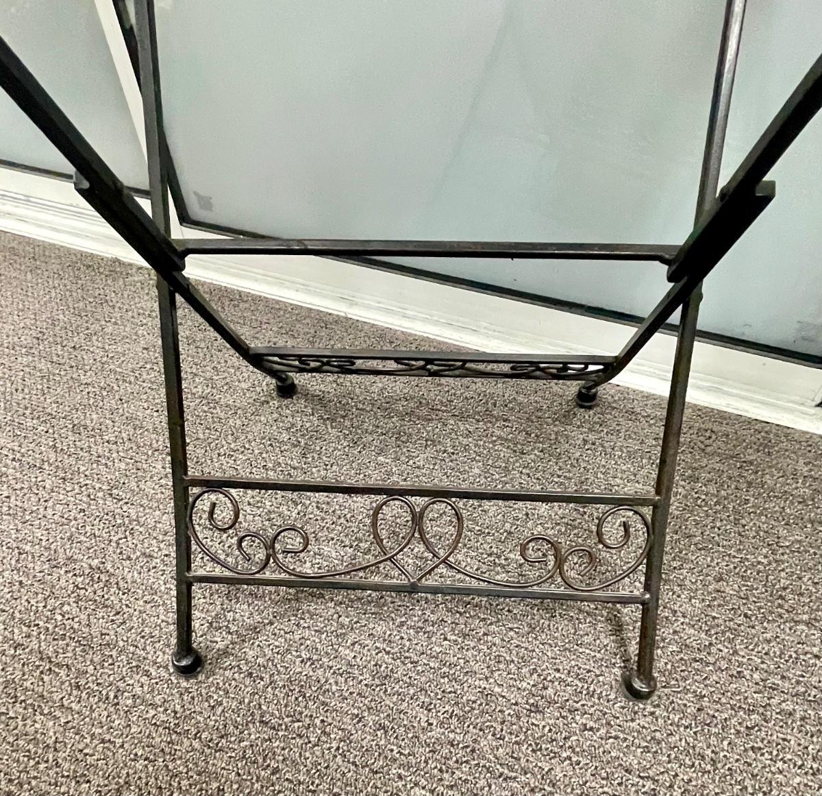 Solid wrought-iron folding tables (see photos with table in folded state and sizes). Tables have a glass top which is removed for folding. Near-new condition.