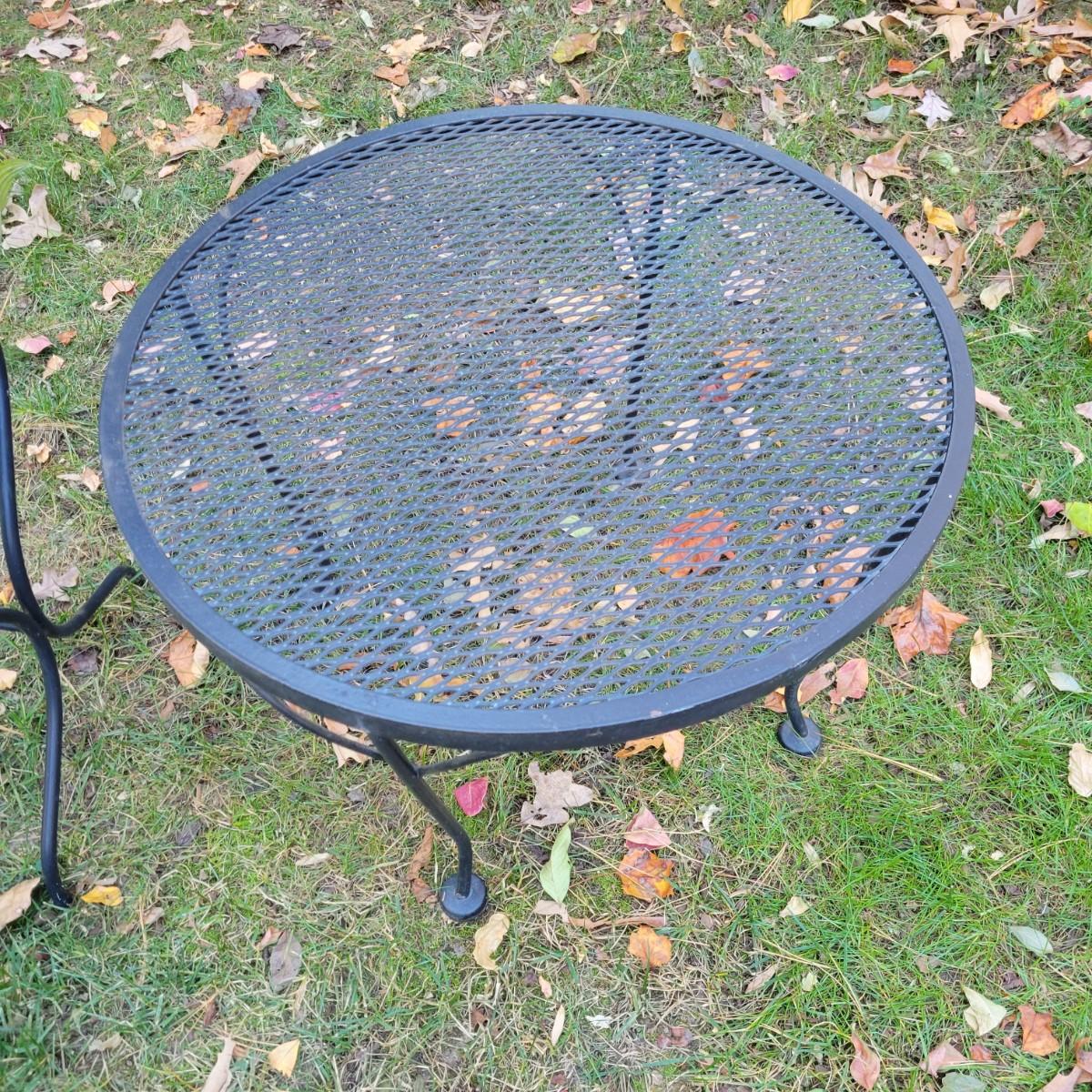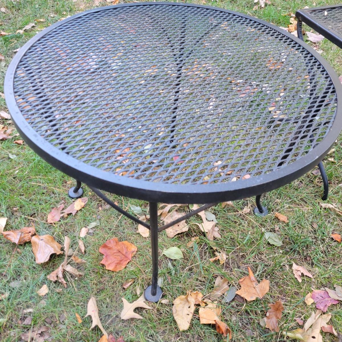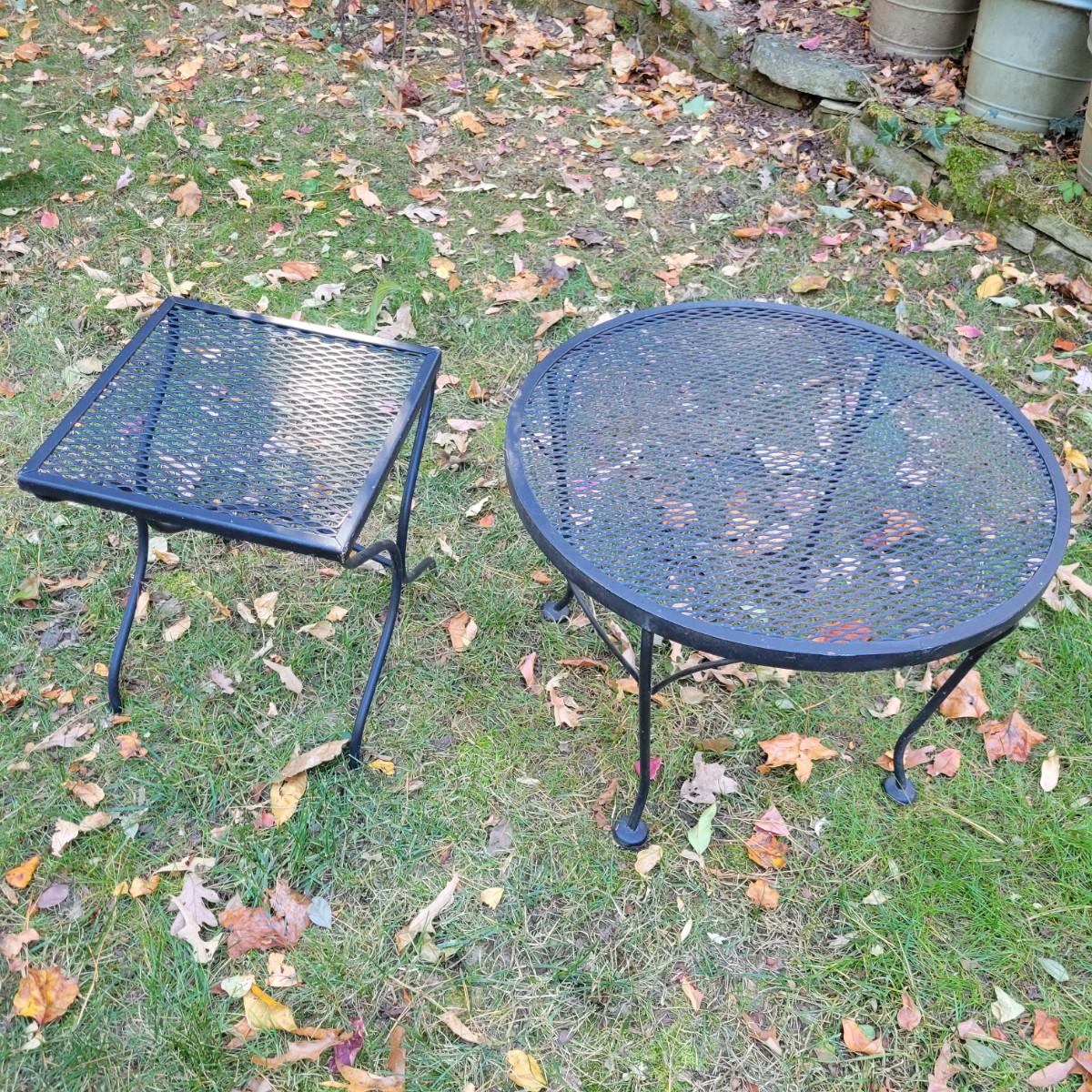 A pair of wrought iron patio tables. The round table measures approximately 24.5"D x 17.5"H. Local pickup only