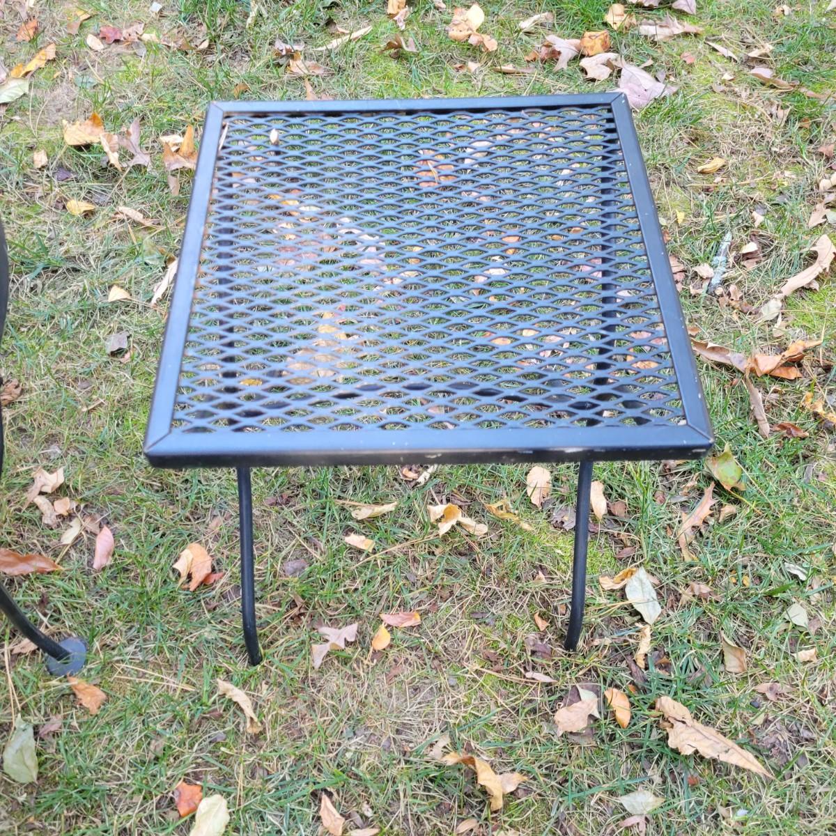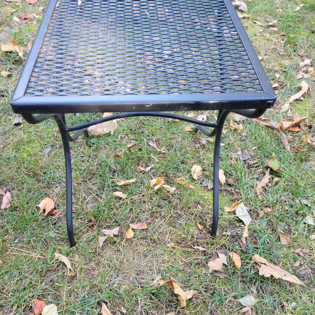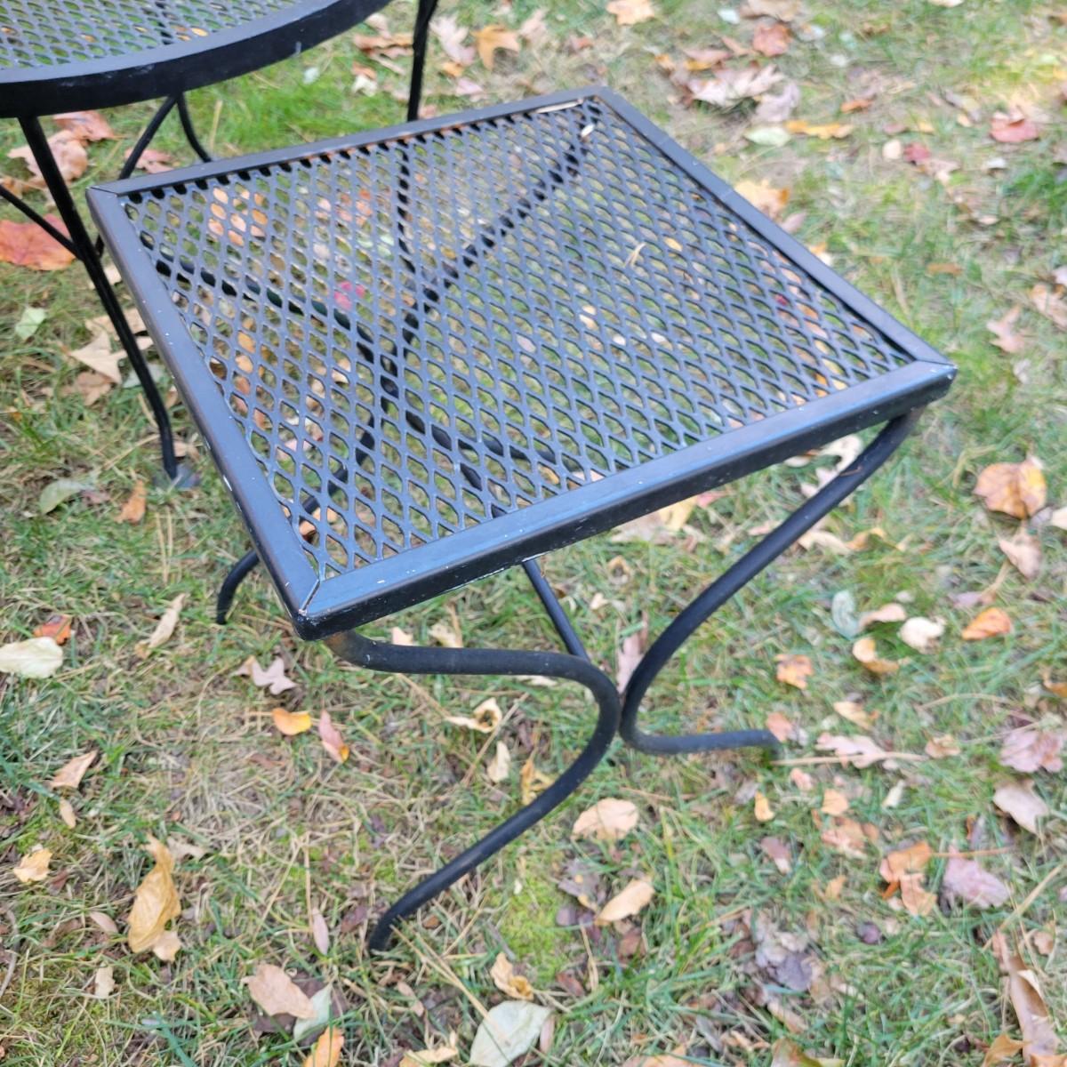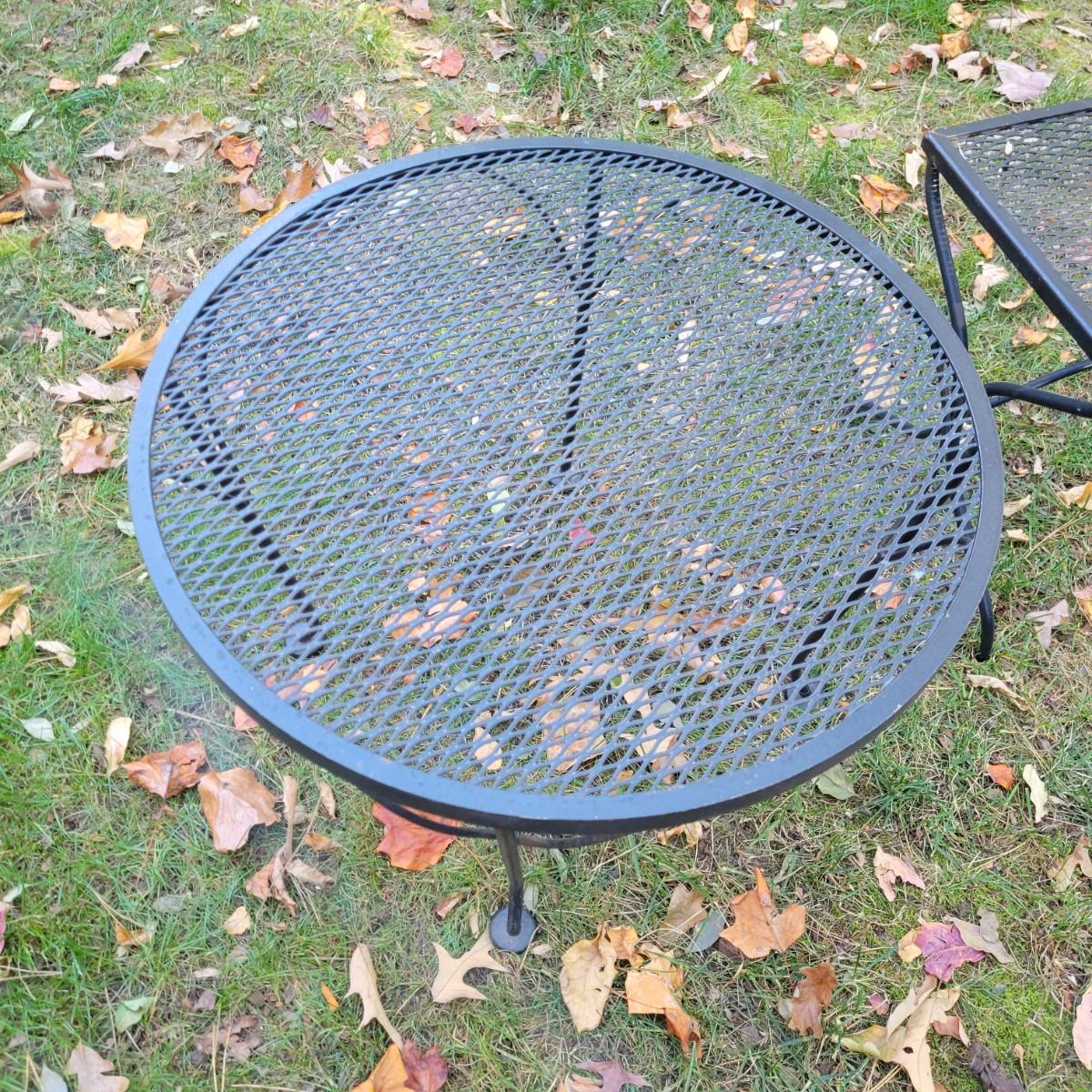 A pair of wrought iron patio tables. The round table measures approximately 24.5"D x 17.5"H. Local pickup only