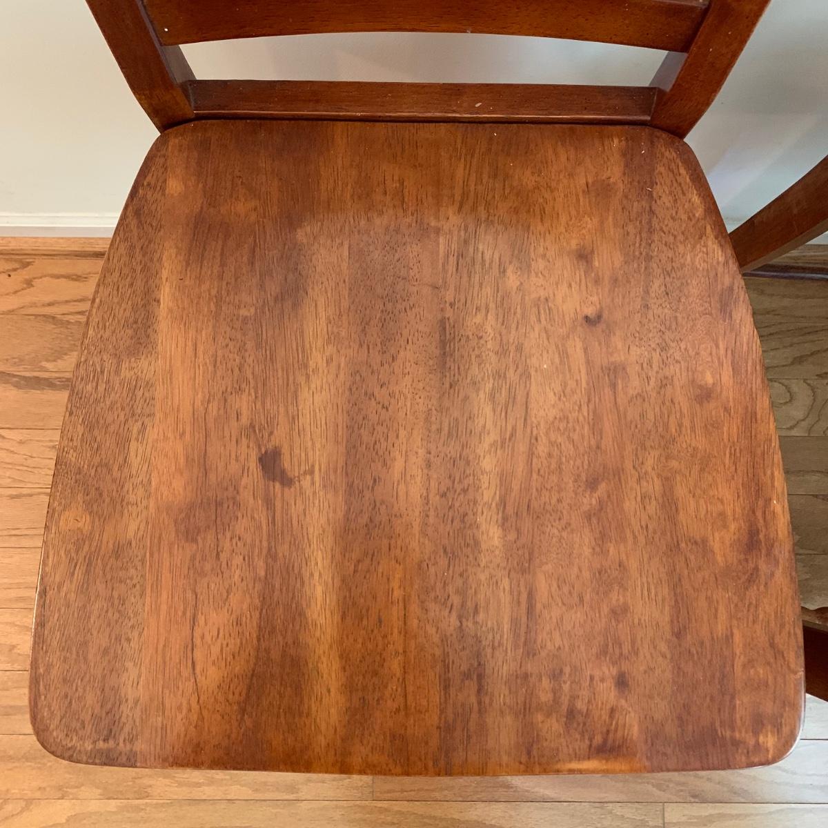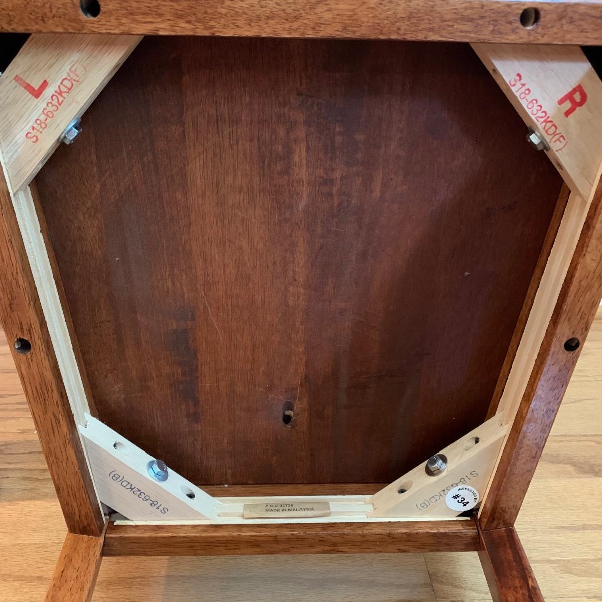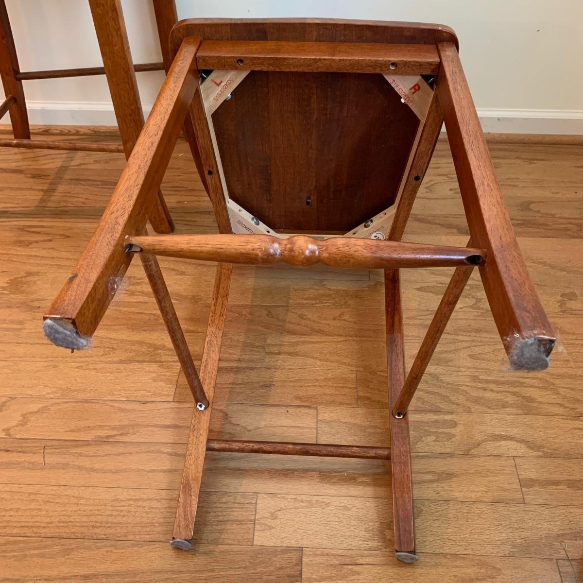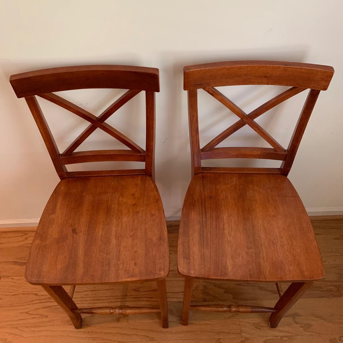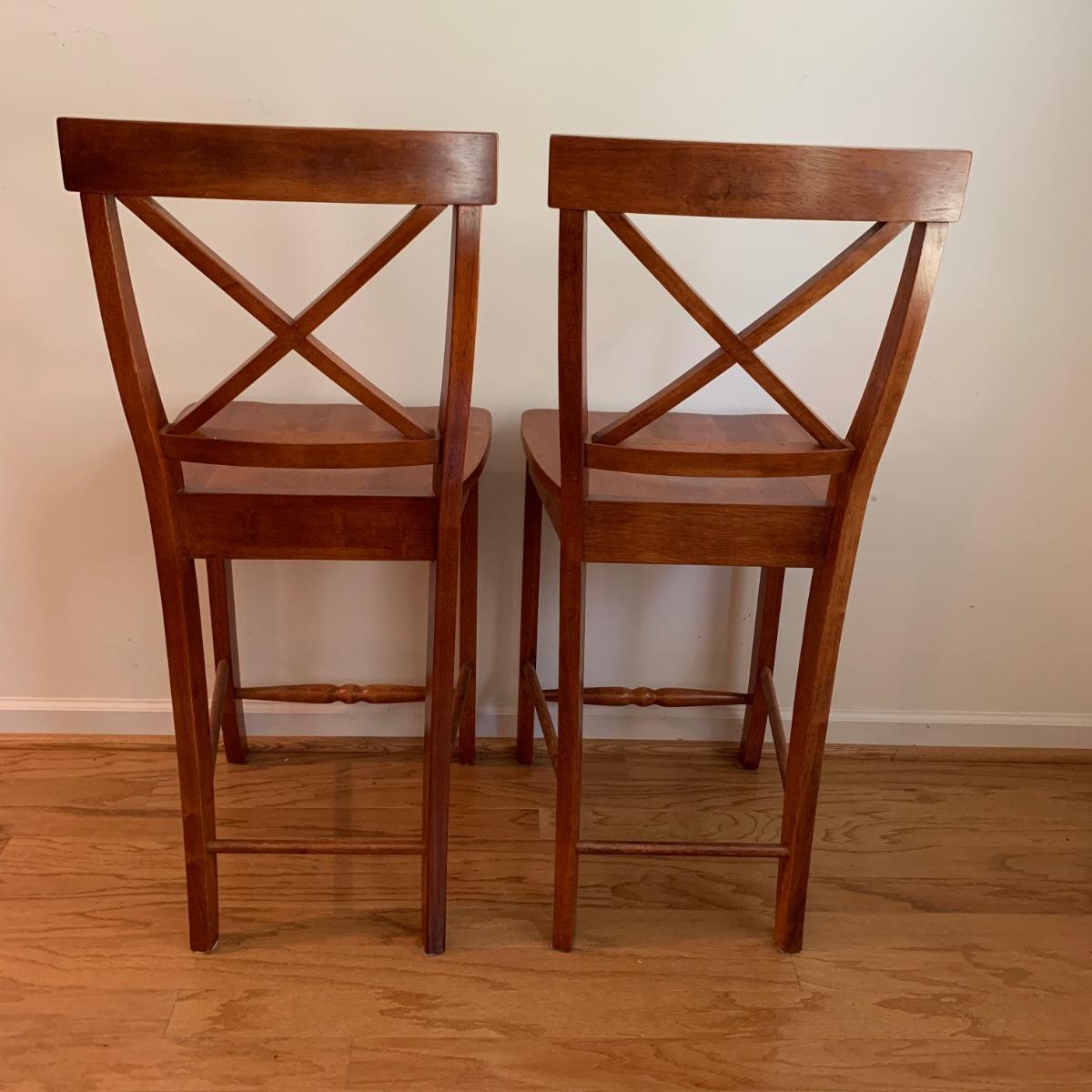 This nice set of wood counter stools were made in Malaysia. They have contoured seats and a slightly curved X-back. The seat height is 24”. The top of the back is 40” tall. The seat is 17” wide and 15.25” deep. One is slightly wobbly when sat upon. Local pickup only.