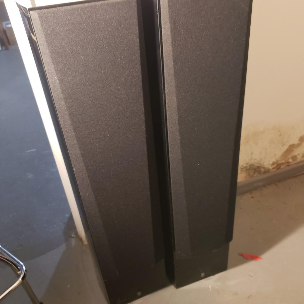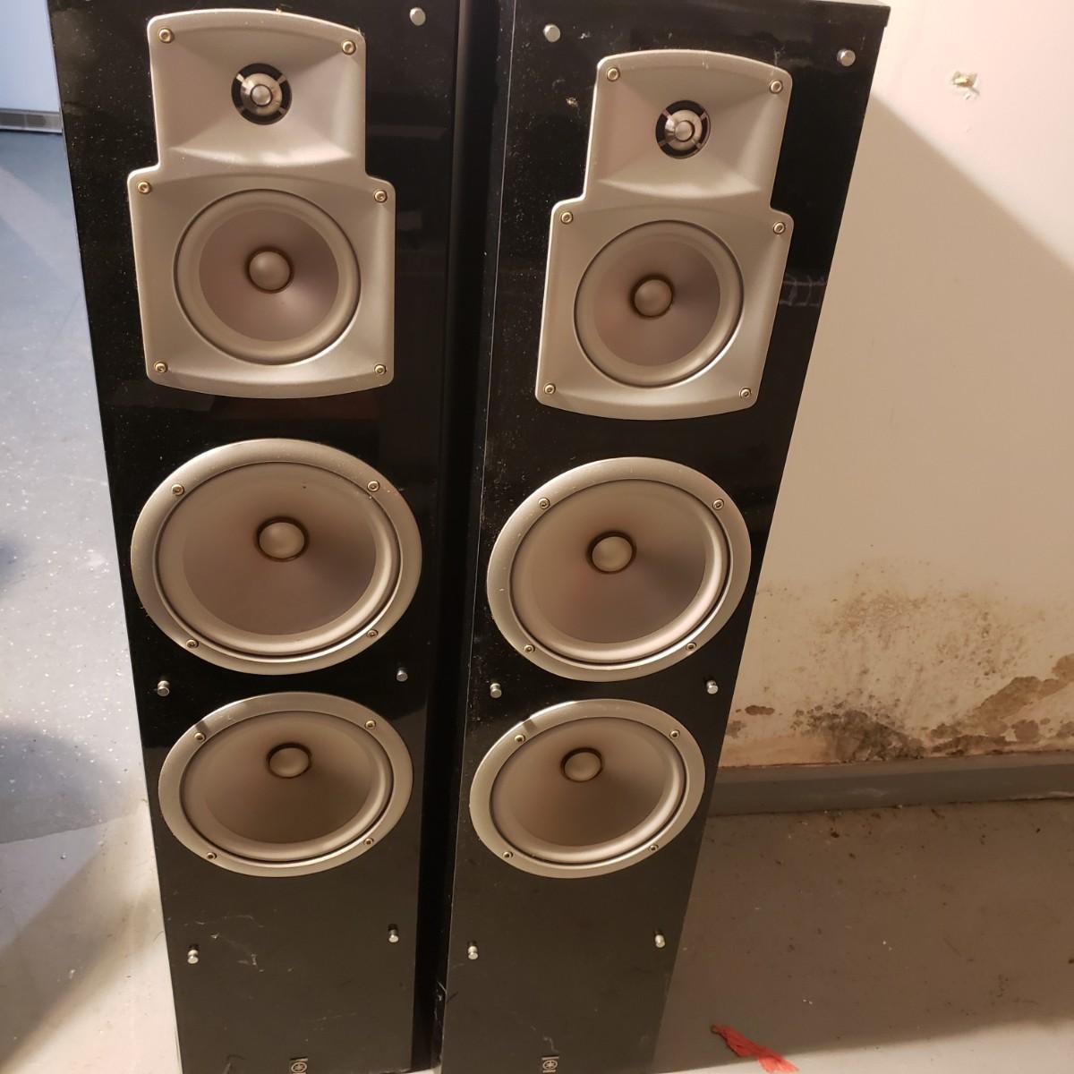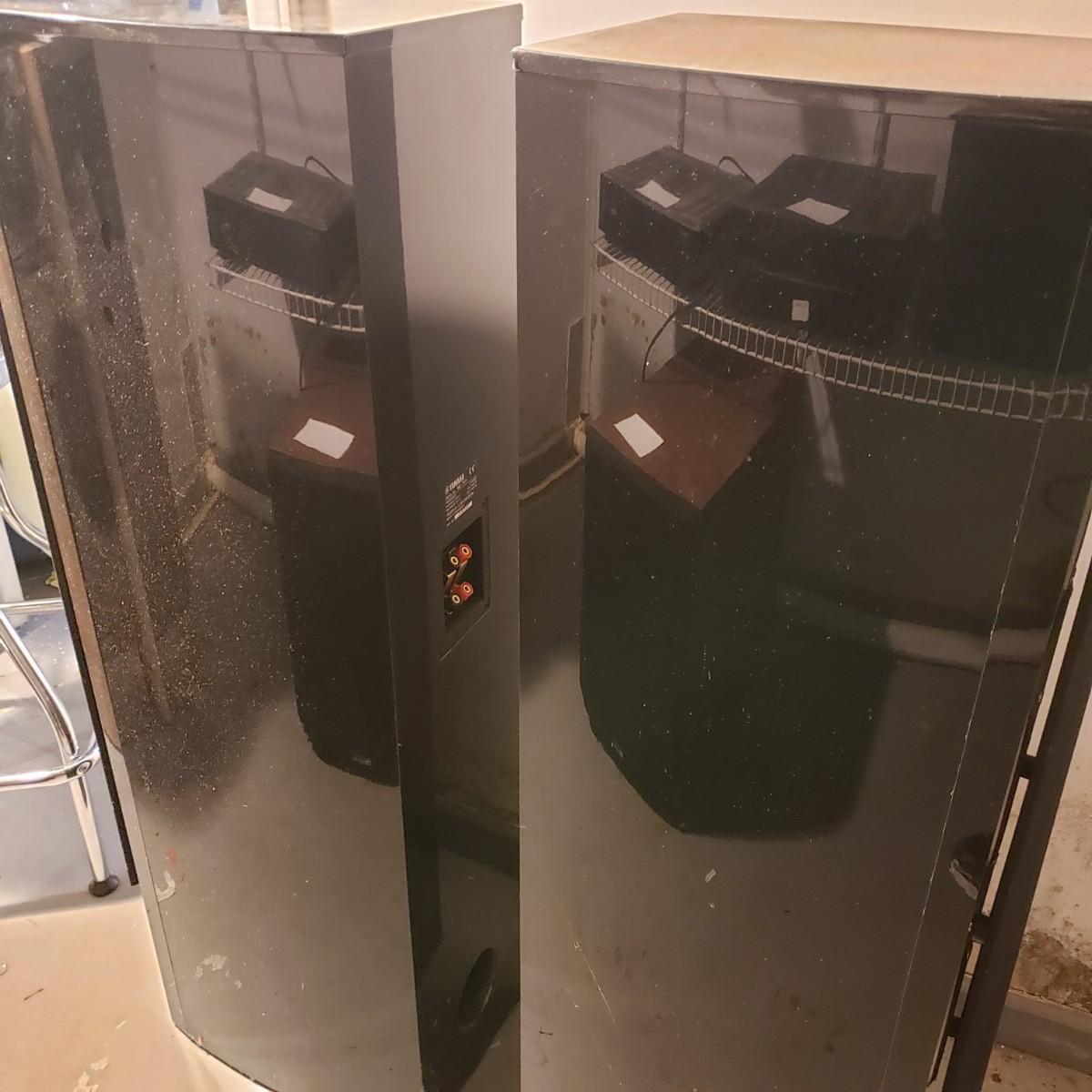These speakers have not been tested. They measure 9" x 15" x 44"H. They have a black glossy finish.