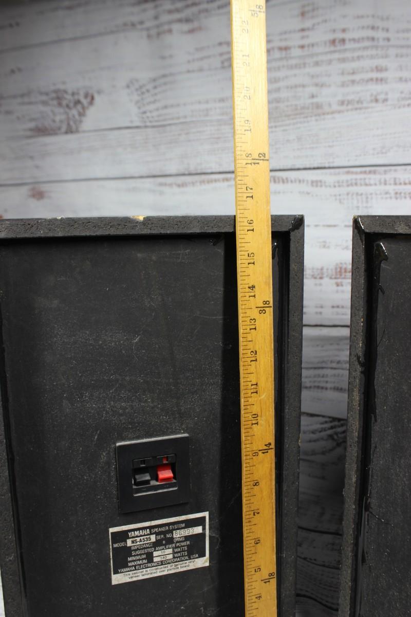 Pair of Yamaha 3 way bookshelf speakers. Model #NS-A535. Have some signs of use/age. Stand about 16.5" tall. Untested.