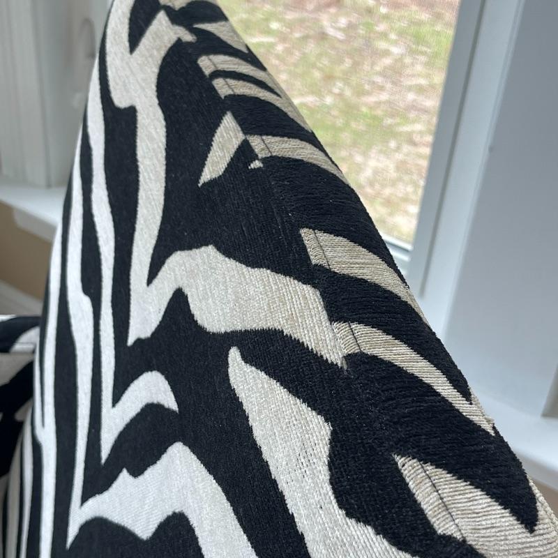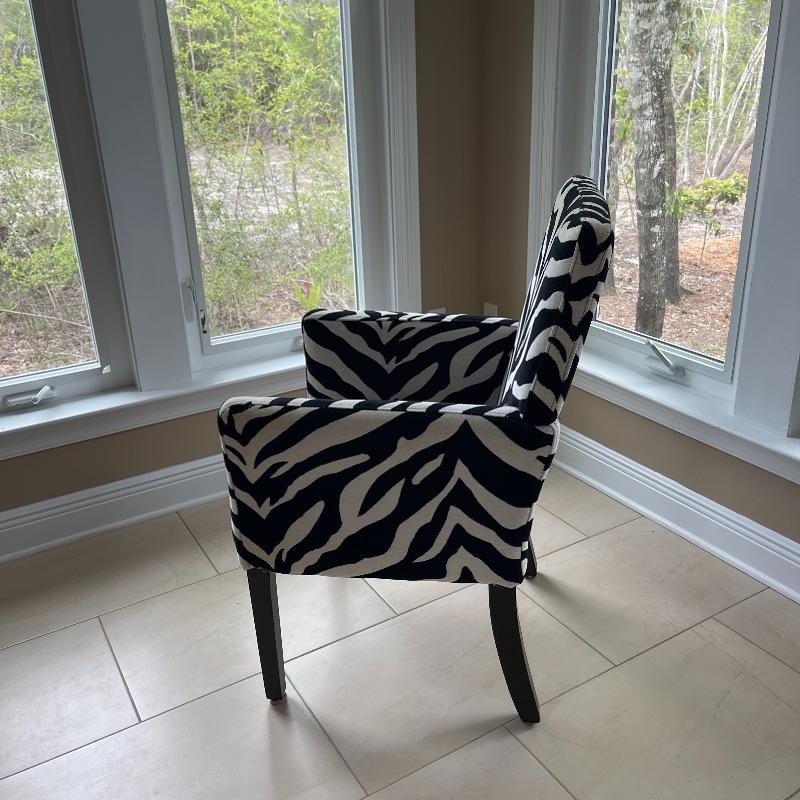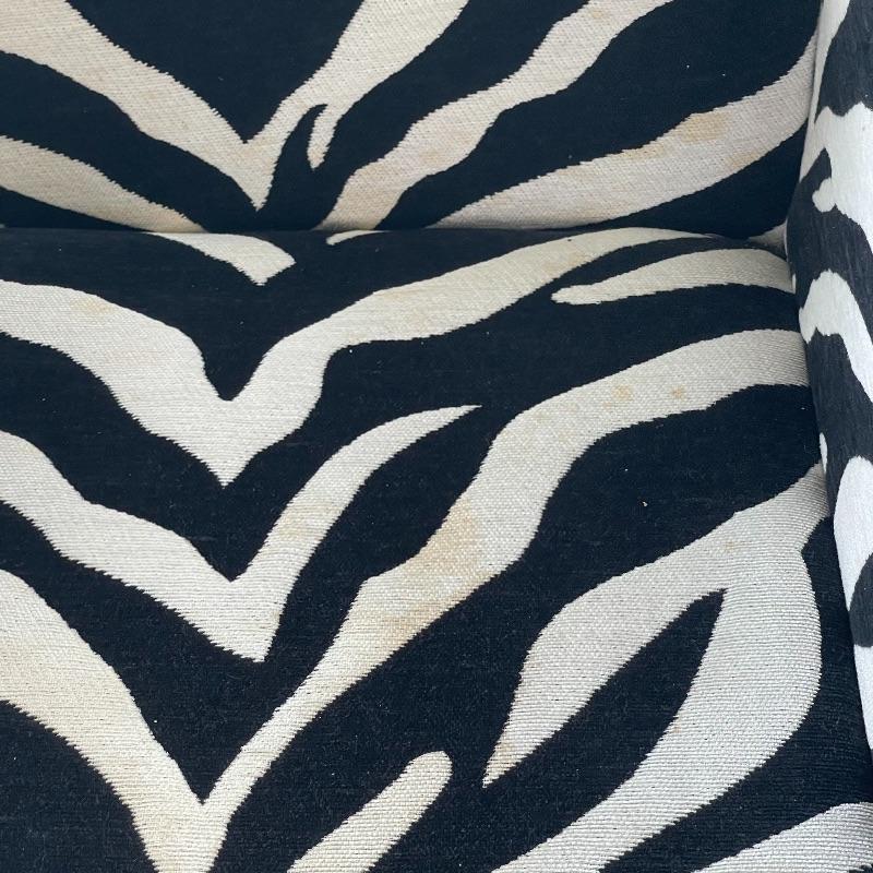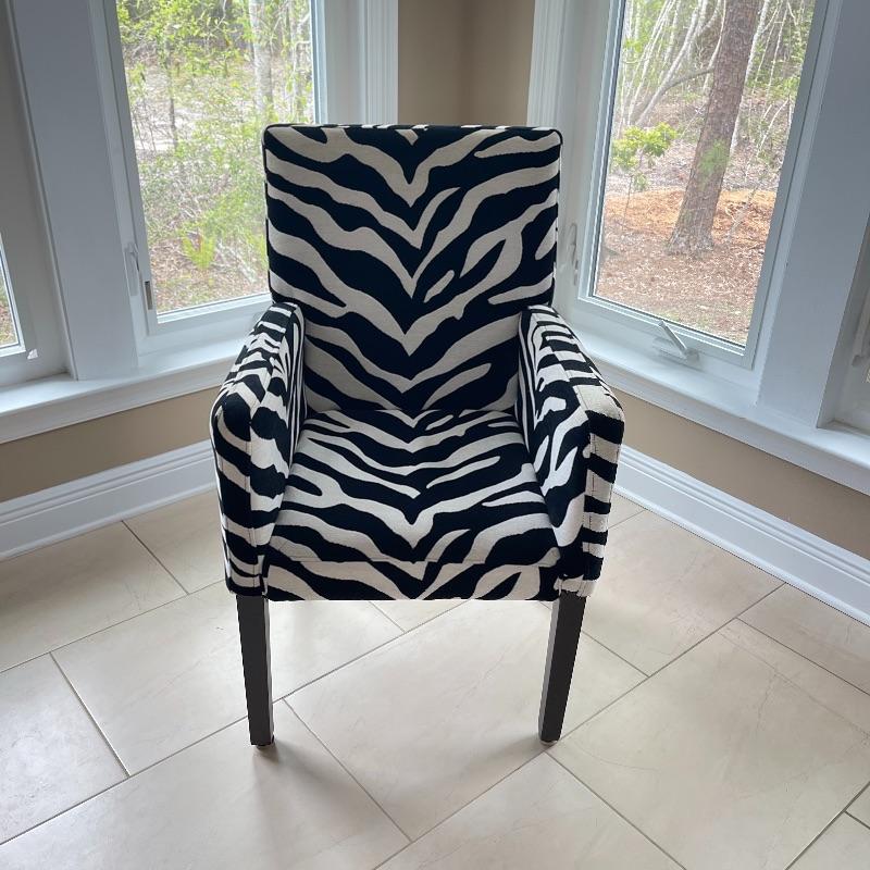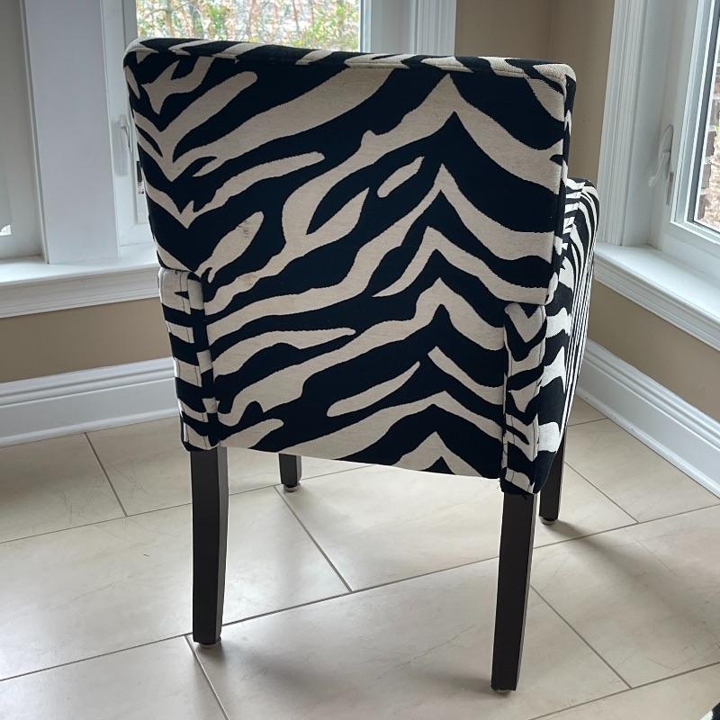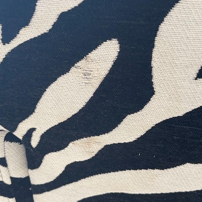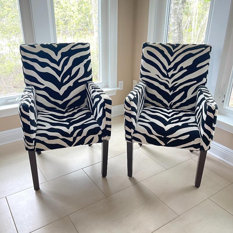 Great accent pieces! Fabric shows little wear. No Rips or Tears. Dark brown wood legs. Chairs will need just a little extra cleaning.