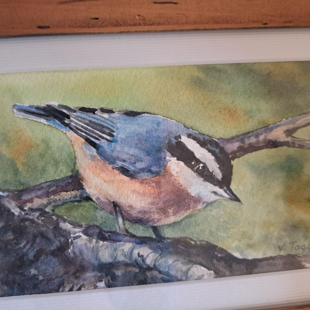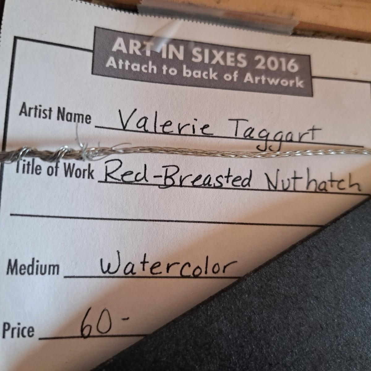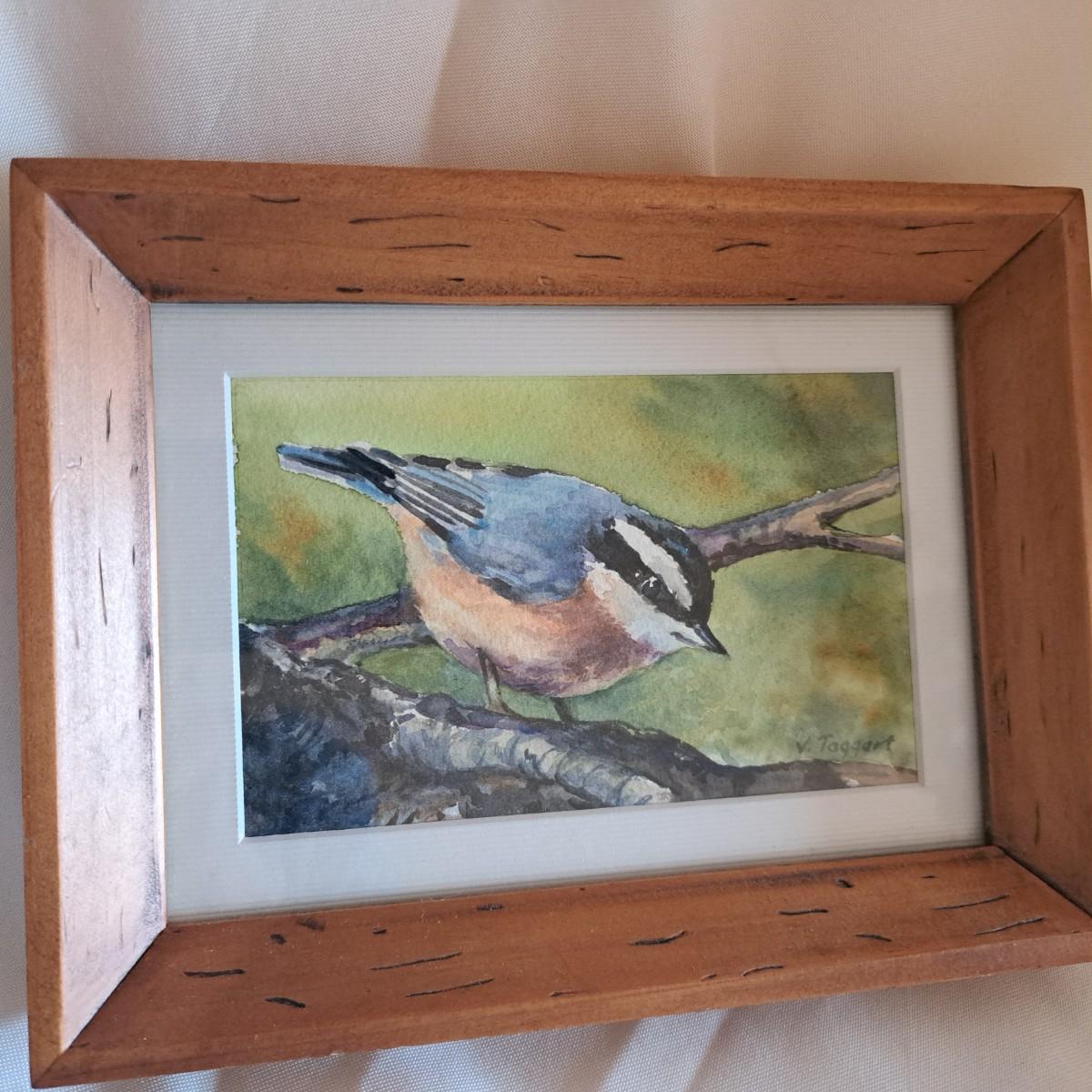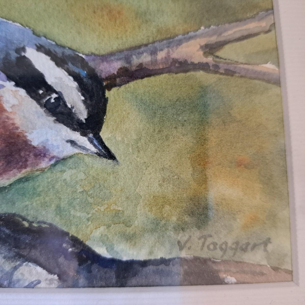 Two original watercolors (not under glass) by artist Valerie Taggart, each 6.5" x 8," the first titled, "Chickadee" and the second, "Red- Breasted Nuthatch." Each signed by the artist in lower right corner. Measurements include matts and wooden frames. Shipping available.