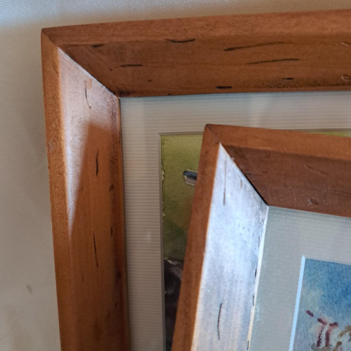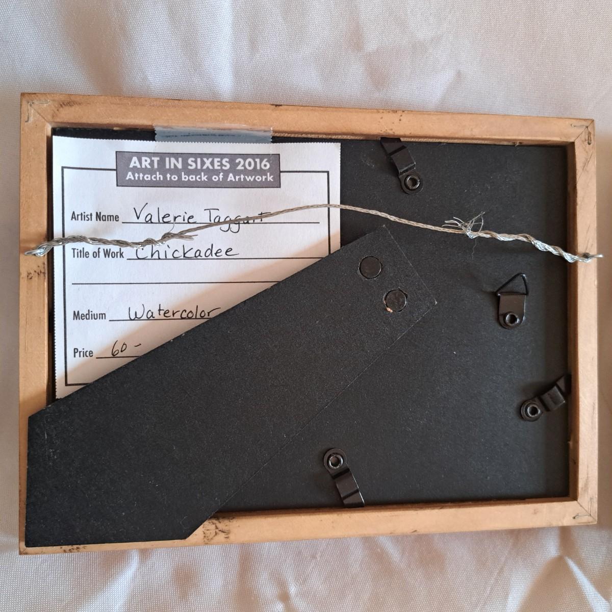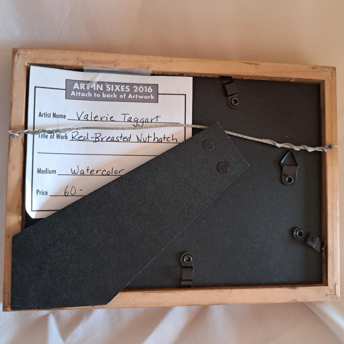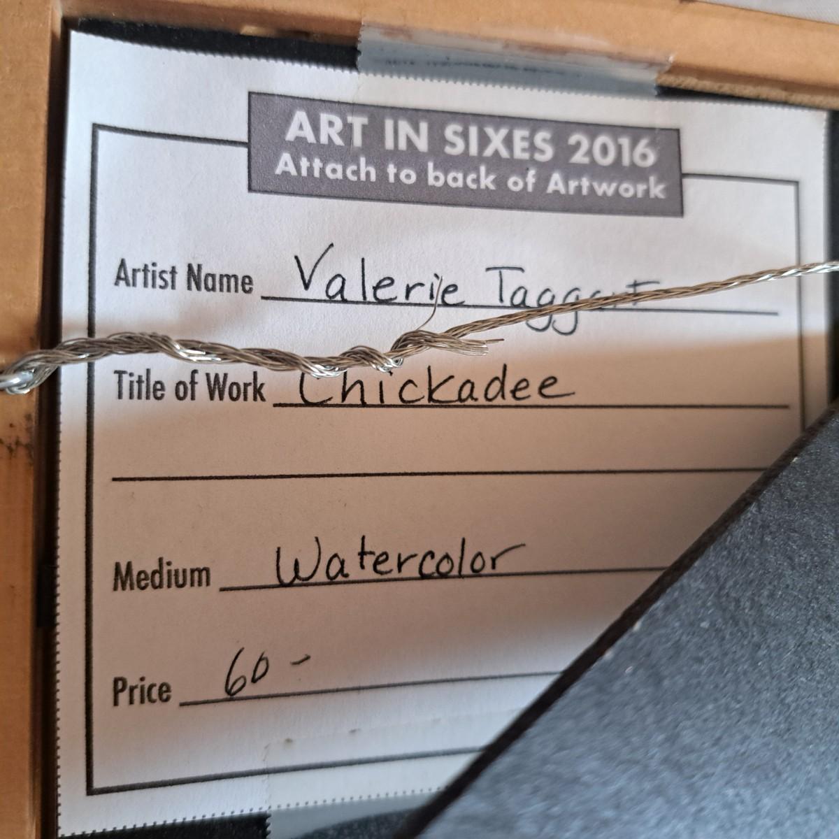 Two original watercolors (not under glass) by artist Valerie Taggart, each 6.5" x 8," the first titled, "Chickadee" and the second, "Red- Breasted Nuthatch." Each signed by the artist in lower right corner. Measurements include matts and wooden frames. Shipping available.