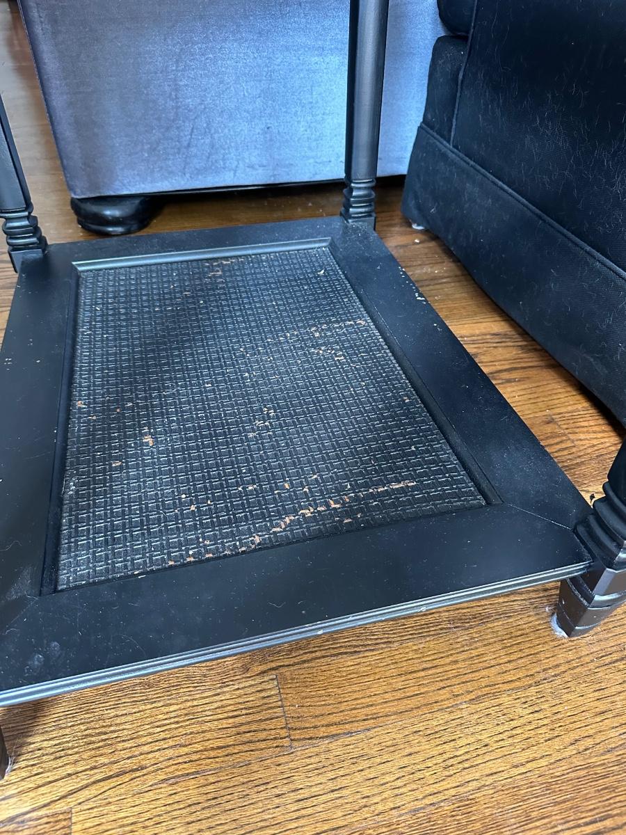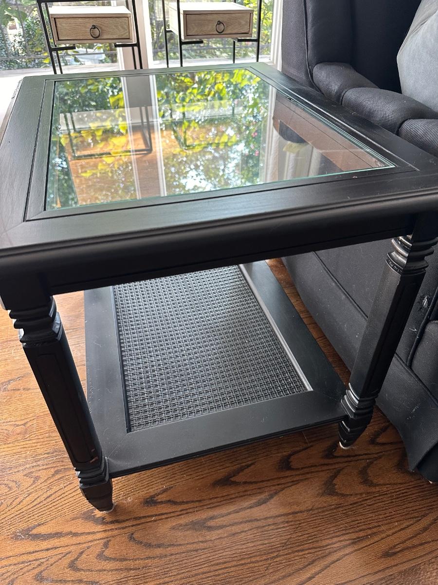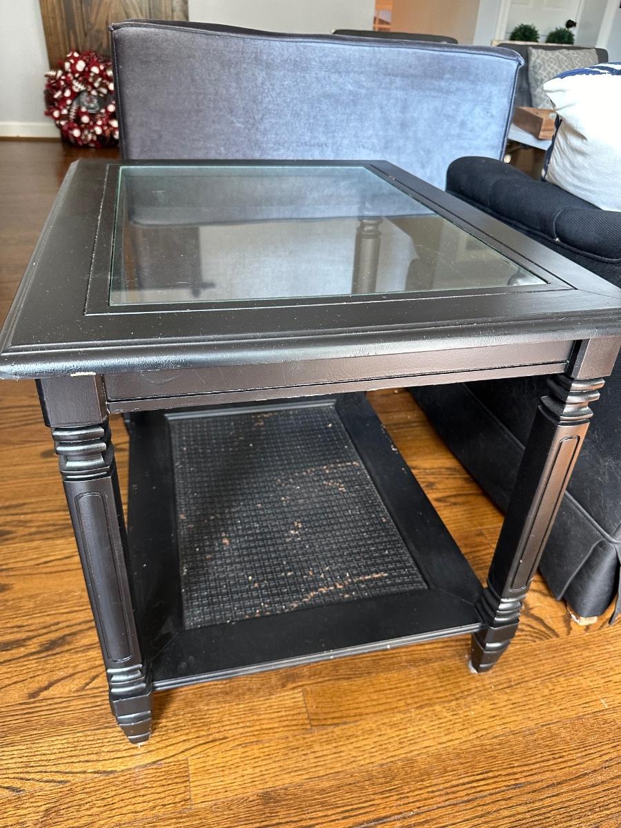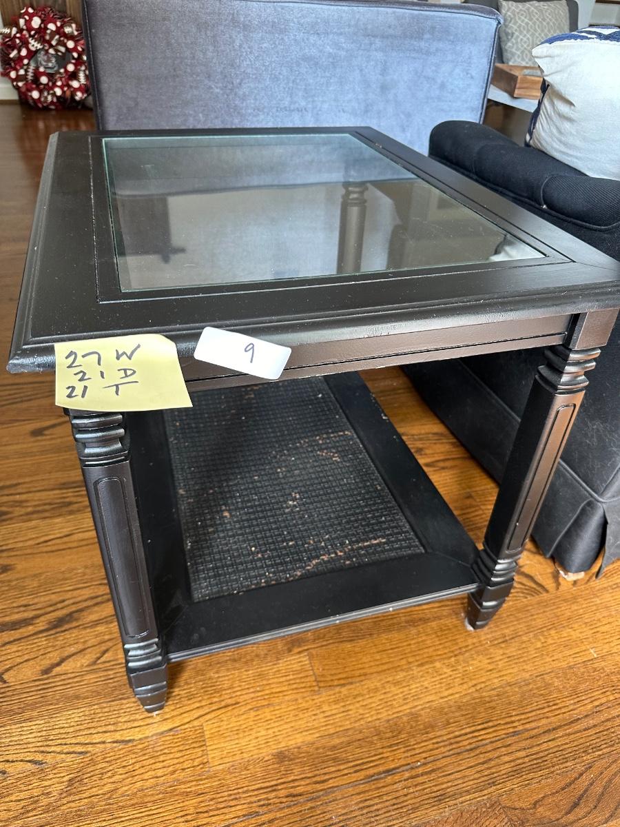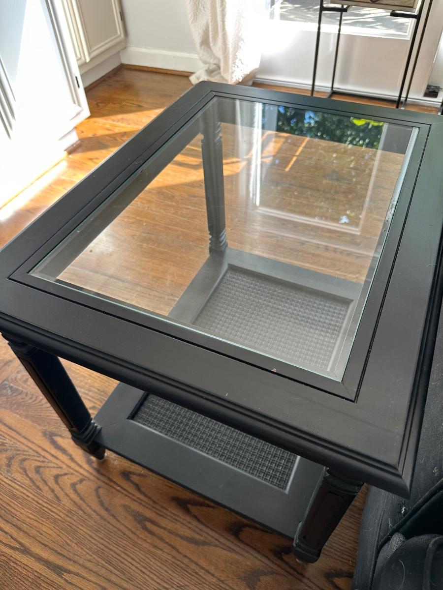 PAIR BLACK PAINTED VINTAGE END TABLES, GLASS TOPS SOME PAINT CHIPPING 27X21X21" TALL