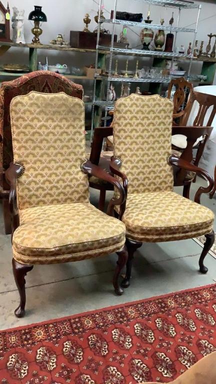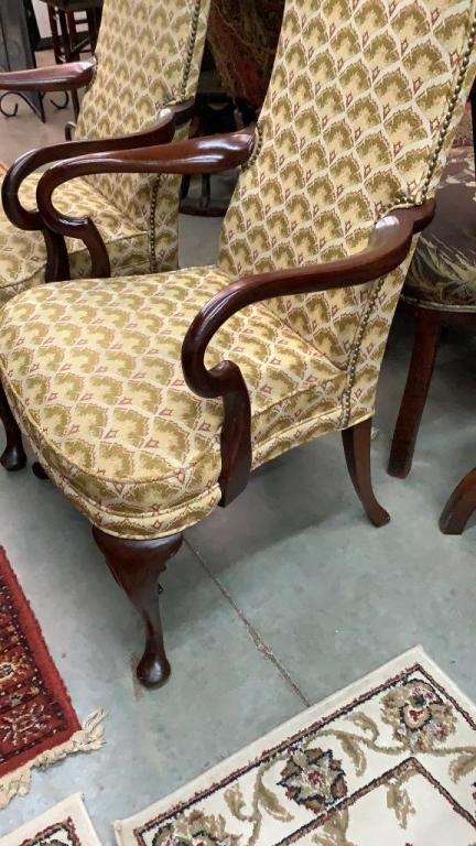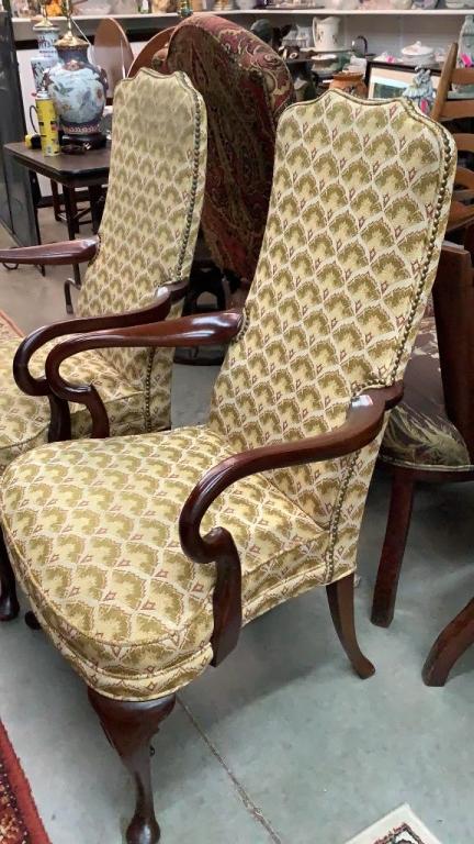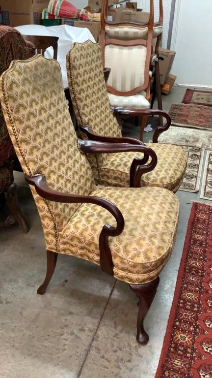 Shapely high backs, goose neck rolled arm restsÂ….tapestry style upholstery in fan designÂ…* some wear to upholstery