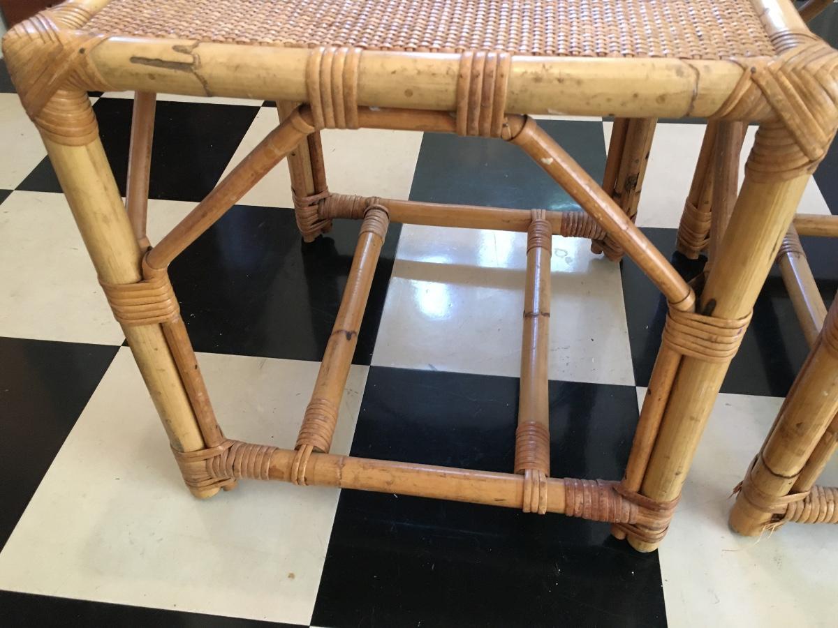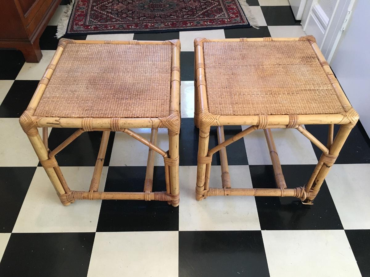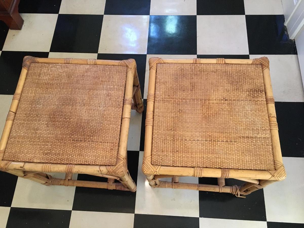 Pair of rattan top and wrapped bamboo framed end tables/ footstools. One leg has slight unraveling others is in excellent condition.