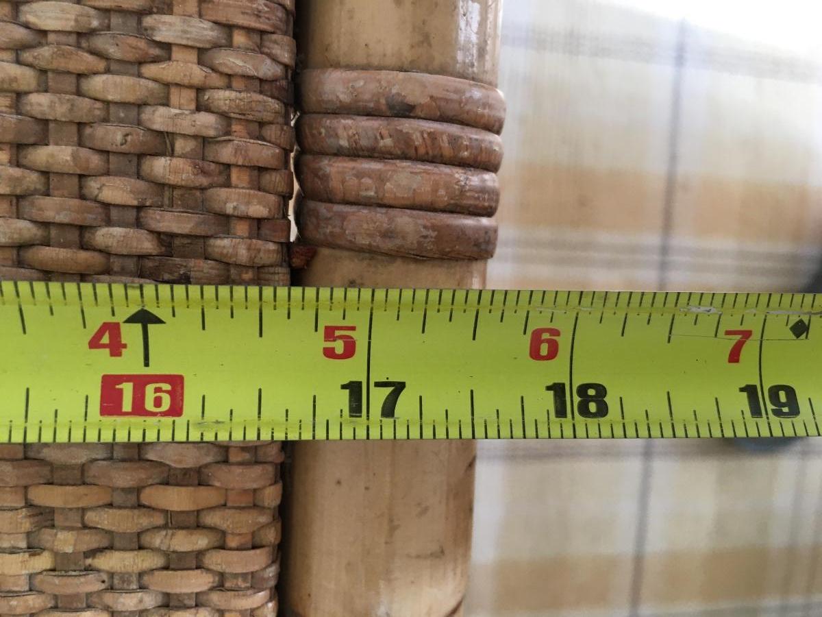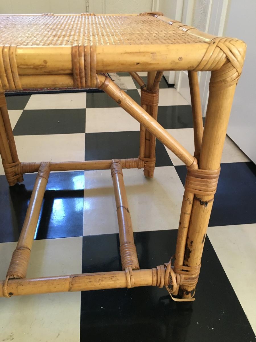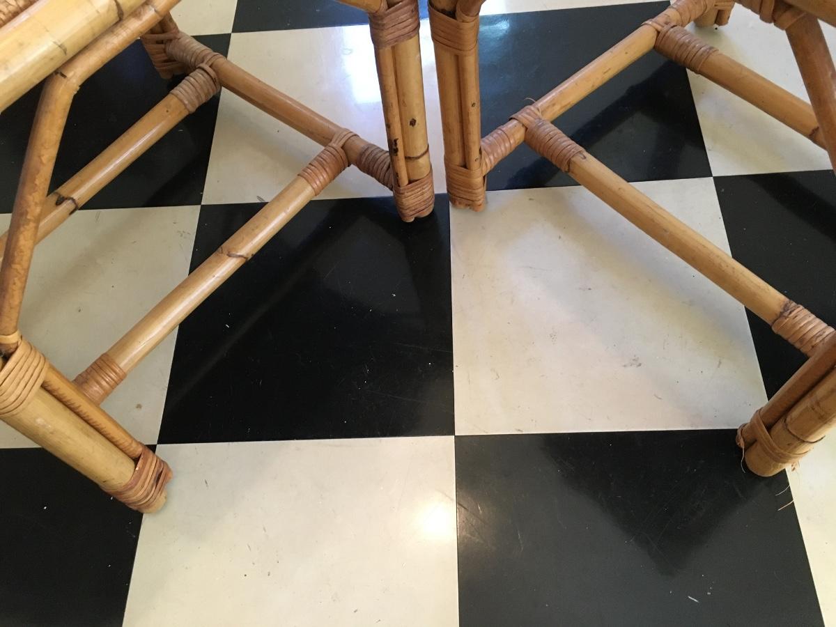 Pair of rattan top and wrapped bamboo framed end tables/ footstools. One leg has slight unraveling others is in excellent condition.