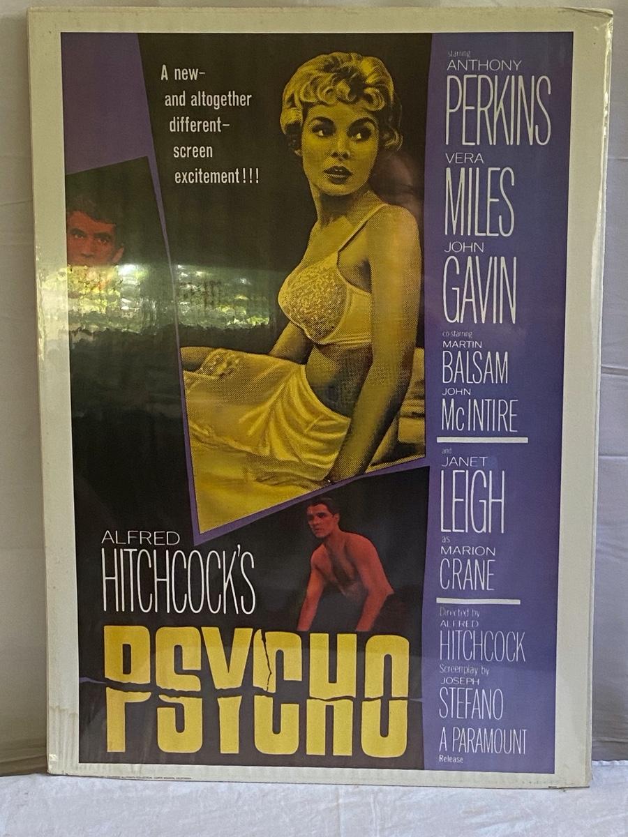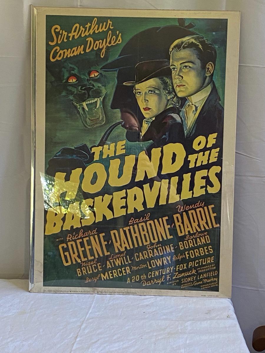First, Alfred Hitchcock's "Psycho" movie poster, in good condition with credits listed next to stunning Vera Miles. The second poster The Hounds of the Baskervilles, captures sense of fright and serious detective with his pipe. Size 20" X 26" and have faint signs of water damage on bottom left corners.