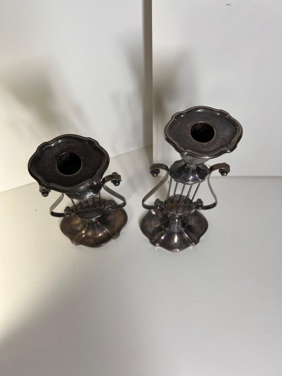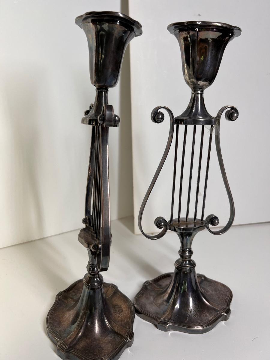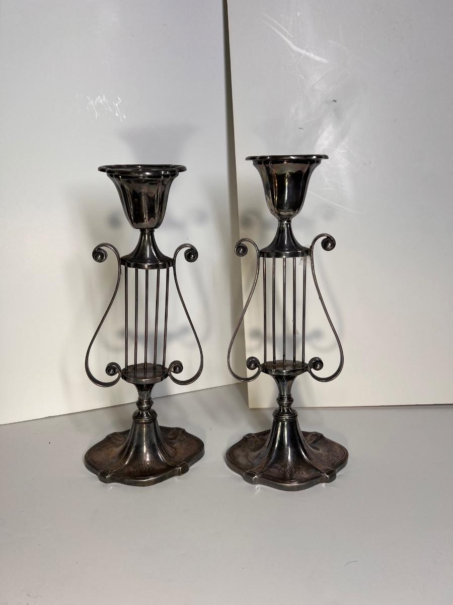 Pair Silver Plated Harp Candle Holders