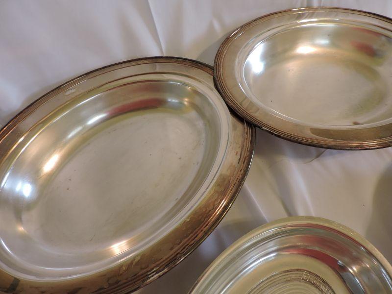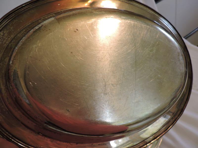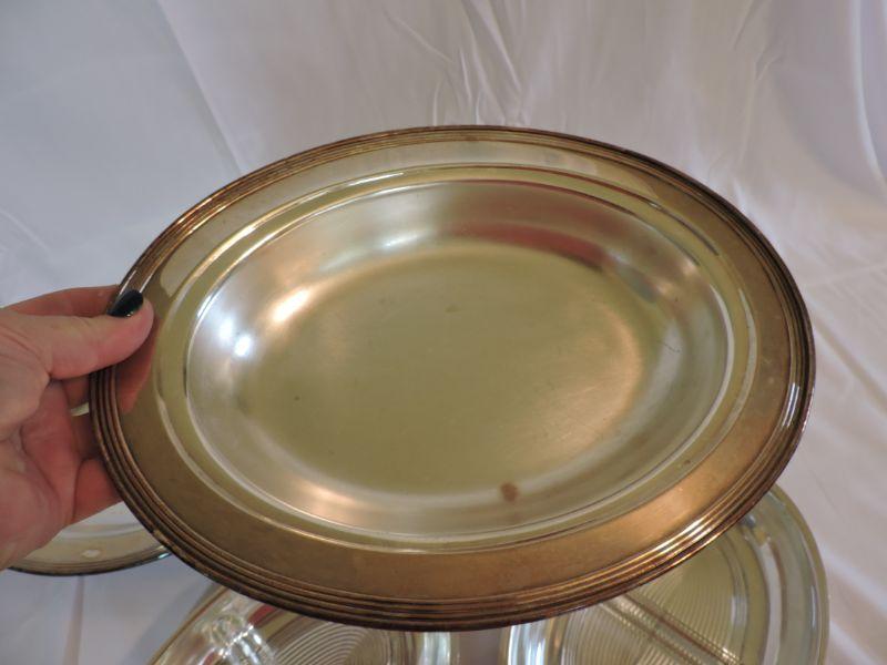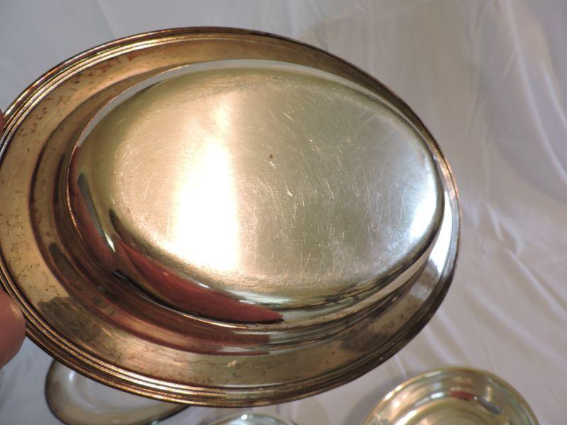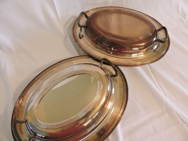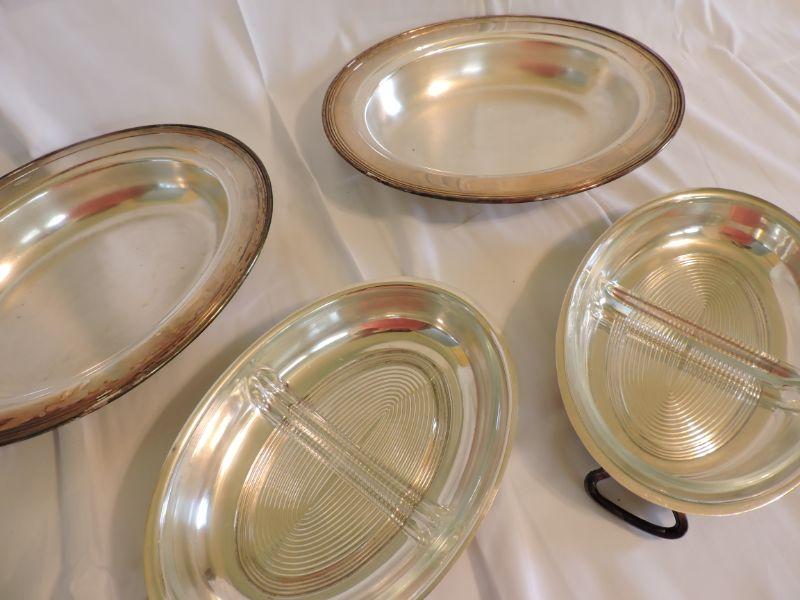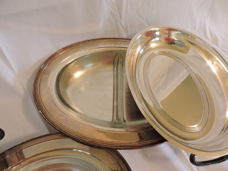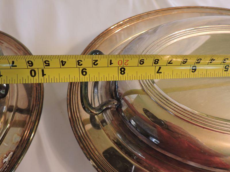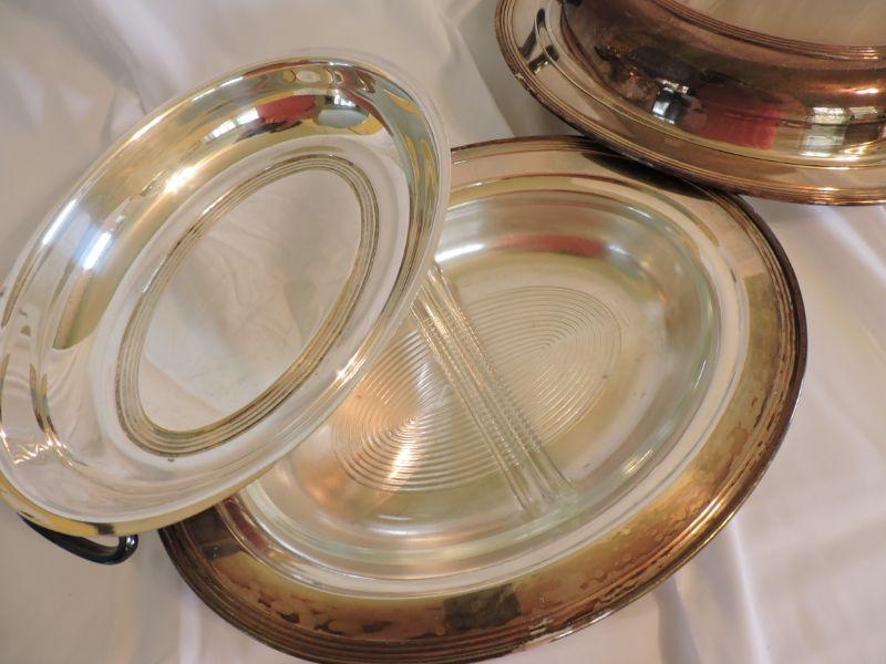 Silver plate dishes with cover and glass insert. **Please read Terms and Conditions before placing a bid. Pick up is Saturday, November 30 from 9am to 3pm in Bridgeton, NJ. All sales are final. All sales are as is, where is. Please review all photos. Any props included in photos are not included in listing. All measurements are approximate.