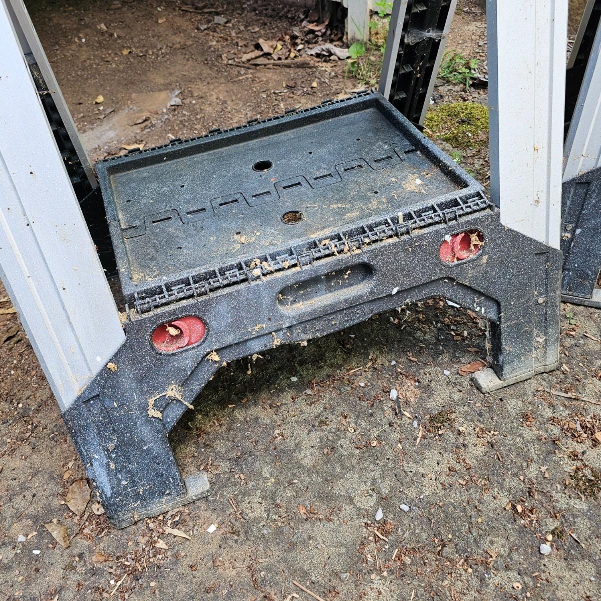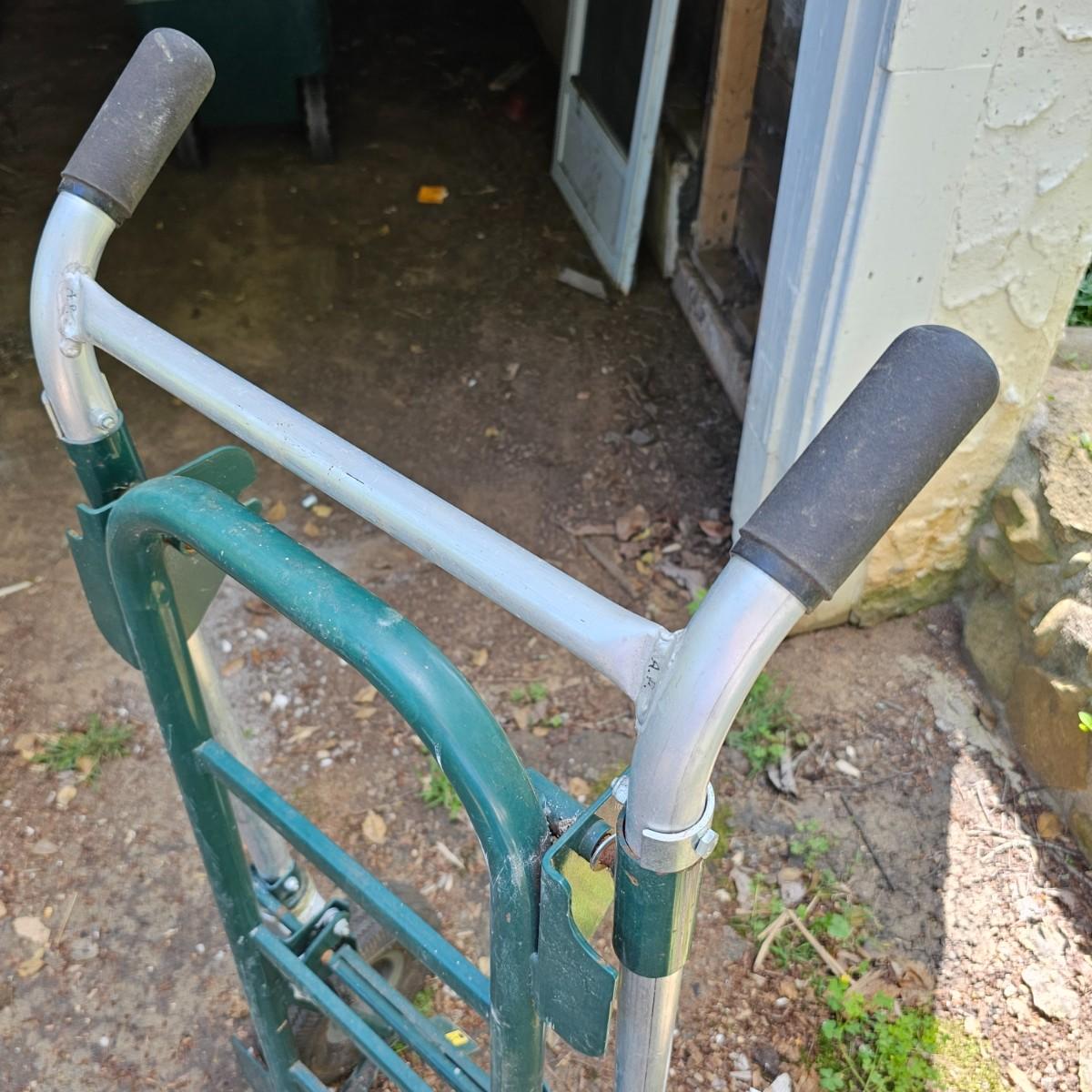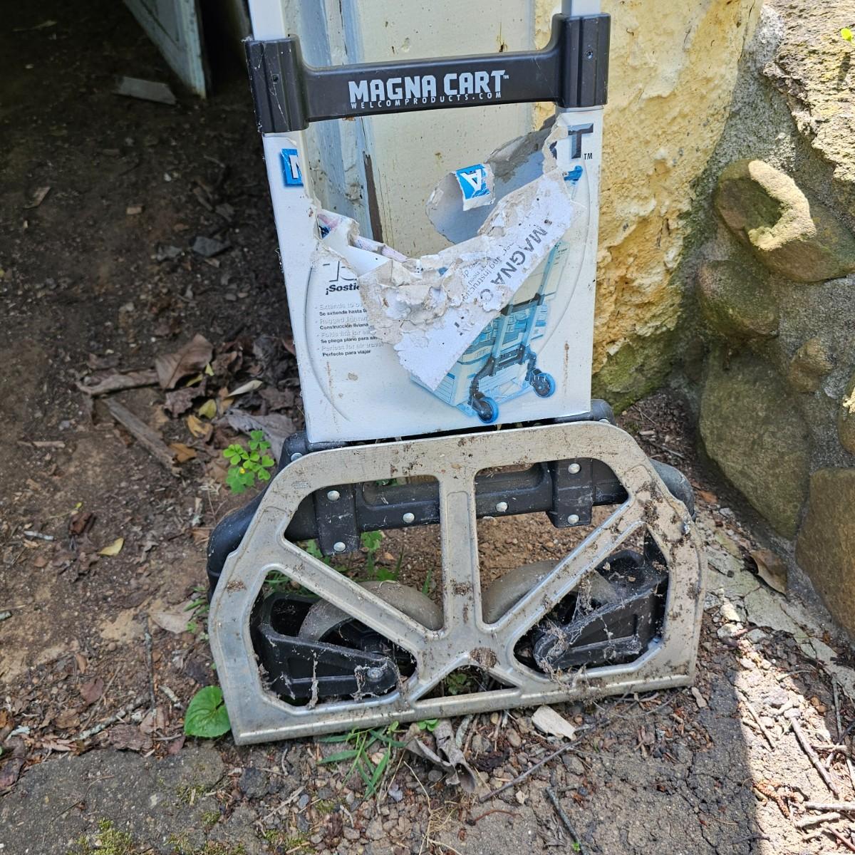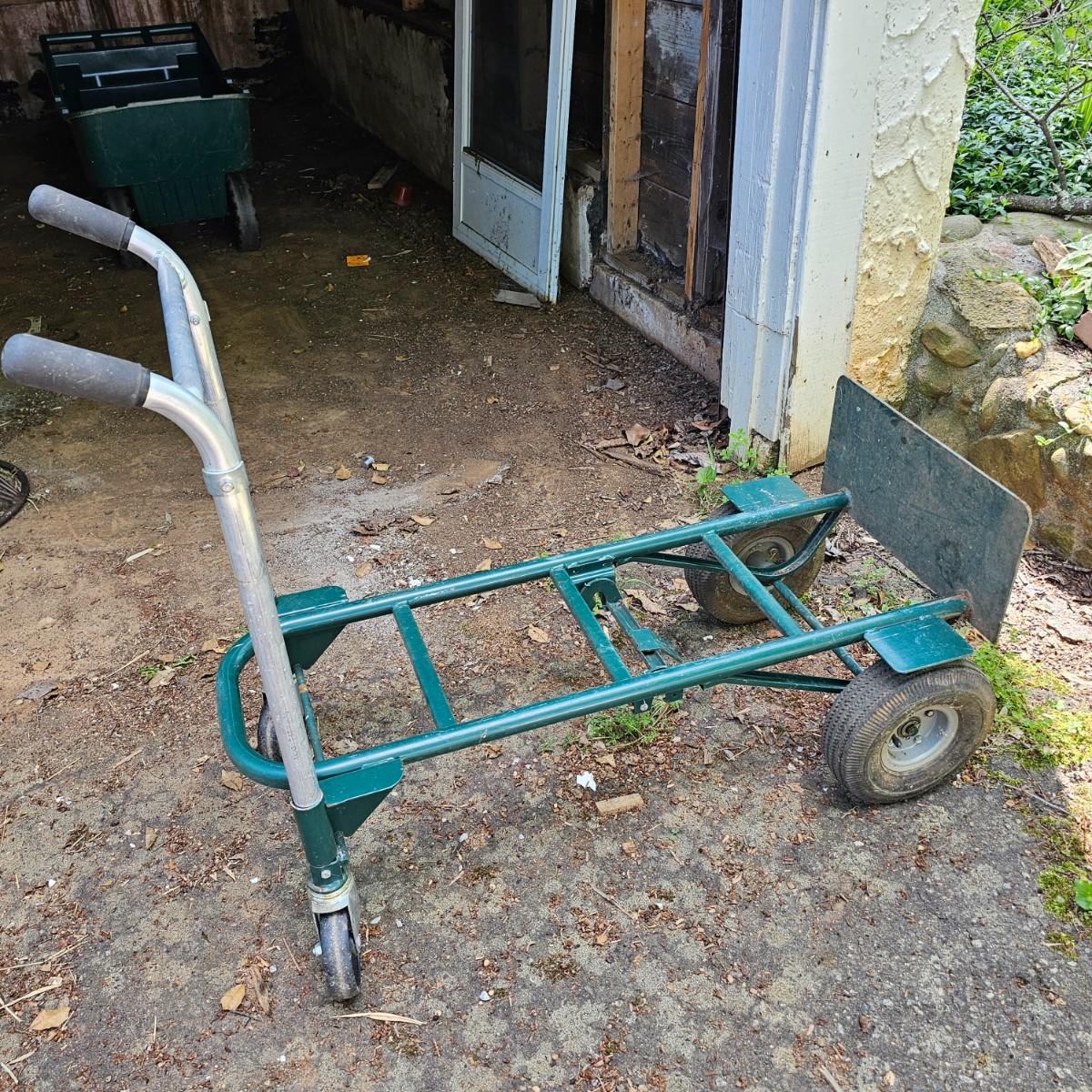 One pair Stanley plastic sawhorses, Fat Max model. Fold flat for easy storage. Each measures 27" W x 19"D x 31"H, folds to 3" flat. Some paint and wear. Also one Harper convertible hand truck. Use upright, measures 21"W x 18"D x 48"H. Convert handle and lay flat, it is 42"W x 21"D x 36"H. Hard rubber and pneumatic tires, tires not currently inflated. Last item is a Magna Cart small folding hand truck with extendable handle. Measures 16" W x 18"D x 39"H. All items show some wear. See photos for details. Local pickup only.