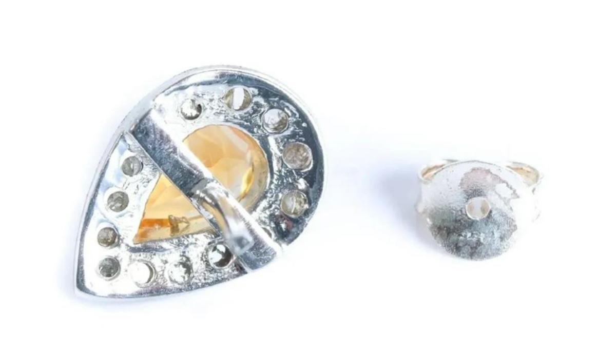 Pair of sterling silver and pear shaped natural citrine earrings with rose cut white diamond bezels. Stamped 925. Approx. 3.10 CTTW of citrine and .70 CTTW of diamonds. Approx. length .62 inches. Approx. overall weight 3.72 grams total.