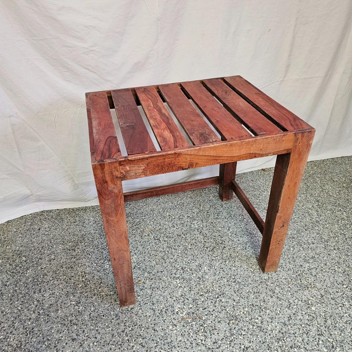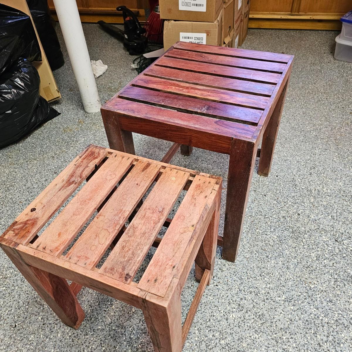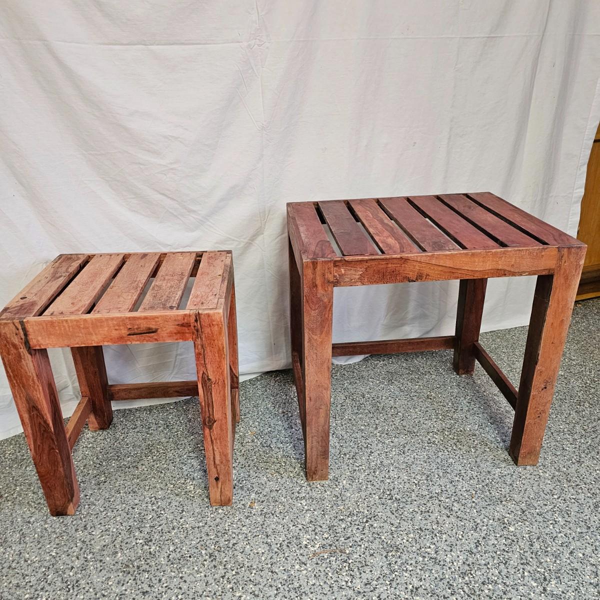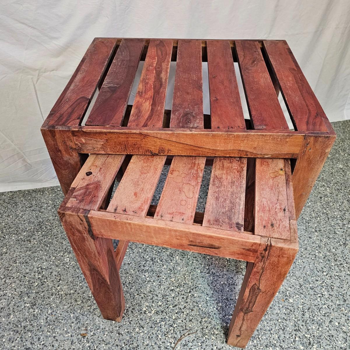 A stacking pair of teak wood end tables. Larger table is 23.5" x 19.5" x 23" h, smaller is 15" x 17" x 20"h. Solid wood, heavy. Some slight blemishes on tops, see photos for details. Local pickup only.