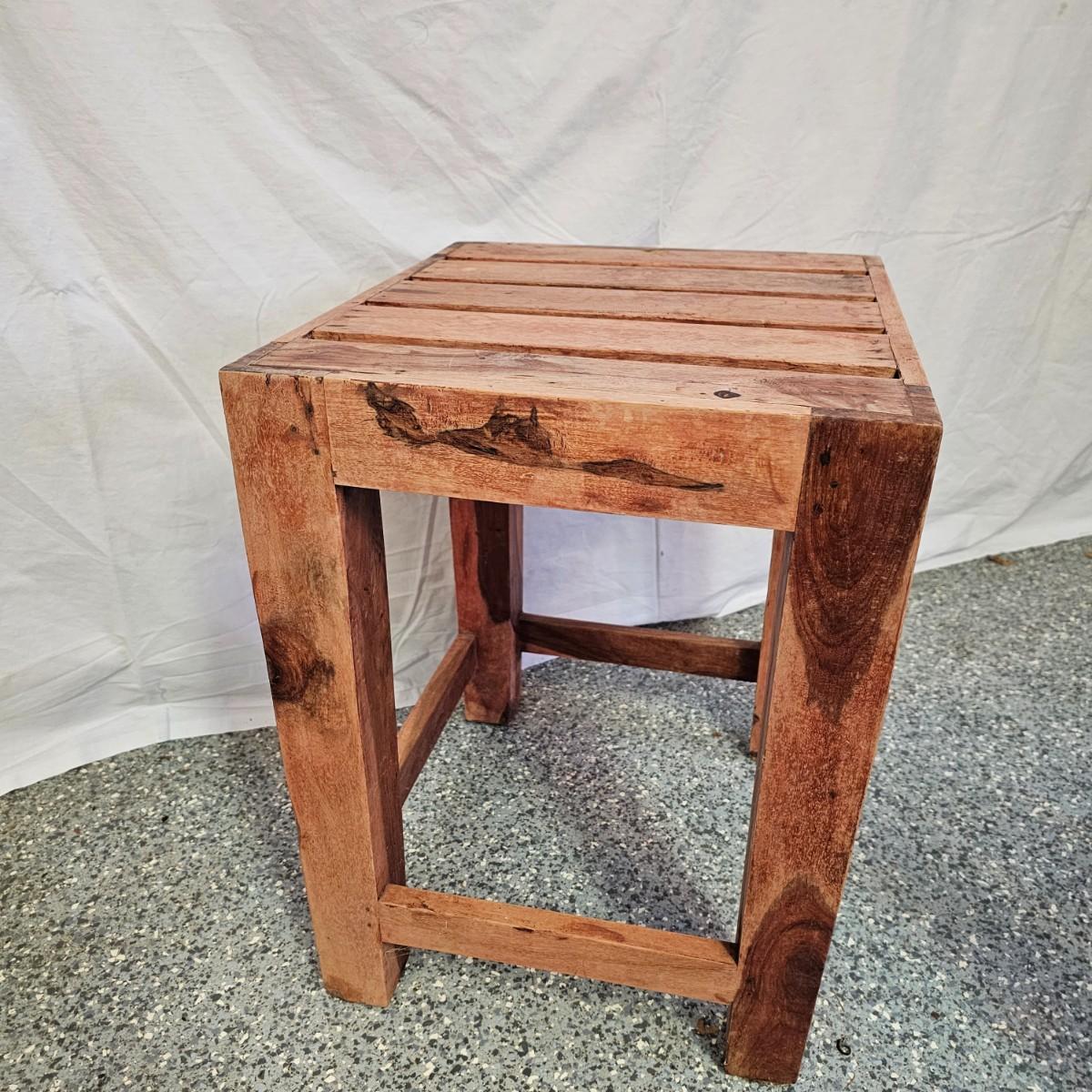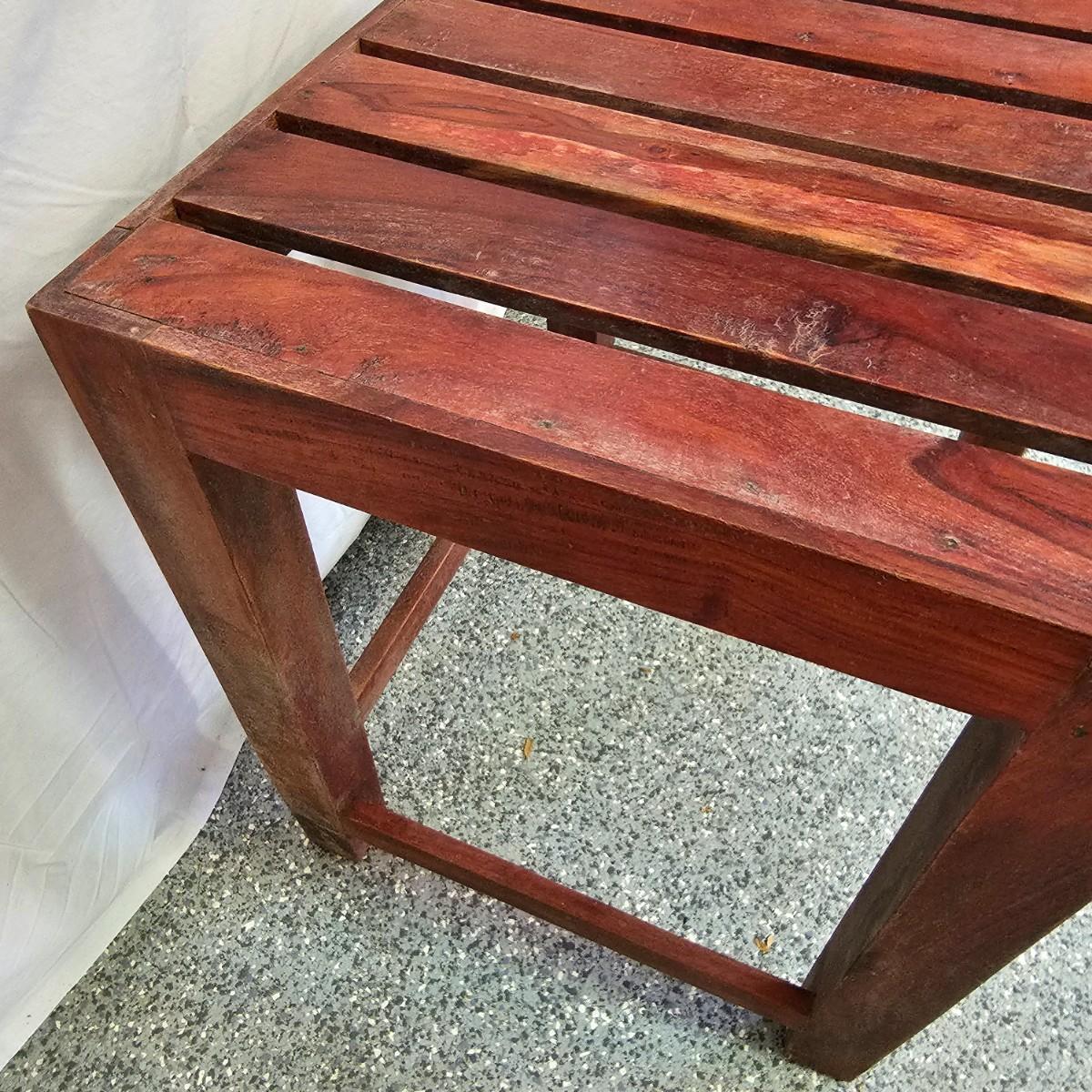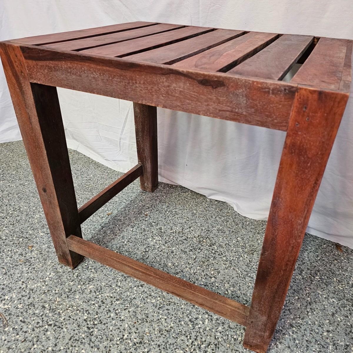 A stacking pair of teak wood end tables. Larger table is 23.5" x 19.5" x 23" h, smaller is 15" x 17" x 20"h. Solid wood, heavy. Some slight blemishes on tops, see photos for details. Local pickup only.