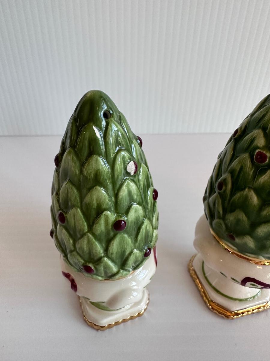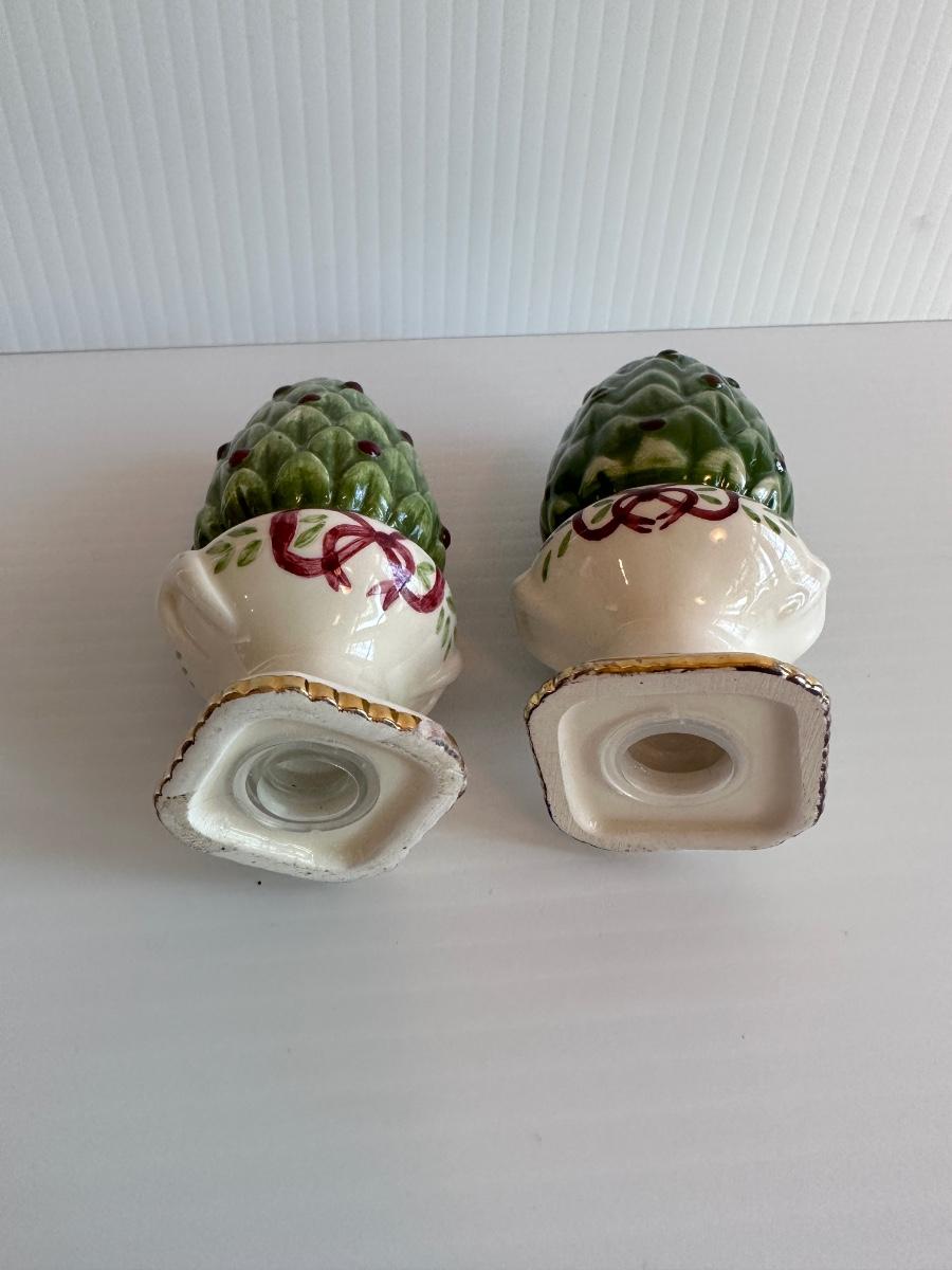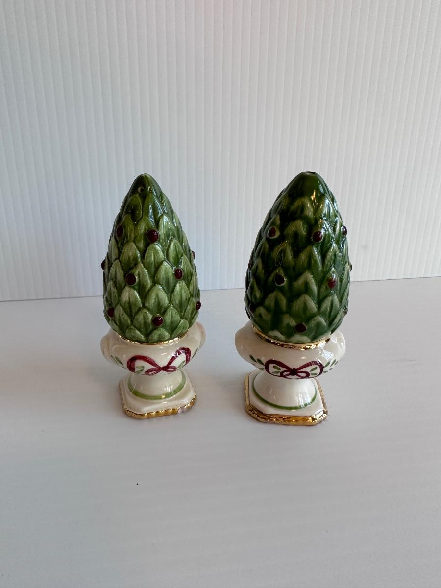 Pair of ceramic topiary salt and pepper shakers. Small chip shown in photos.