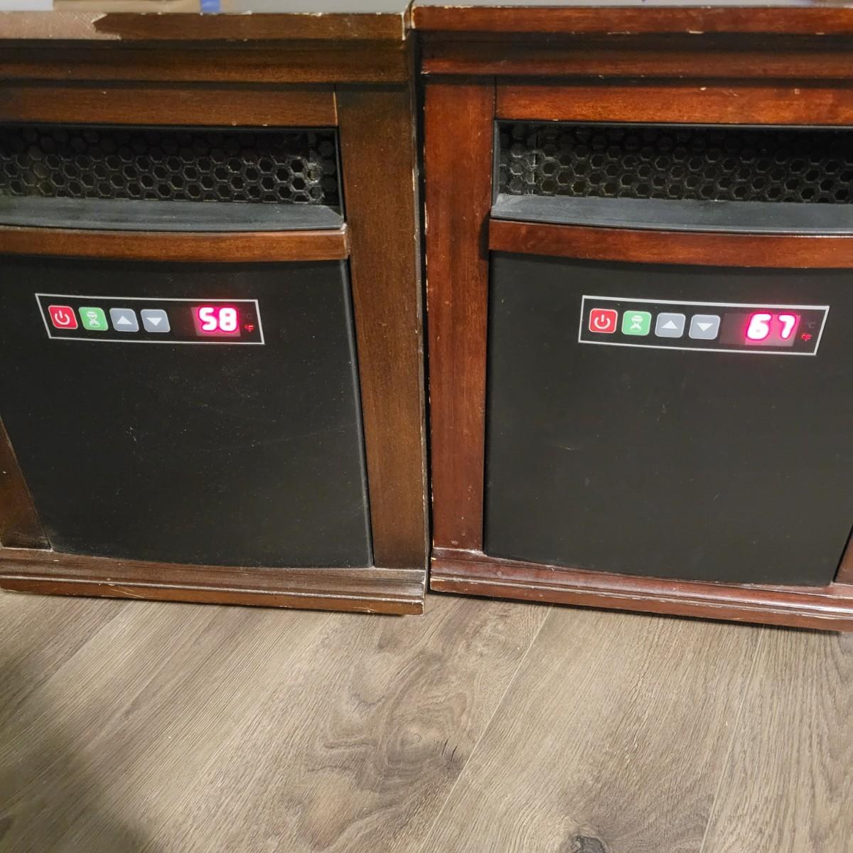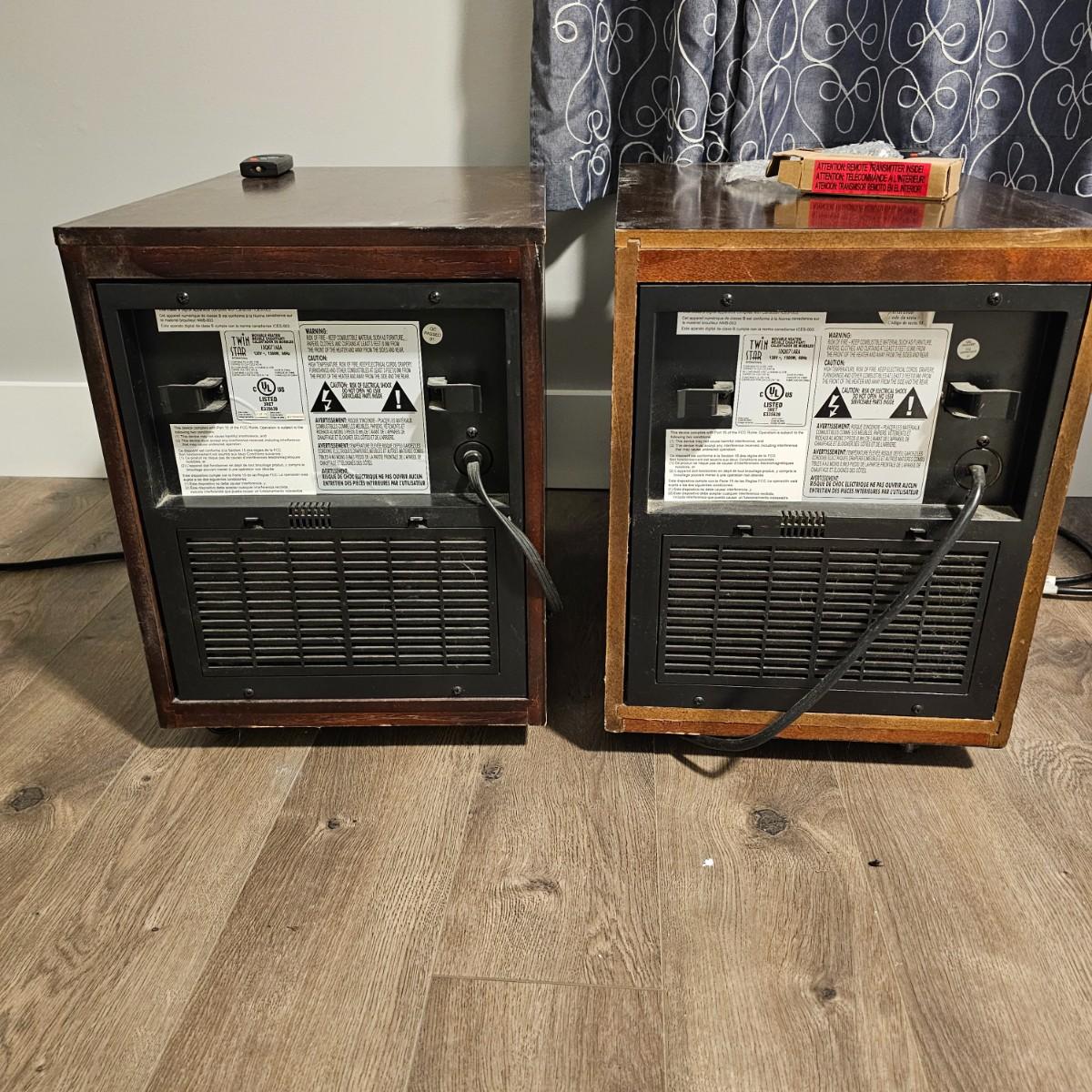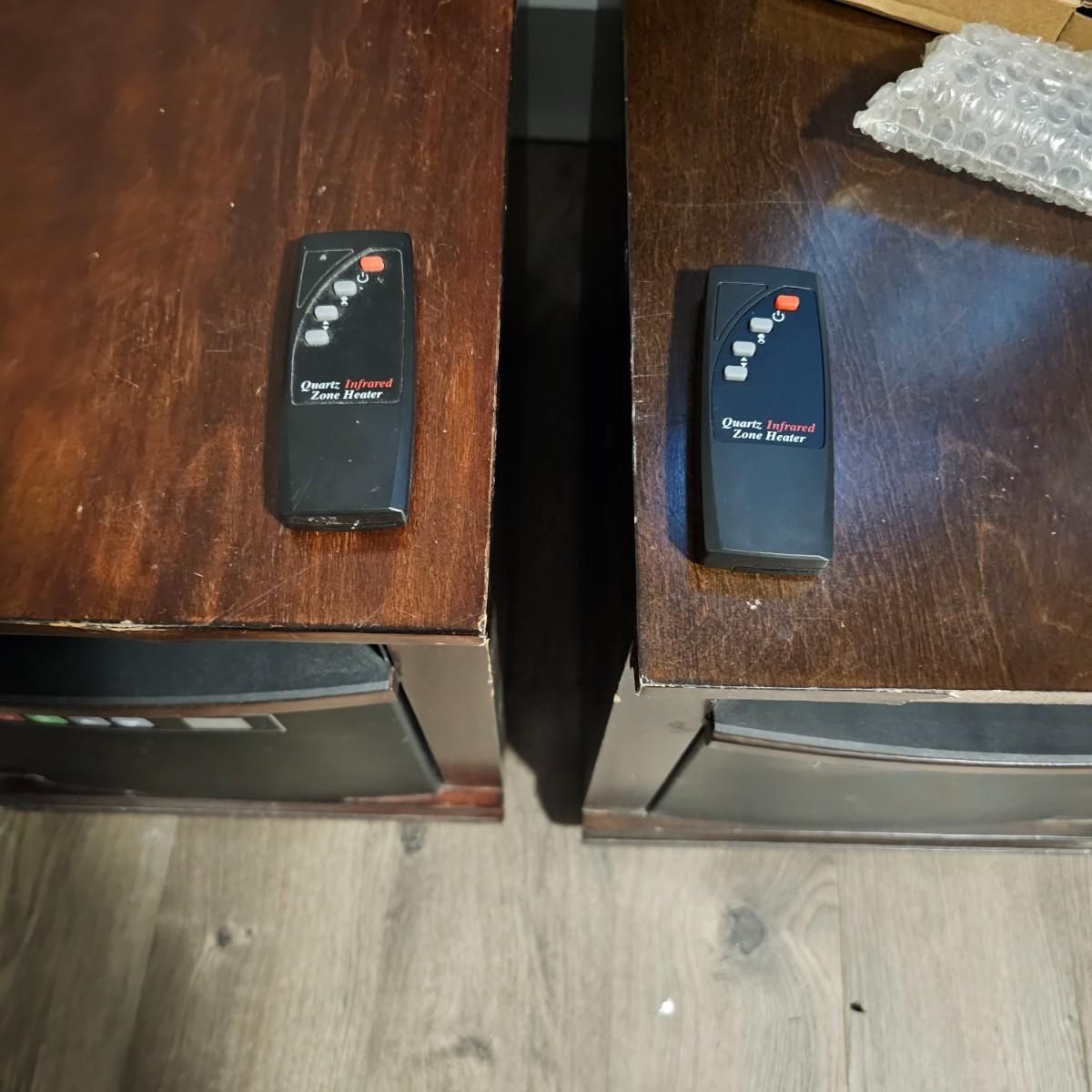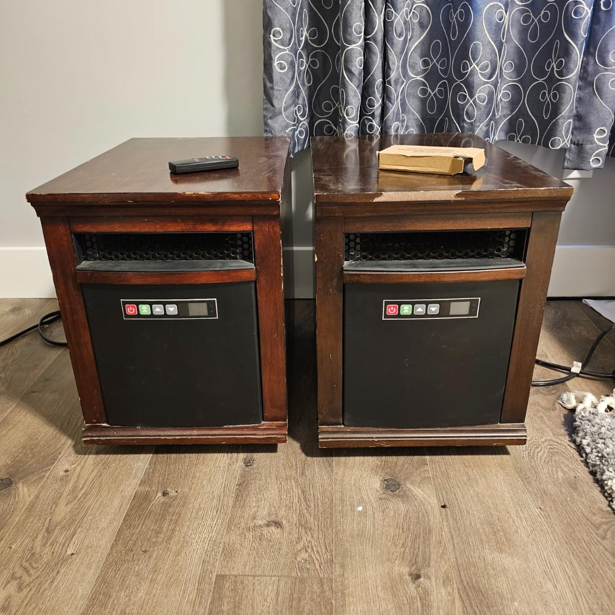 A pair of quartz infrared heaters by Twin Star. Both units are the same model and have remote controls. Adjustable temperature and fan. Heaters powered on when plugged in, and remotes worked. 13.5" x 19.5" x 18"H. Some nicks/chips in surfaces, see photos for details. Local pickup only.