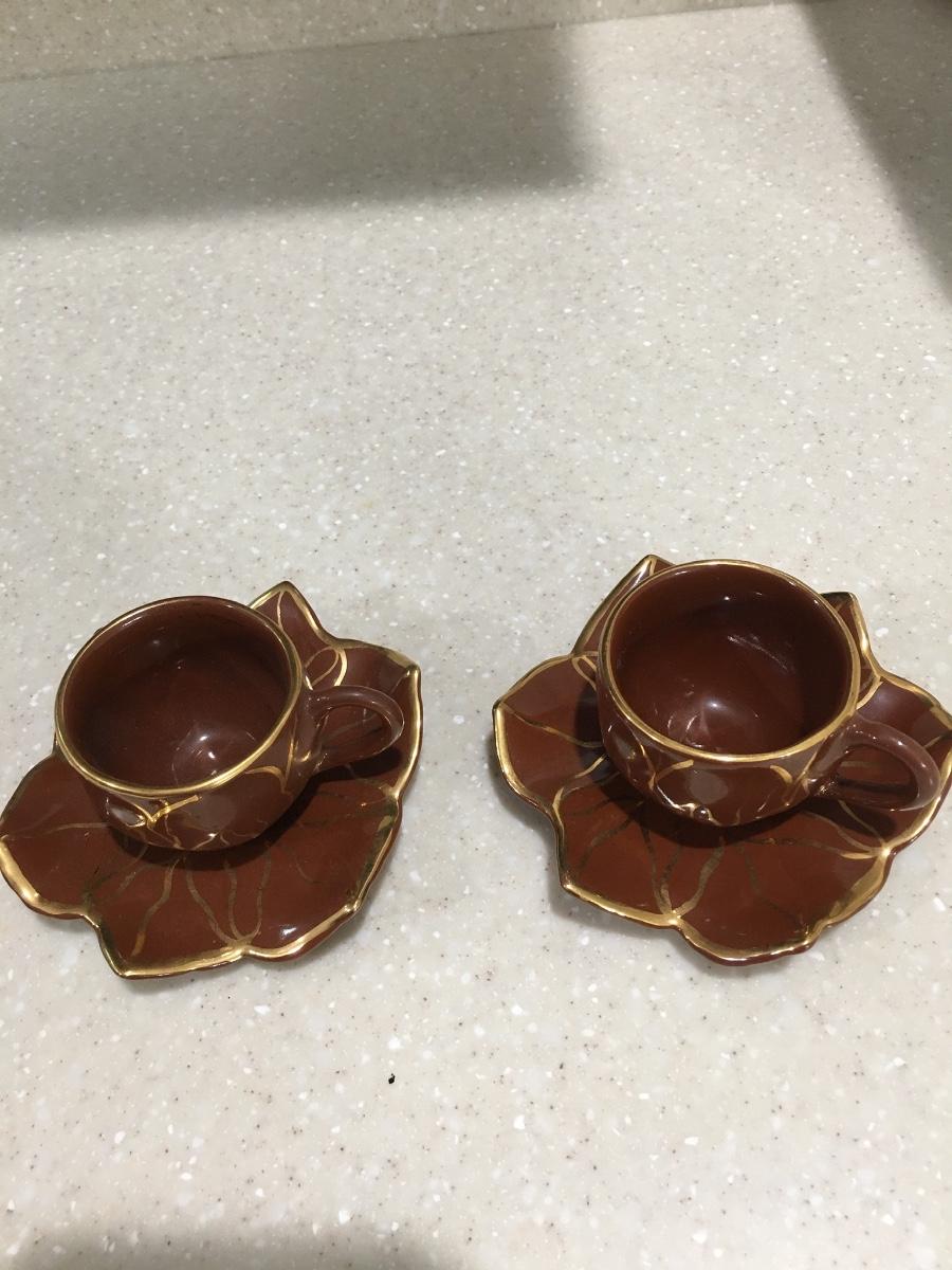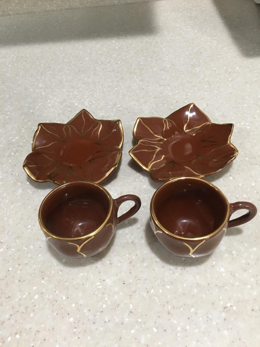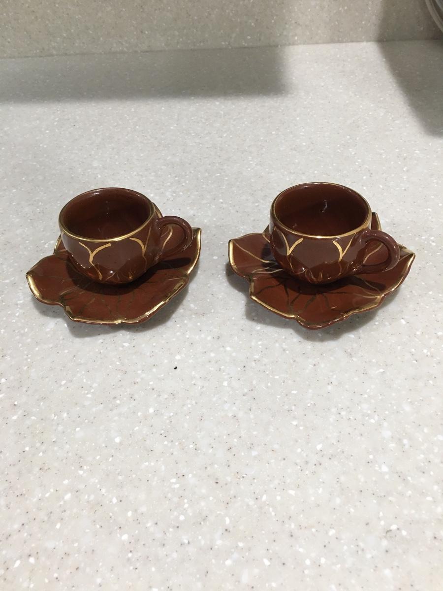 This is an adorable Vintage 2 pc set of demitasse cups with matching leaf design saucers. Chocolate brown color with gold trim. The cups are 2”wide and 2” tall saucers are 4.5 “ wide. No chips, cracks or repairs.