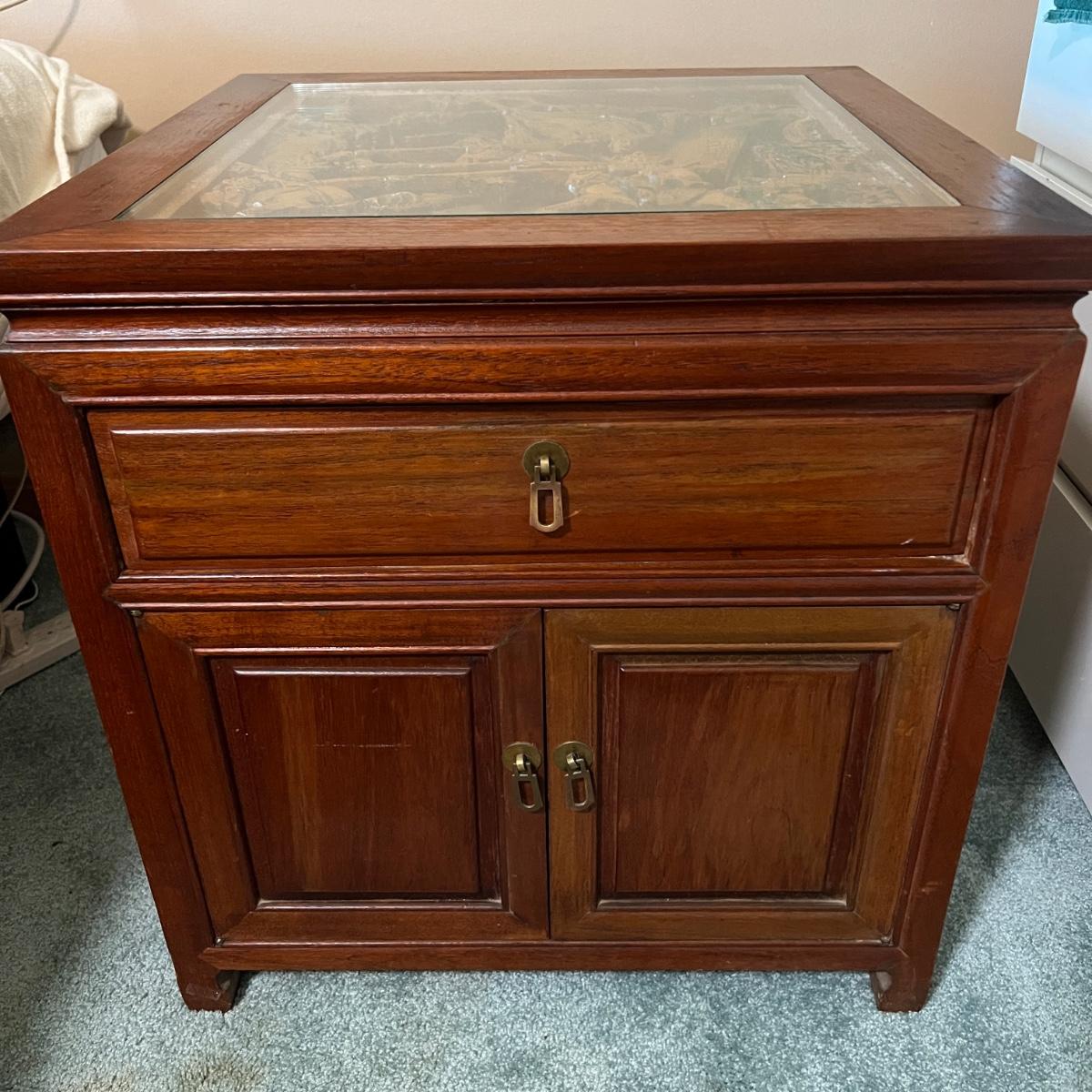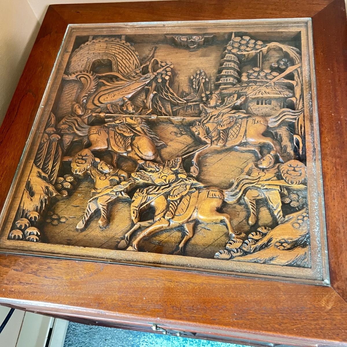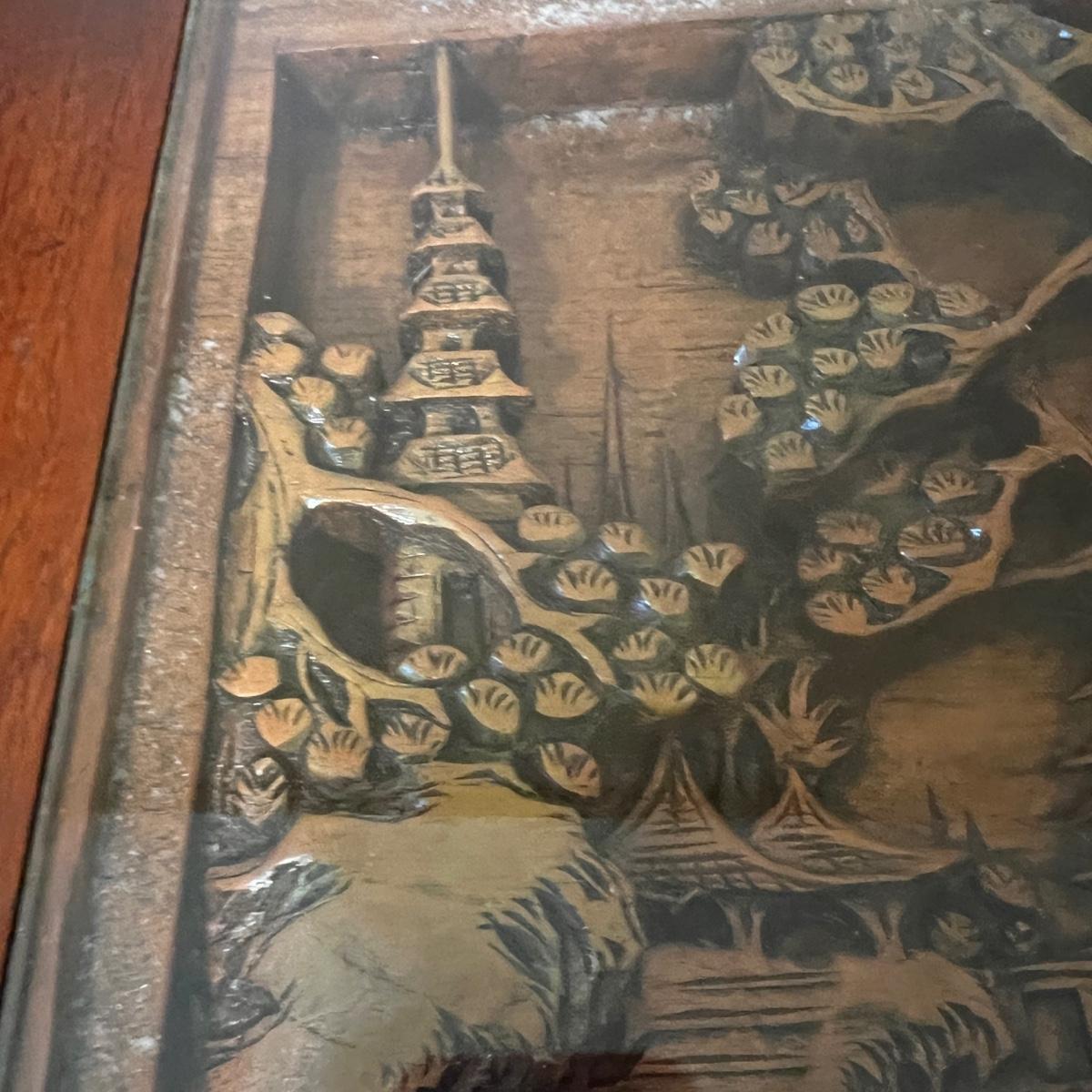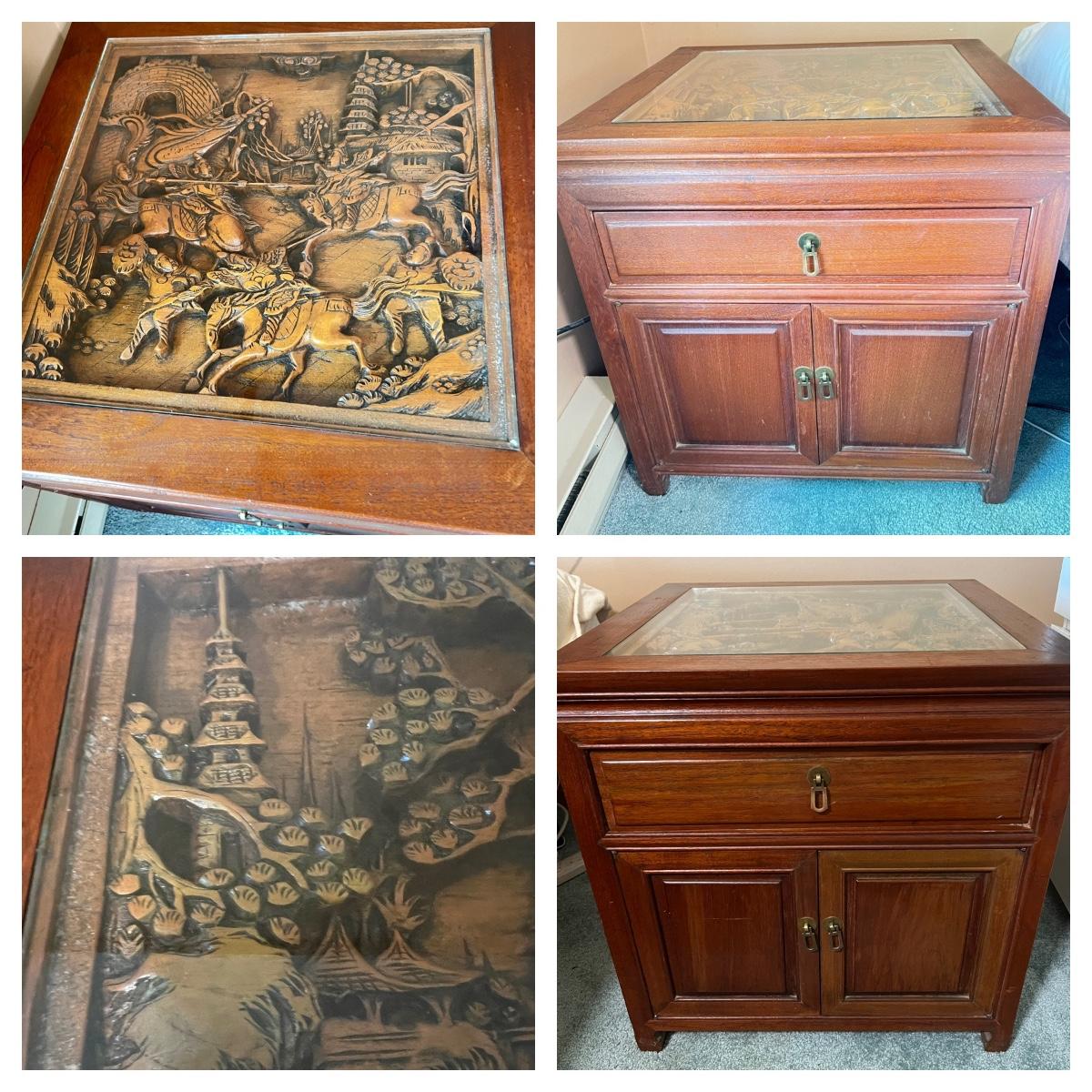 Asian themed carved wood top covered with glass. Has matching head board to bed or decorative wall art as well as chest see lots 544B & 544C offered separate.