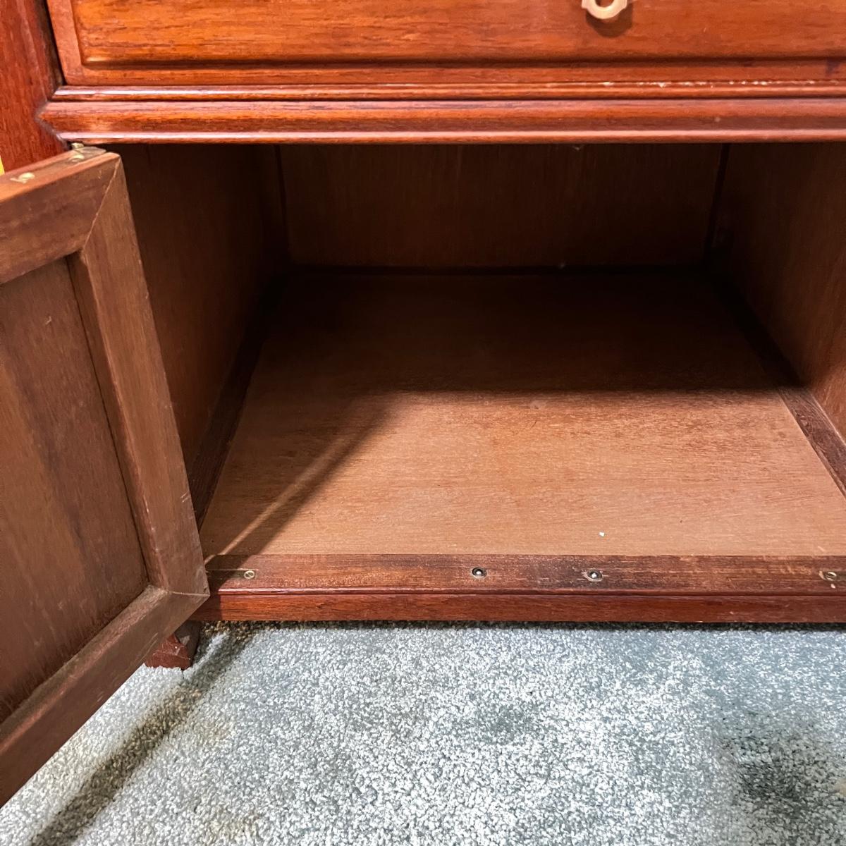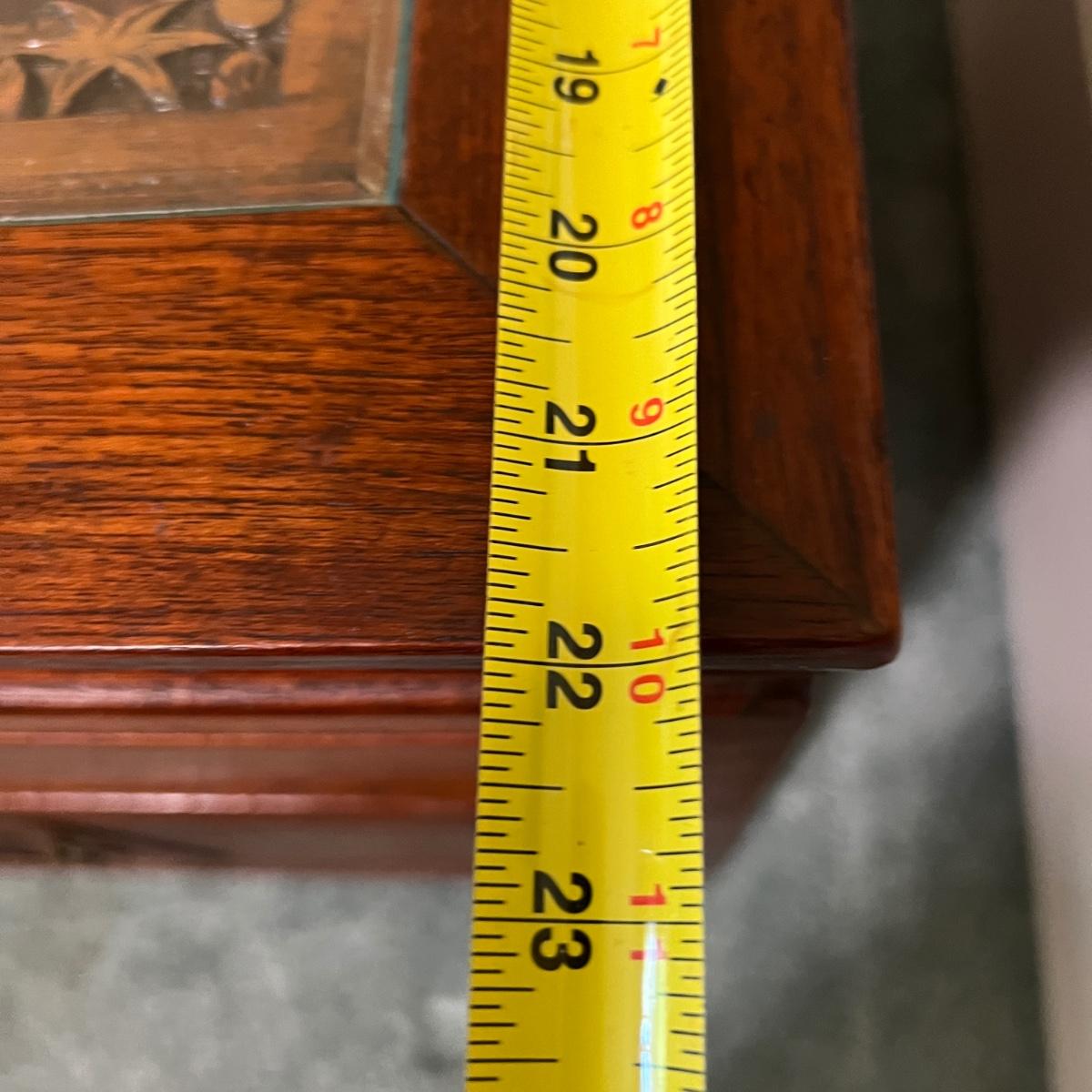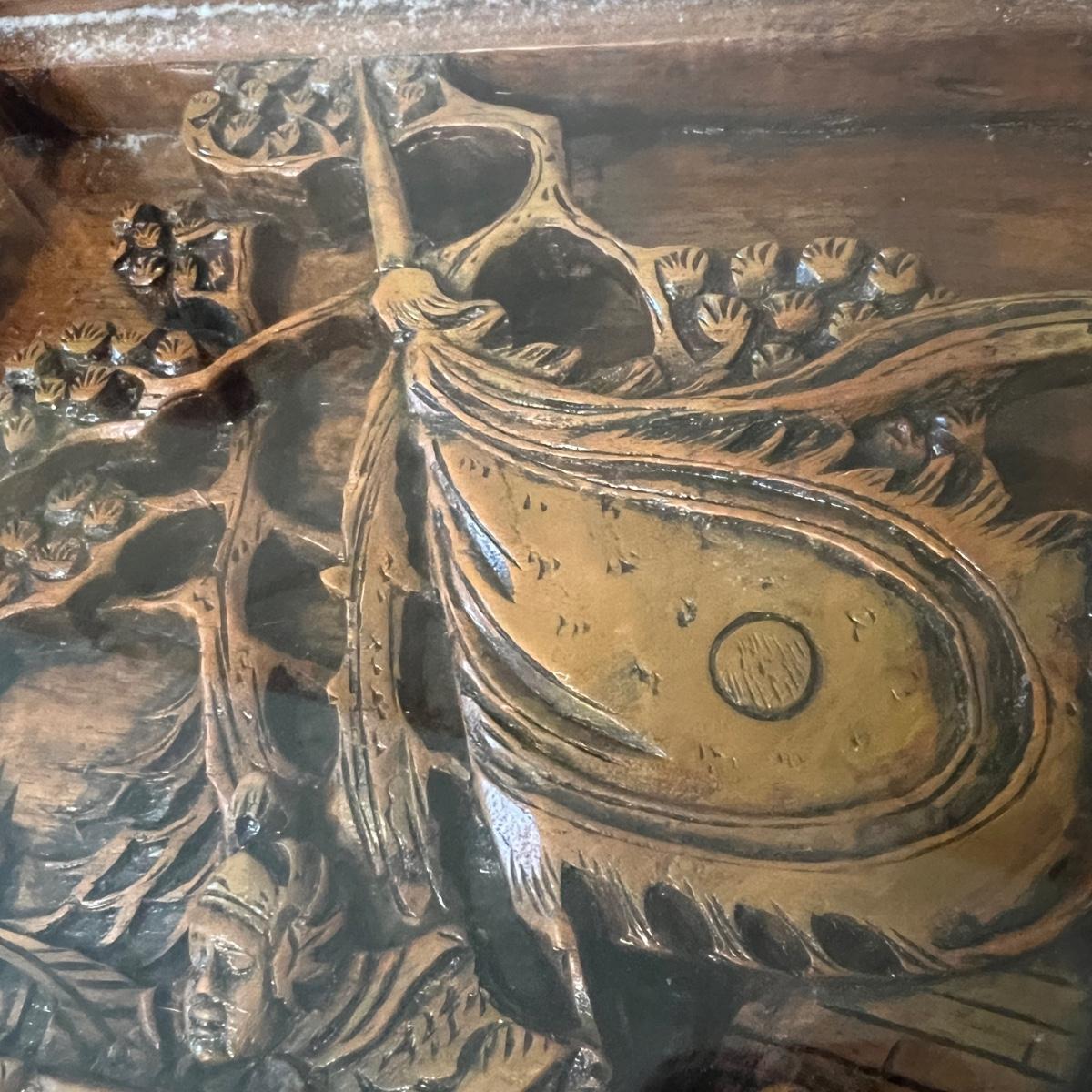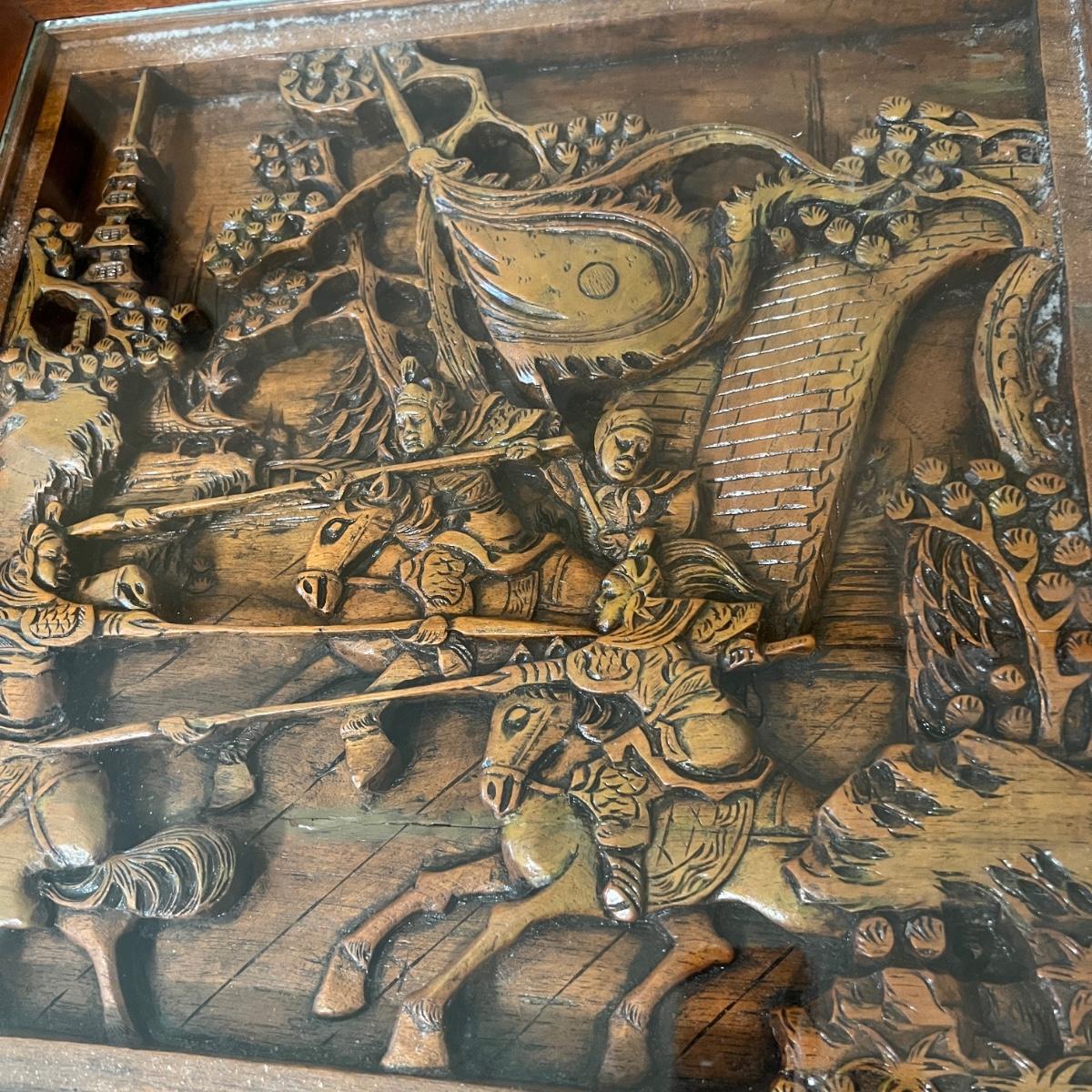 Asian themed carved wood top covered with glass. Has matching head board to bed or decorative wall art as well as chest see lots 544B & 544C offered separate.