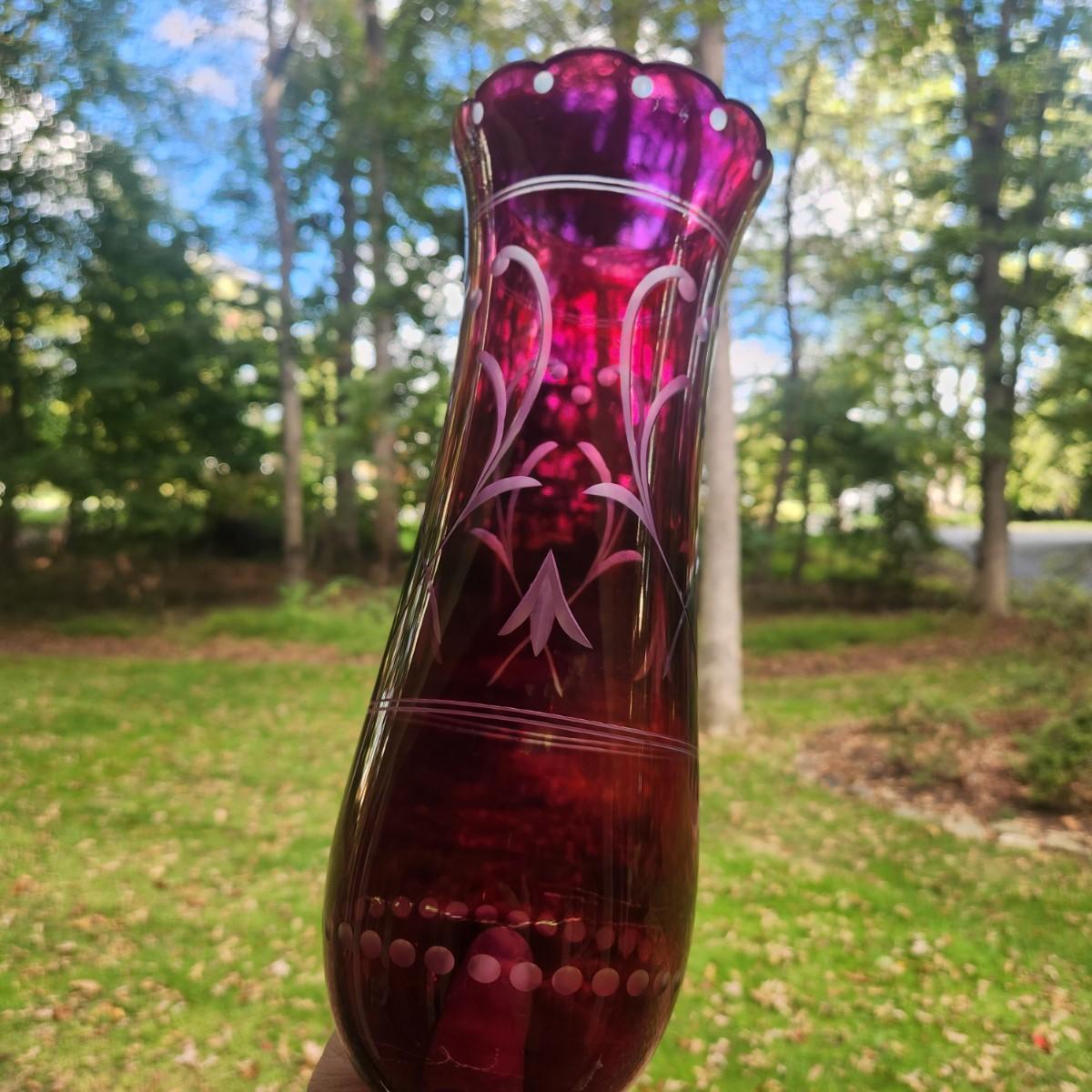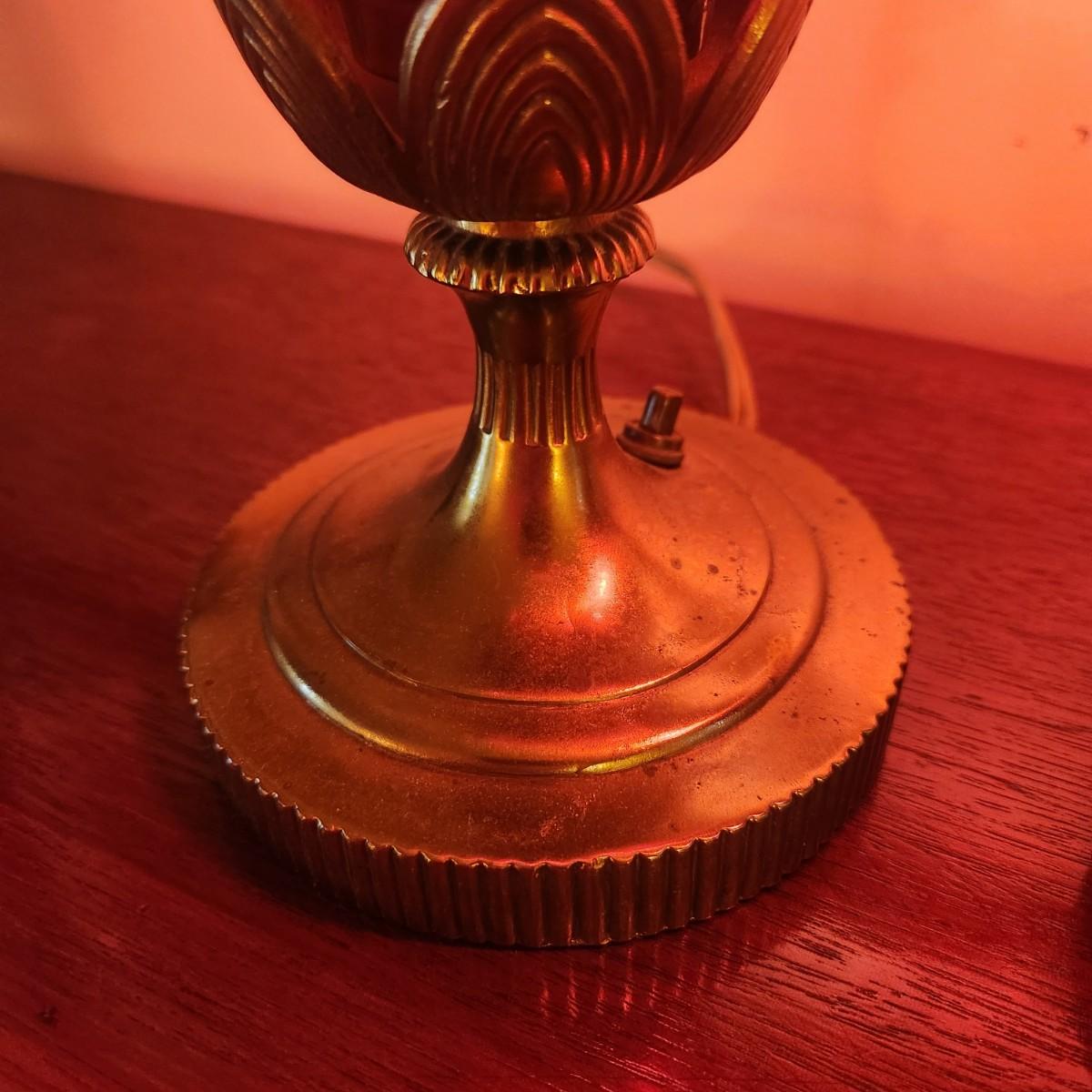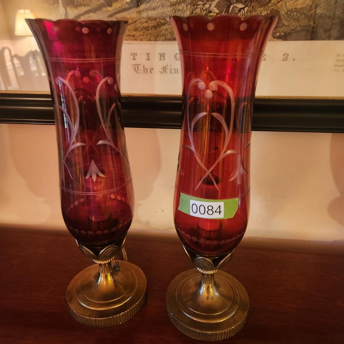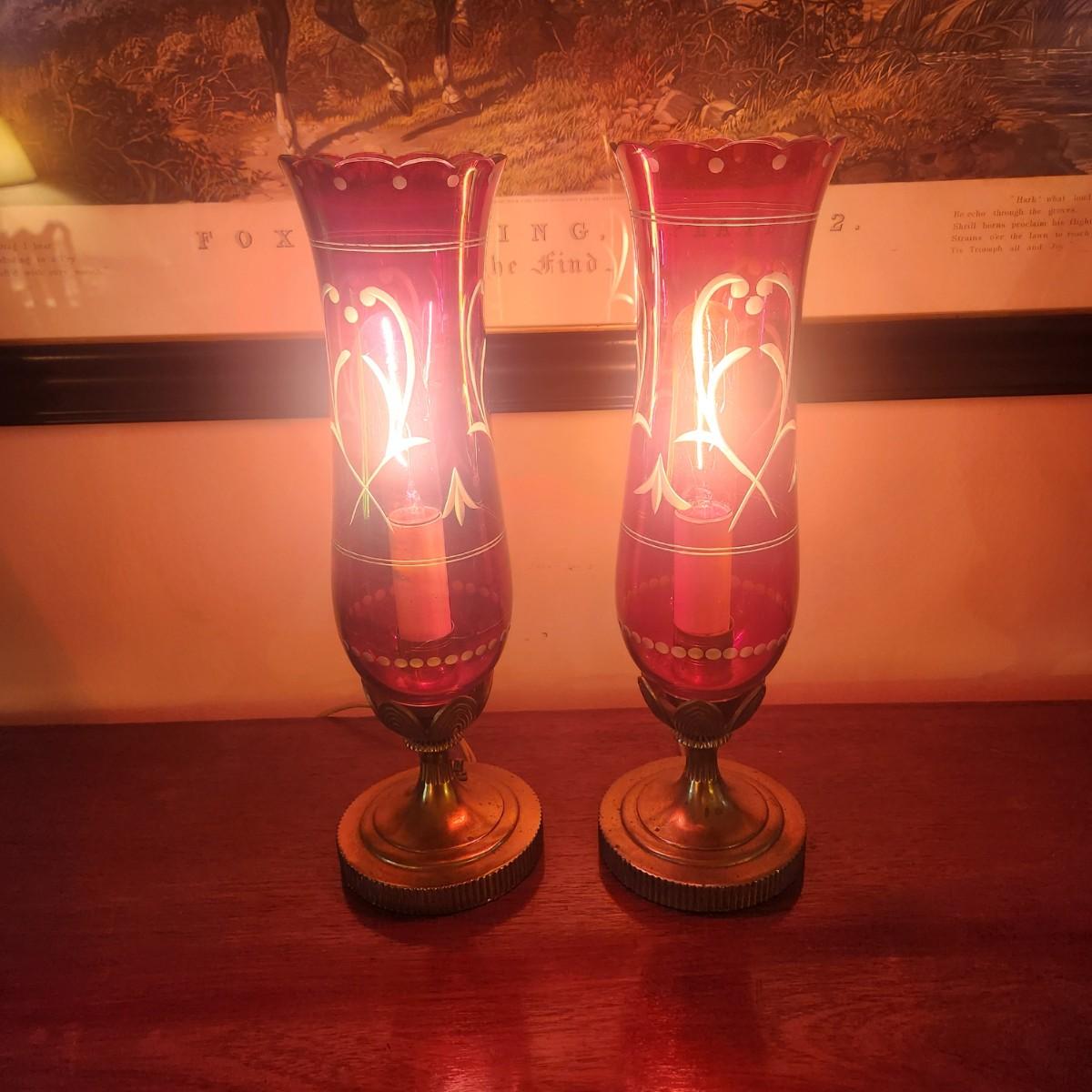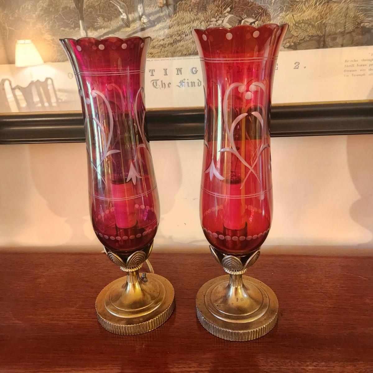 Pair Vintage Hurricane Cranberry Etched Table lamps