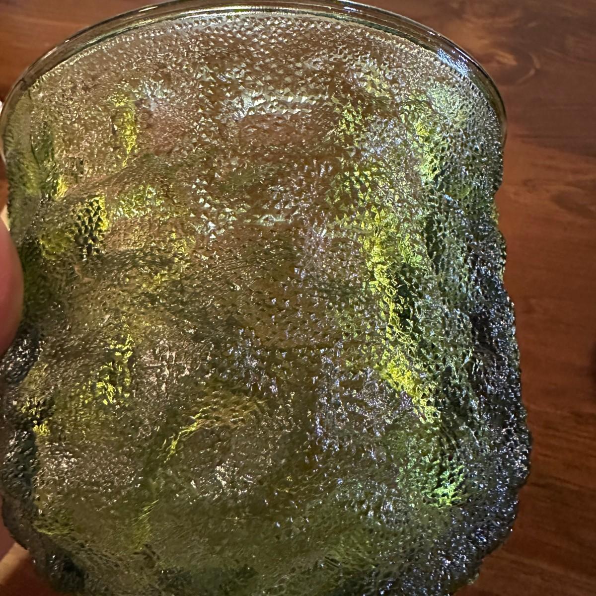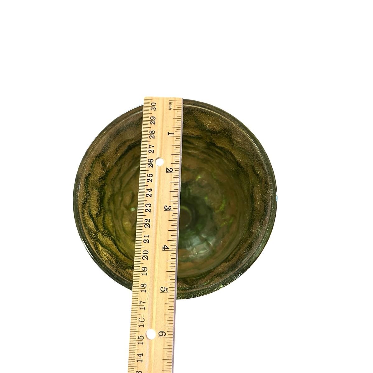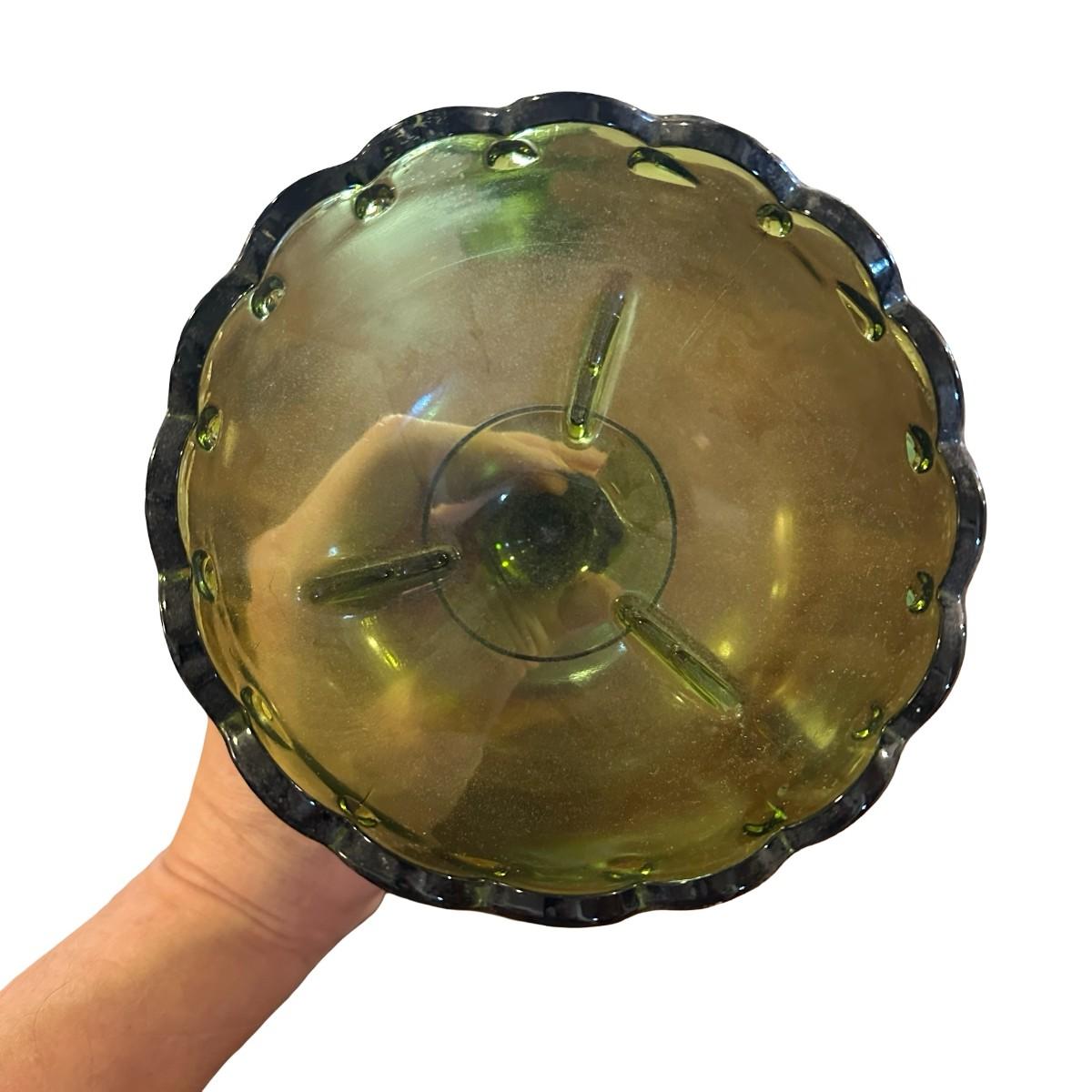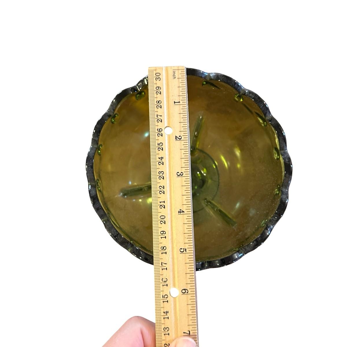 Pair Vintage Green Glass Pedestal Vases/Compote/Candy Dishes, Unmarked, no chips detected. Some surface scratches on scalloped piece. Measurements in photos.