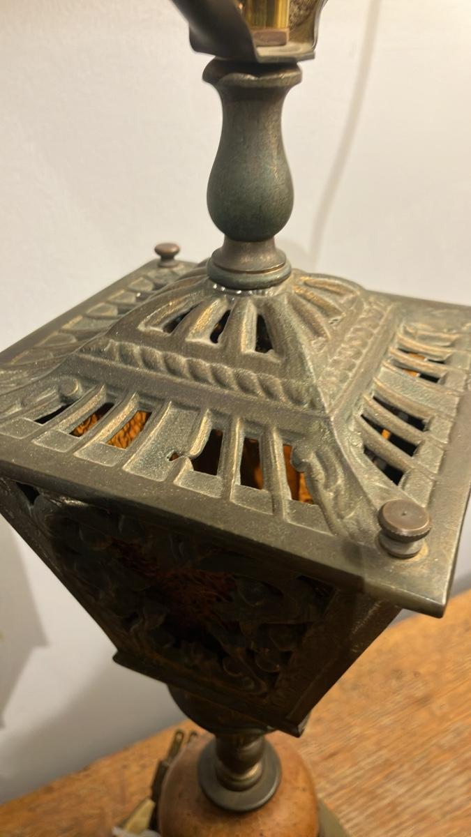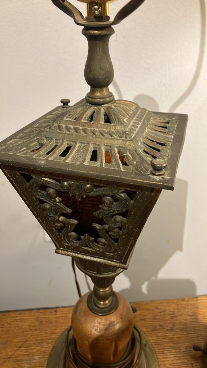 1960s–1970s lantern-style table lamps! These classic Hollywood Regency/MCM beauties feature intricate pierced metal filigree over original amber glass panels that create a stunning warm glow when lit (many have separate lighting for the lantern section — perfect as nightlights).