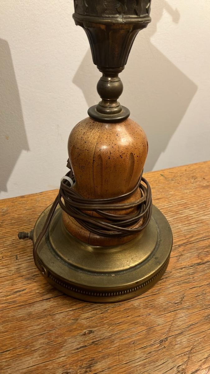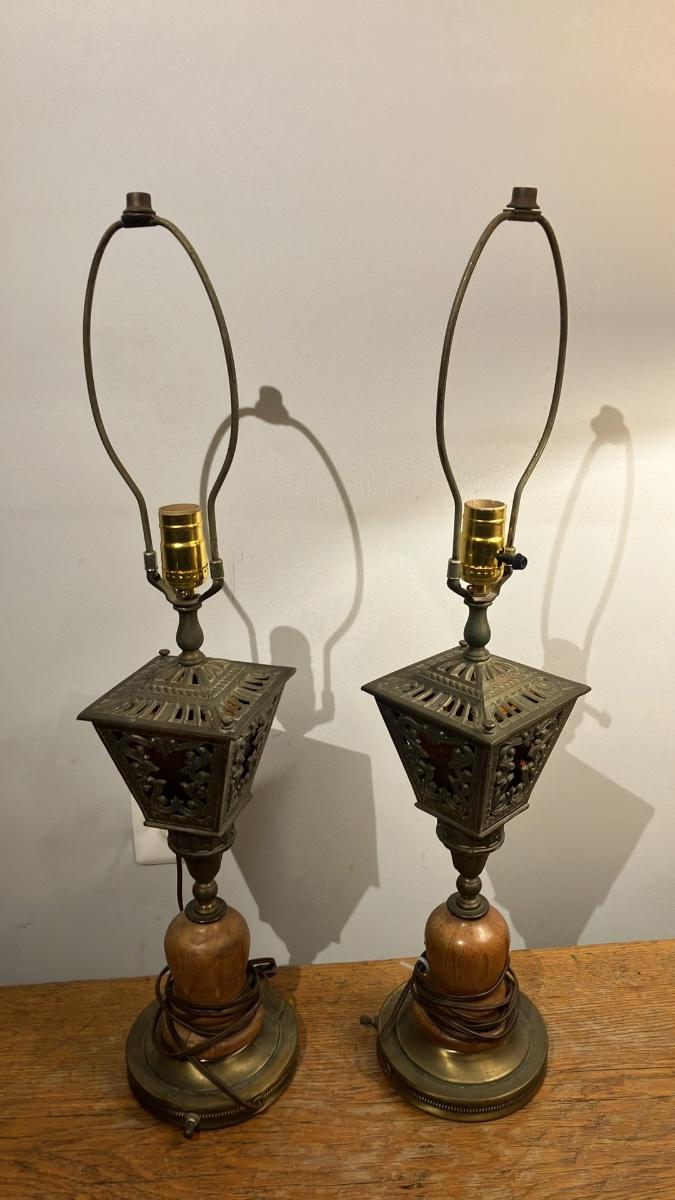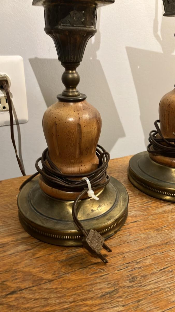 Heavy brass-toned metal with wood-accent bases and beautiful aged patina. Each stands approx. 29" tall to the harp. Professionally rewired and fully working — ready to use! No chips or damage to the glass; all original parts intact.