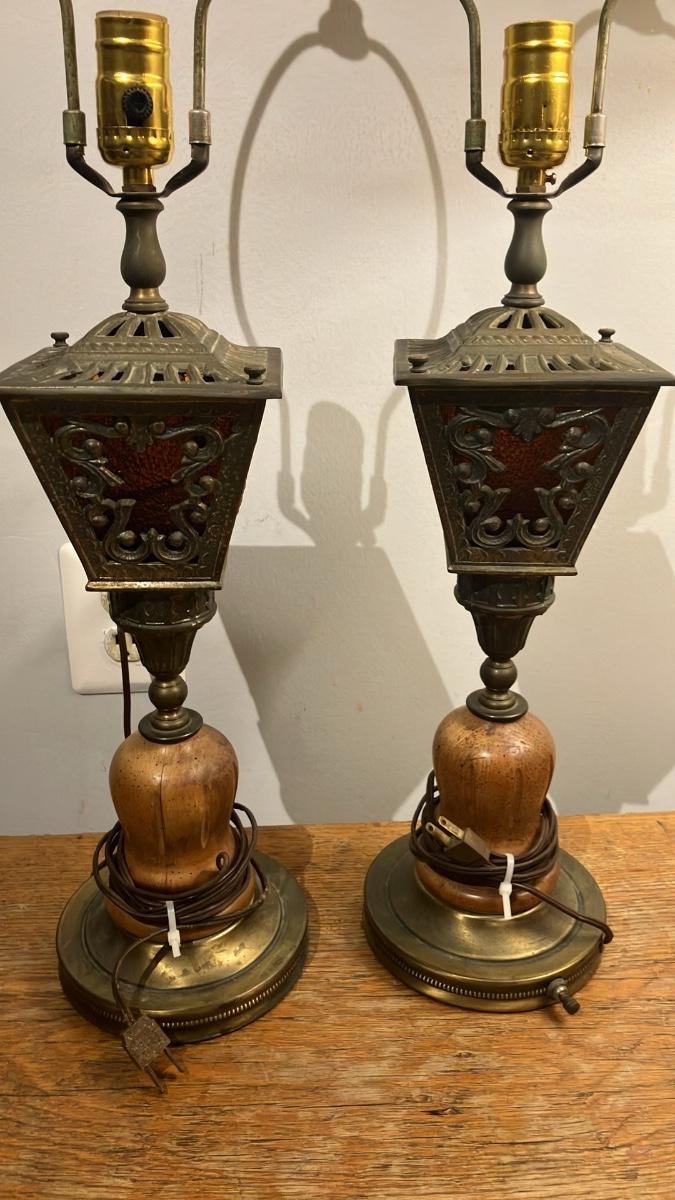 Pair Vintage Mid-Century Hollywood Regency Amber Glass Lantern Table Lamps - 29" Tall