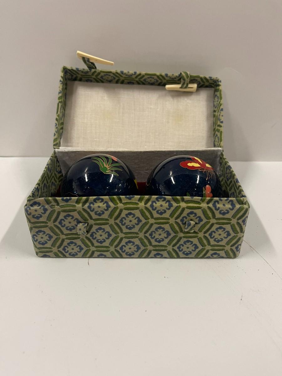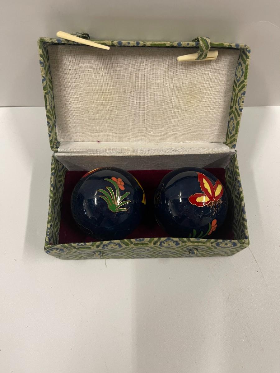 Pair Vintage Oriental Enamel Chiming / Medicine Balls. Comes in original box. There is some damage to the enamel on the underside of each of the balls. Approx 2" diameter.