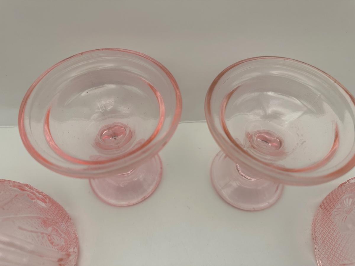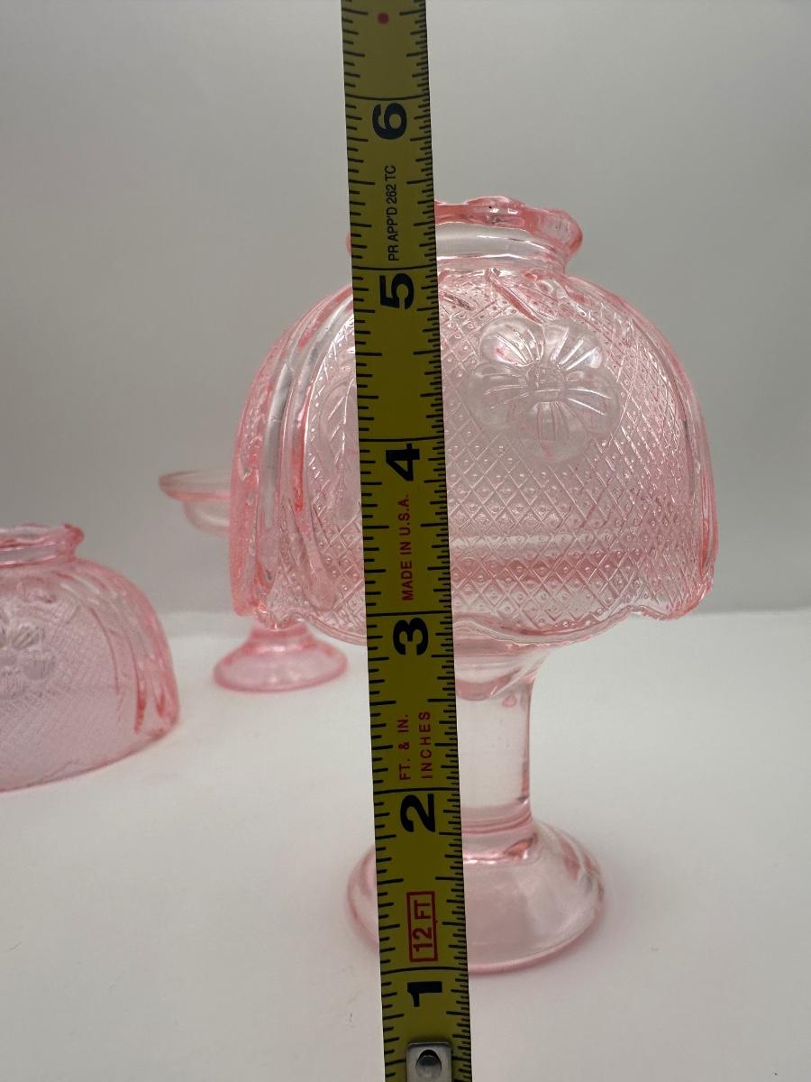 Pair of vintage pink pressed glass fairy lamps with matching pedestal bases and textured domed shades. Two-piece construction. Approx. 5.5–6” tall. No maker’s mark observed.