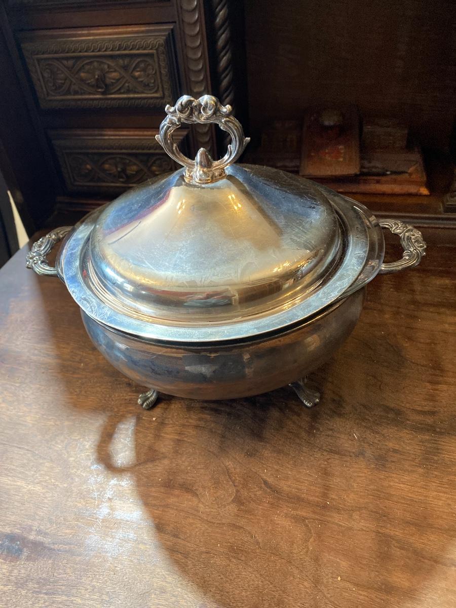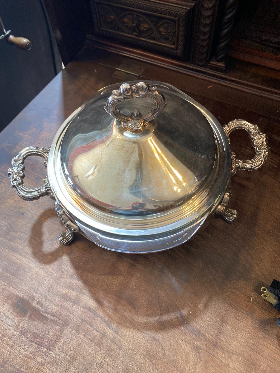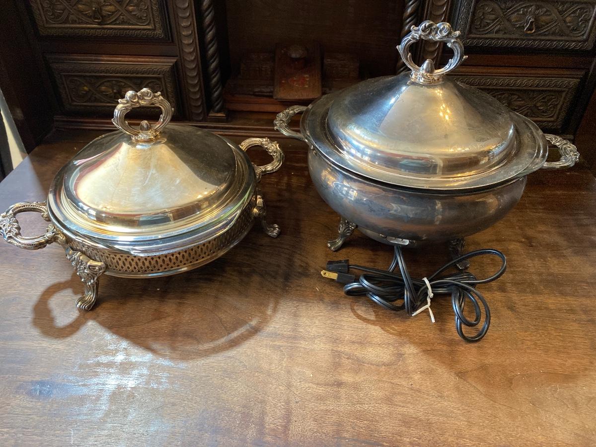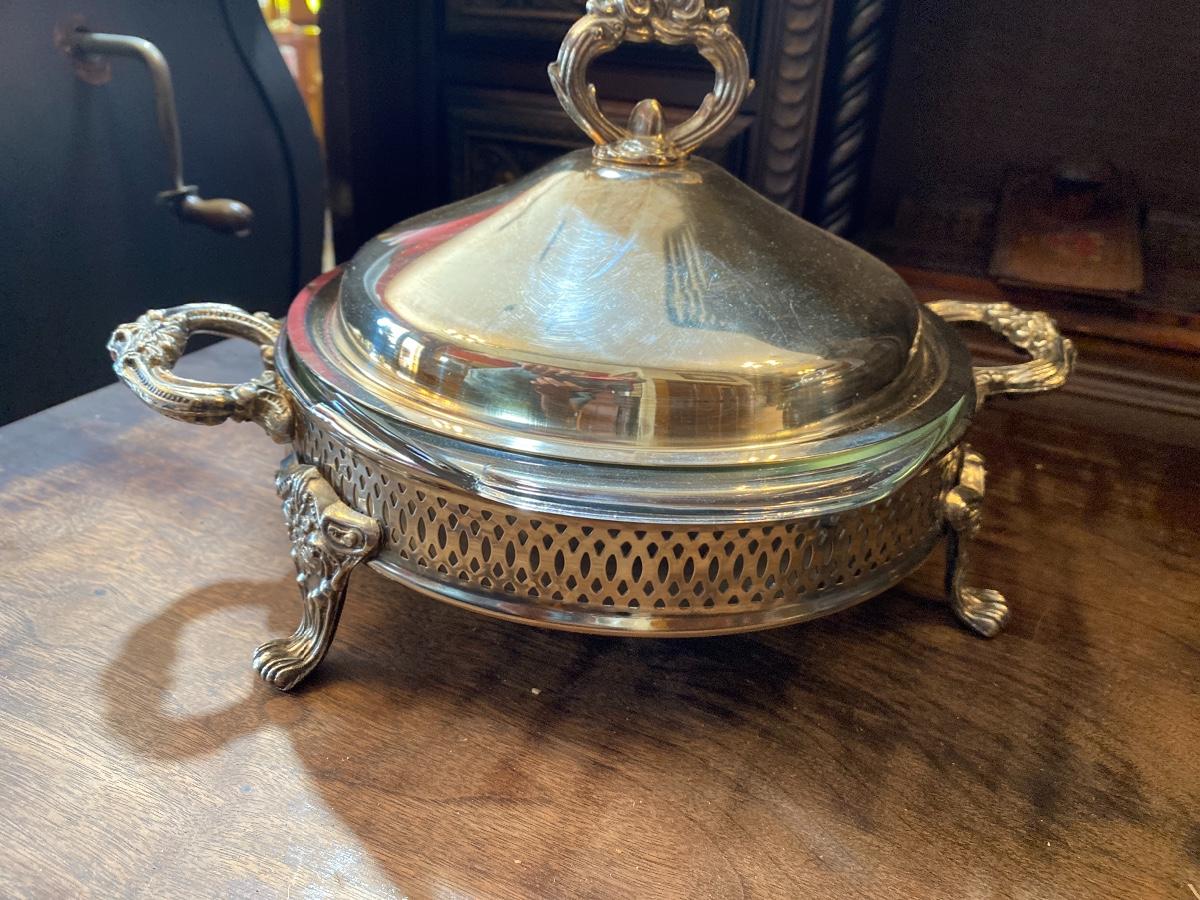 Pair Vintage Pyrex Silver Plate Chafing Serving Dishes