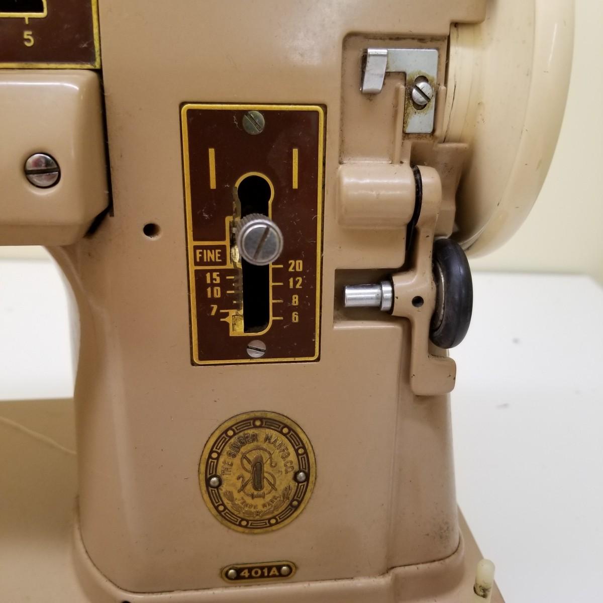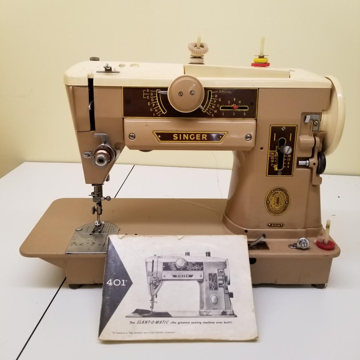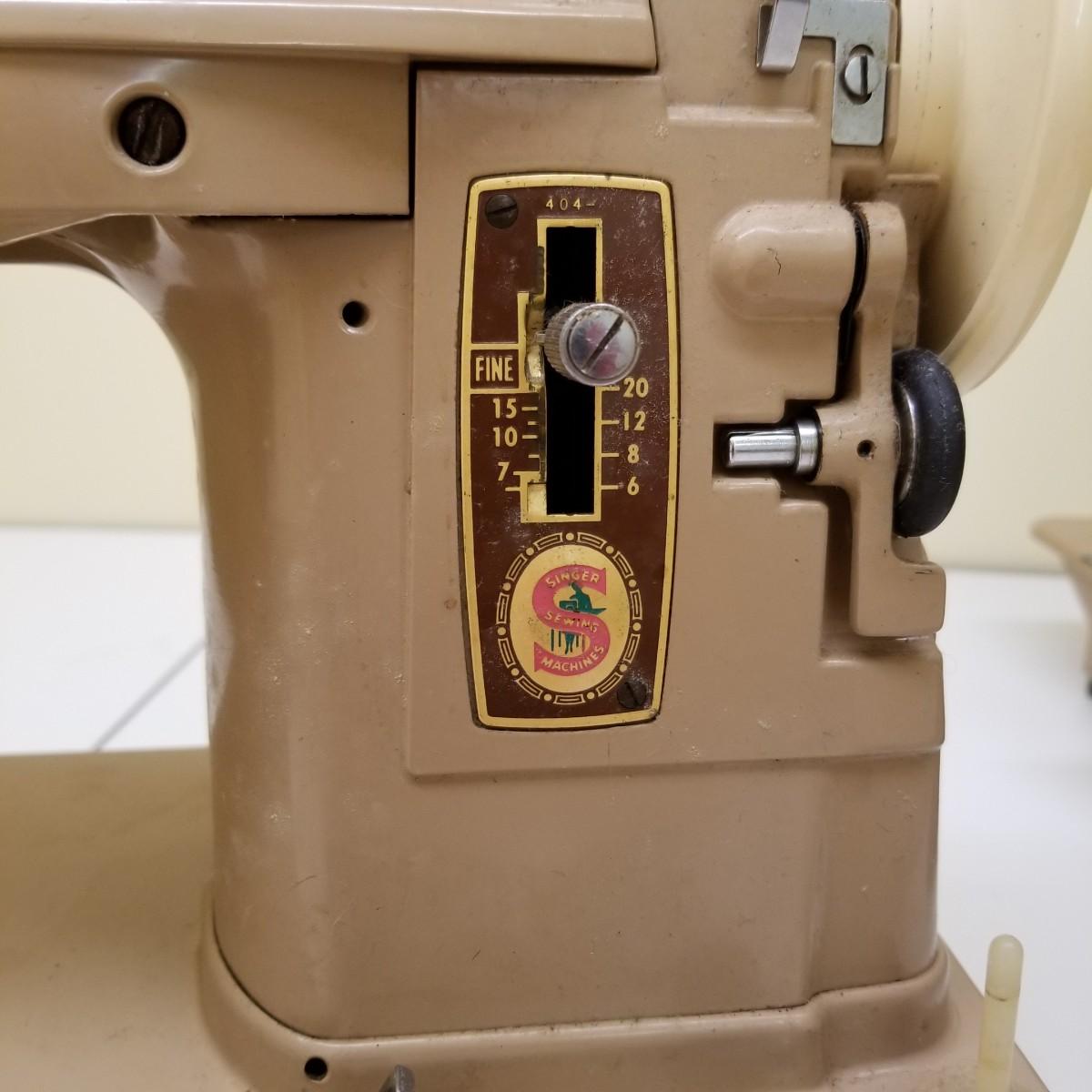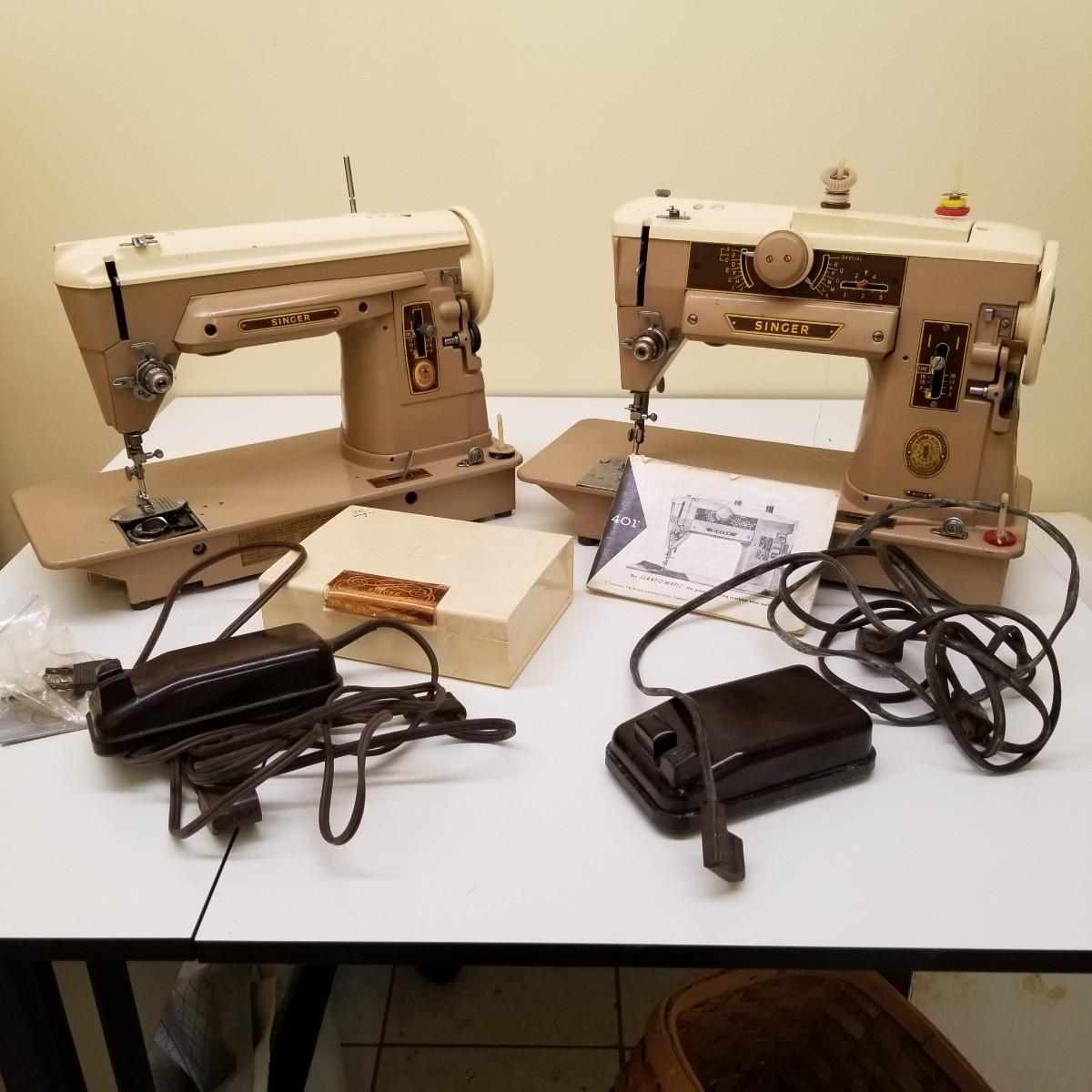 A pair of vintage Singers from their 400 series line. Both of these machines hail to late 50's date of manufacture. The 404 model is a little more basic while the 401A has the ability to use two needles and specialty discs to do pattern sewing and basic embroidery. Both machines power on but do not turn, will need cleaning and oiling. Footpedals and an accessory box of discs and parts are included.
