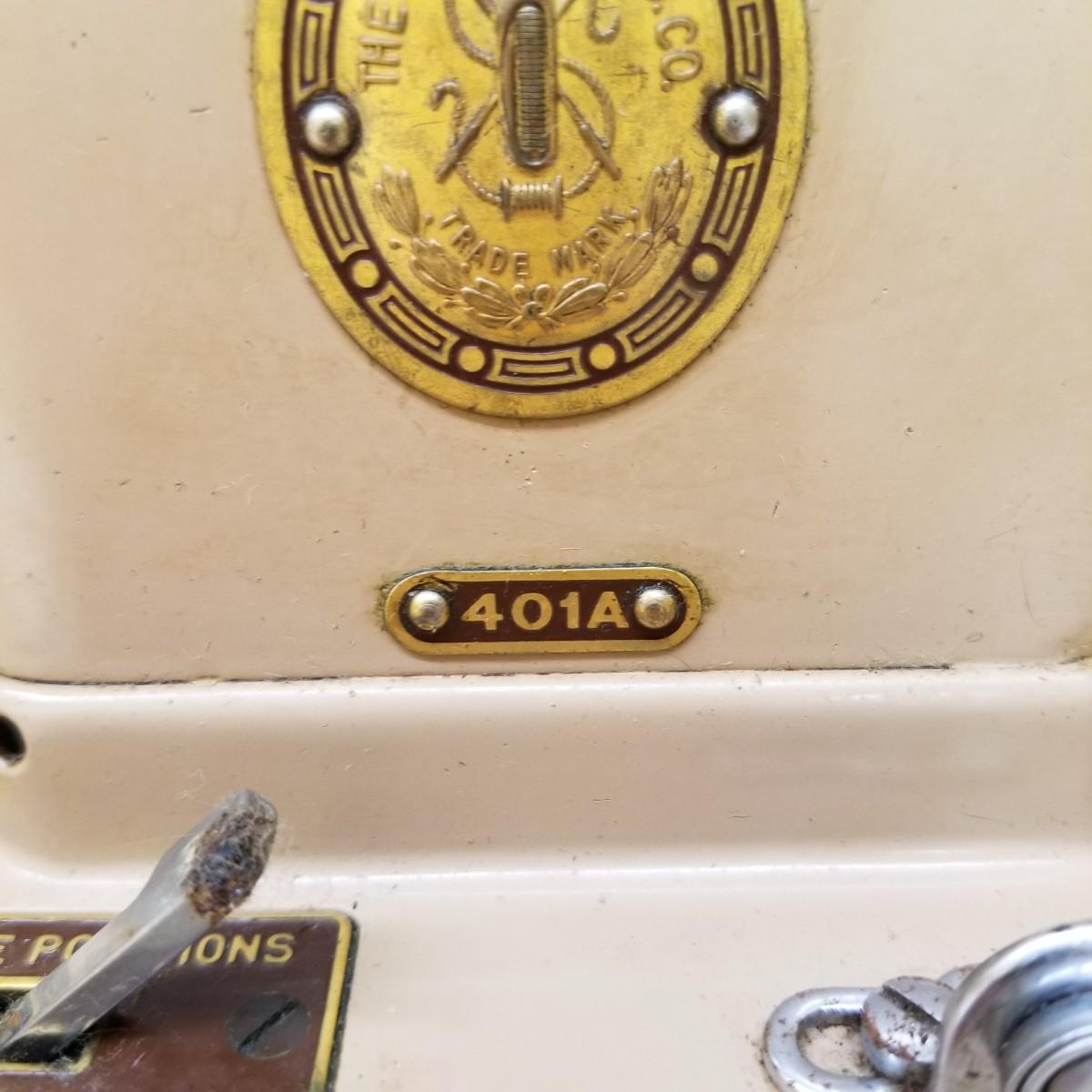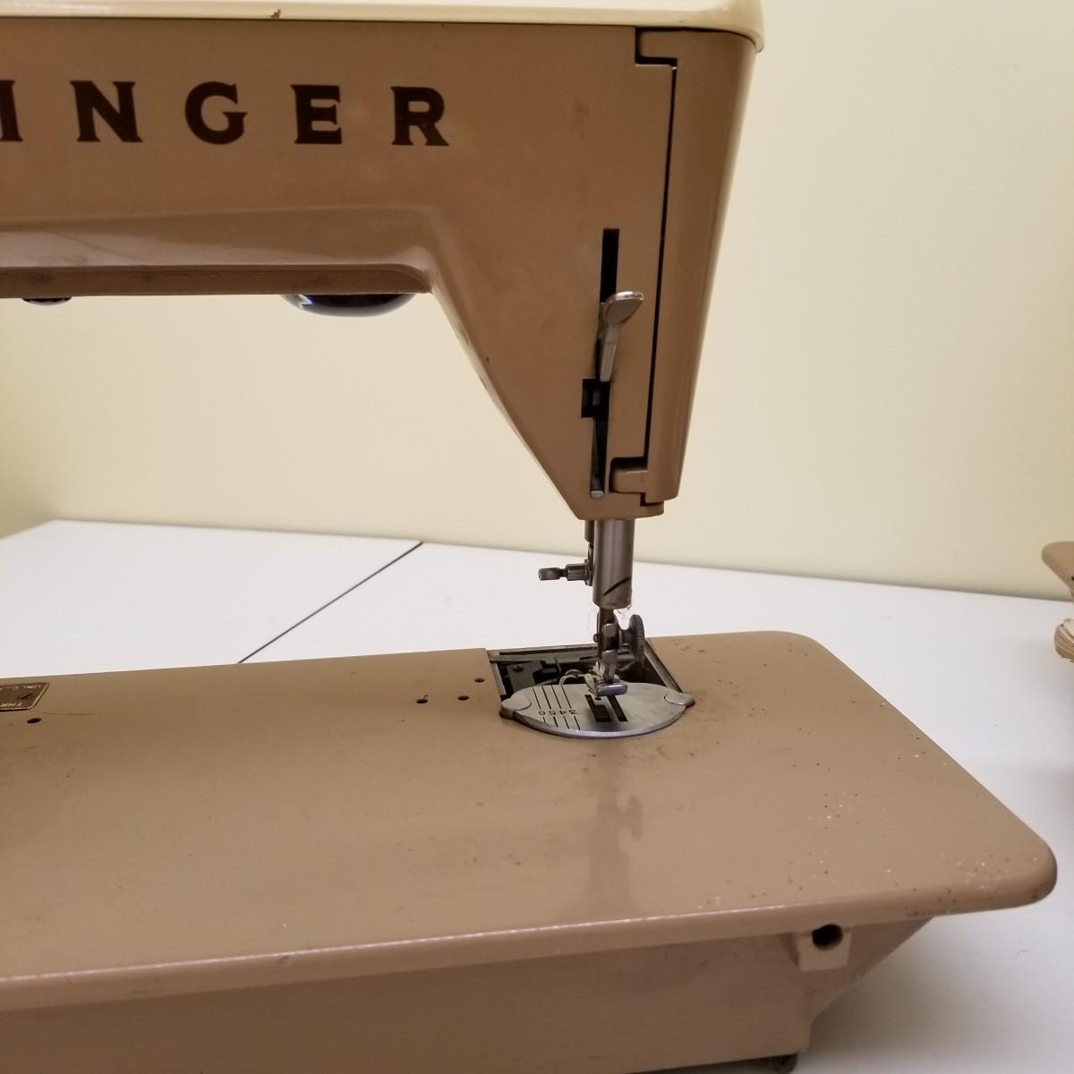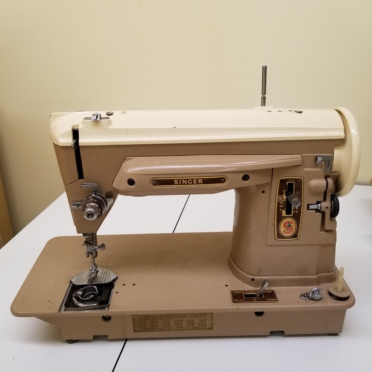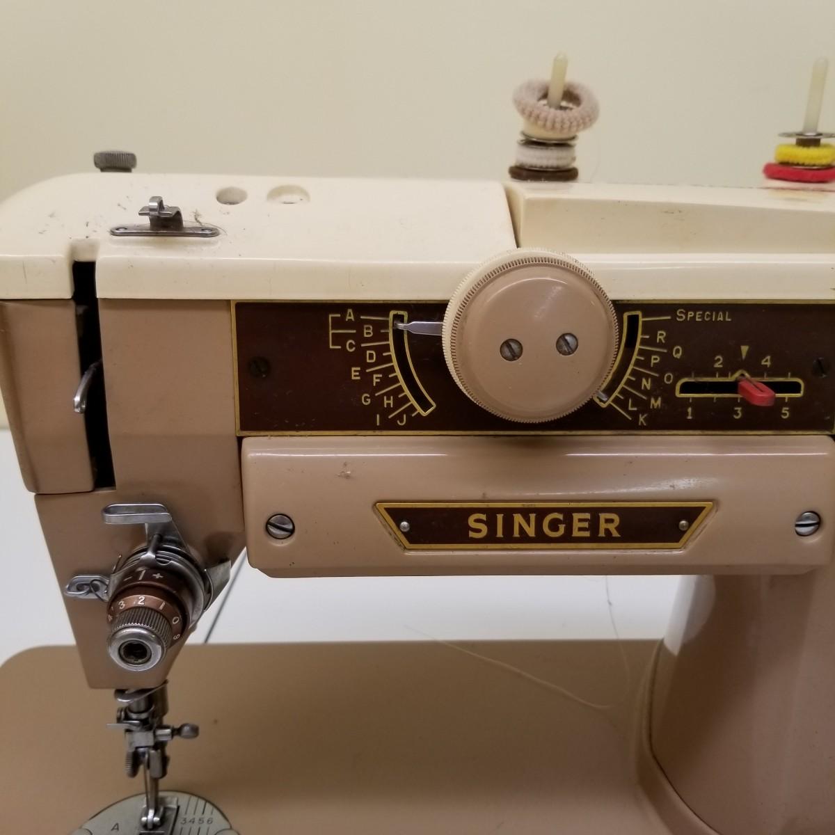 A pair of vintage Singers from their 400 series line. Both of these machines hail to late 50's date of manufacture. The 404 model is a little more basic while the 401A has the ability to use two needles and specialty discs to do pattern sewing and basic embroidery. Both machines power on but do not turn, will need cleaning and oiling. Footpedals and an accessory box of discs and parts are included.